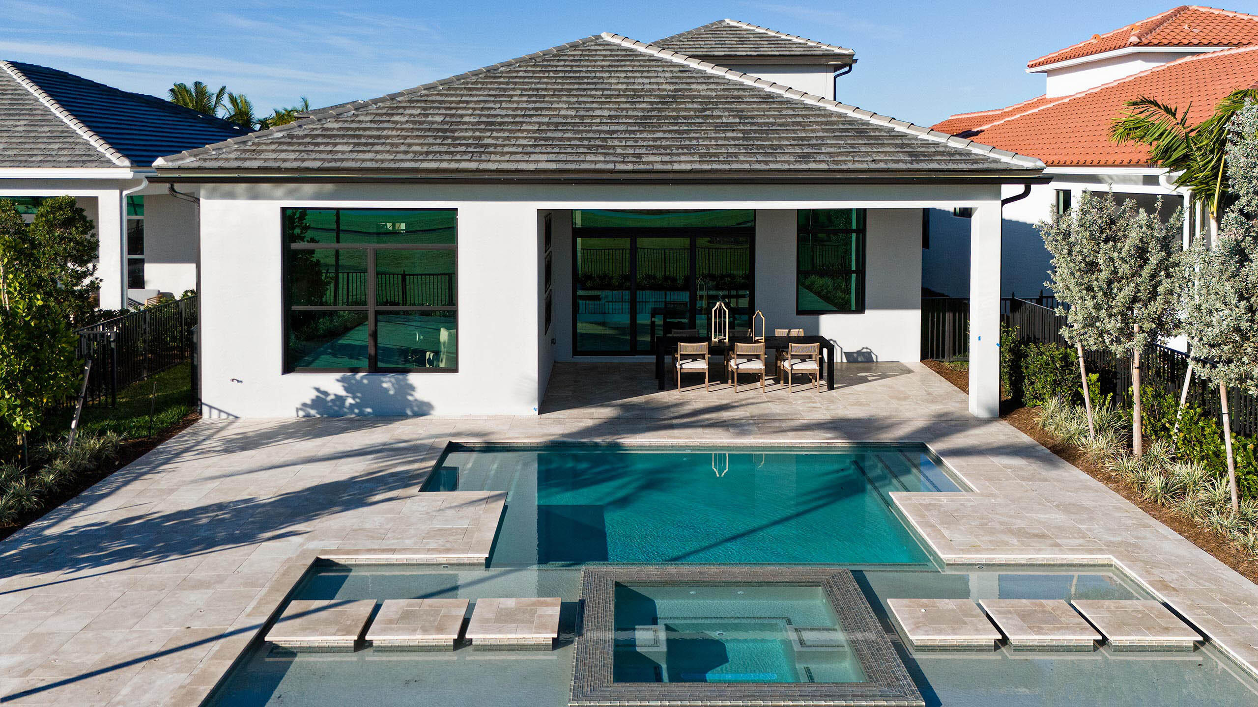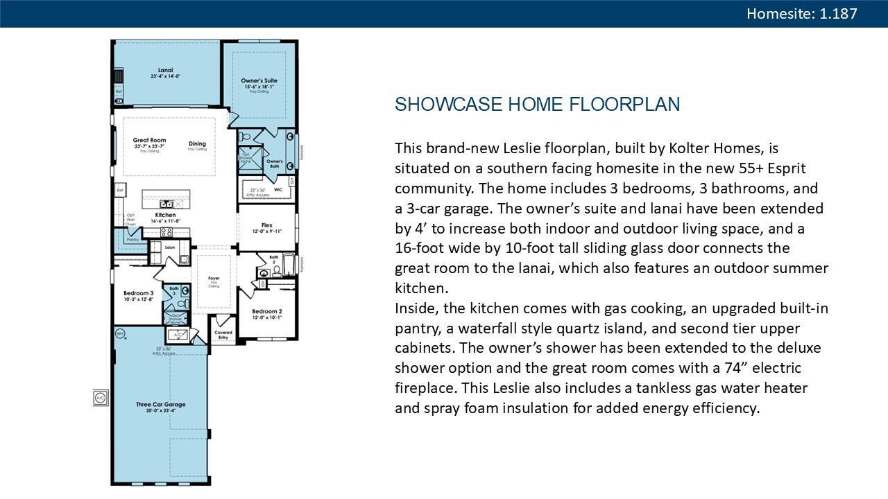 **Under Construction** This brand-new Leslie floorplan, built by Kolter Homes, is situated on a southern facing homesite in the new 55+ Esprit community. The home includes 3 bedrooms, 3 bathrooms, and a 3-car garage. The owner's suite and lanai have been extended by 4' to increase both indoor and outdoor living space, and a 16-foot wide by 10-foot-tall sliding glass door connects the great room to the lanai, which also features an outdoor summer kitchen. Inside, the kitchen comes with gas cooking, an upgraded built-in pantry, a waterfall style quartz island, and second tier upper cabinets. The owner's shower has been extended to the deluxe shower option, and the great room comes with a 74'' electric fireplace.This Leslie also includes a tankless gas water heater and spray foam insulation for added energy efficiency.