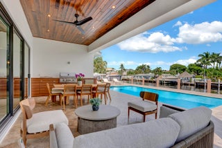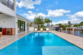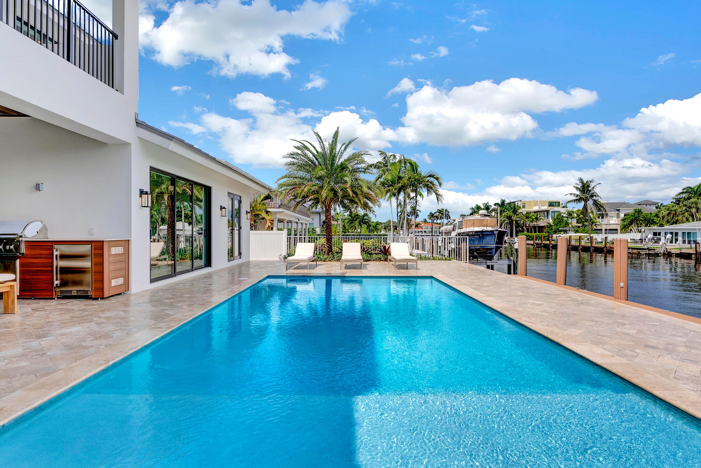 3205 Beacon Street blends timeless luxury with refined modern detail. Tucked away in the prestigious Hillsboro Shores community, the home sits on a wide, deep-water canal just minutes from the Hillsboro Inlet and Atlantic Ocean, north of the 14th Street drawbridge. With private beach access only minutes away, the home curates a South Florida lifestyle defined by elegance, leisure, and effortless connection to both land and water. Step inside and be immediately drawn to the open-concept design that frames sweeping waterfront views from the foyer. Soaring ceilings, natural light, and thoughtfully crafted interiors by Jessie DeAngelo Studio create a warm sophistication throughout its 5 bedrooms, 4.5 bathrooms, and 3,858 square feet of living space.The gourmet kitchen invites both gathering and culinary exploration. A large free-standing island anchors the space, complimented by premium stainless steel appliances by Jenn-Air, natural gas cooking, and exquisite millwork. Floor-to-ceiling windows illuminate the adjoining dining room and family rooms defining open-concept living. The first floor offers versatile living, including an en-suite guest room with private outdoor access to the heated saltwater pool and chic wet bar complete with sink and beverage refrigerator. Two additional bedrooms on the east wing with a shared bathroom that can easily be converted to en-suites. Ascend the light oak staircaseor take the elevatorto the second floor, where a spacious loft with dedicated office space leads to the serene primary suite. Here, a private balcony overlooks the water, offering the perfect setting for morning coffee or evening reflection. Dual custom walk-in closets provide artful organization, while the spa-inspired bath features a soaking tub, expansive rain shower, and dual vanities with a dedicated makeup vanity that redefine daily indulgence. Two sets of sliding glass doors open onto the resort-style elevated outdoor living with an oversized covered patio finished with custom ceiling paneling and recessed lighting. A heated saltwater pool with tanning ledge and travertine decking coupled with the summer kitchen with built-in grill and refrigeration perfect for al fresco dining creating a space defined by refined luxury. The property boasts 83 feet of water frontage and a newly constructed 73 foot PVC dock with electric and water guaranteeing seamless access to the Intracoastal waterway perfect for boating enthusiasts. Practical luxury is found at every turn: a 2-car epoxy garage with hurricane-rated doors, a circular driveway with room for six additional vehicles, a whole-home generator, motorized shades, tankless water heater, custom storage throughout, and security cameras for peace of mind. Perfectly positioned near fine dining, pristine beaches, and private aviation, 3205 Beacon Street is more than a homeit's a lifestyle. Why wait to own your slice of paradise?