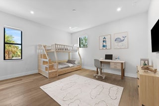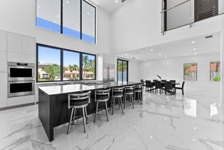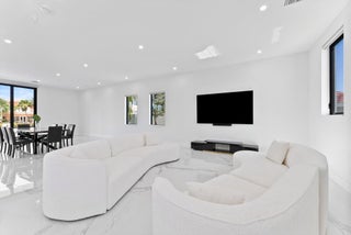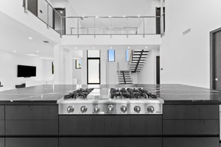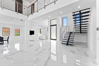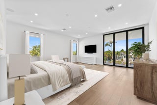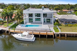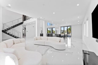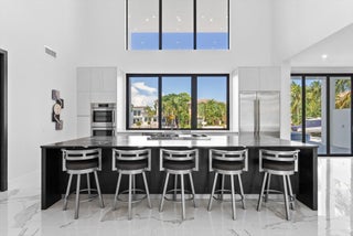 Impeccably designed and move-in ready, this sunlit two-story new construction offers elevated living with soaring ceilings, 4'x4' designer tiles, and motorized shades on the main level. The chef's kitchen impresses with a dramatic black double-slab island, gas cooktop, and top-tier appliances. Upstairs, rich hardwood floors lead to a luxurious primary suite featuring a private sitting room, spa-inspired bath, oversized walk-in closet, and a covered balcony. All bedrooms are ensuite with walk-in closets; one includes its own balcony with tranquil water views. Outdoor features include a covered patio, resort-style pool/spa, hookups for a summer kitchen, and an 80' deepwater dock with full electric--no fixed bridges. Full impact glass & generator-ready. The epitome of waterfront luxury living