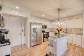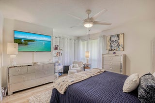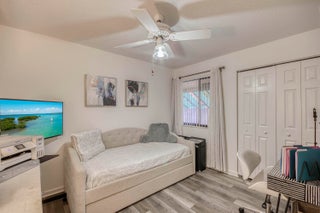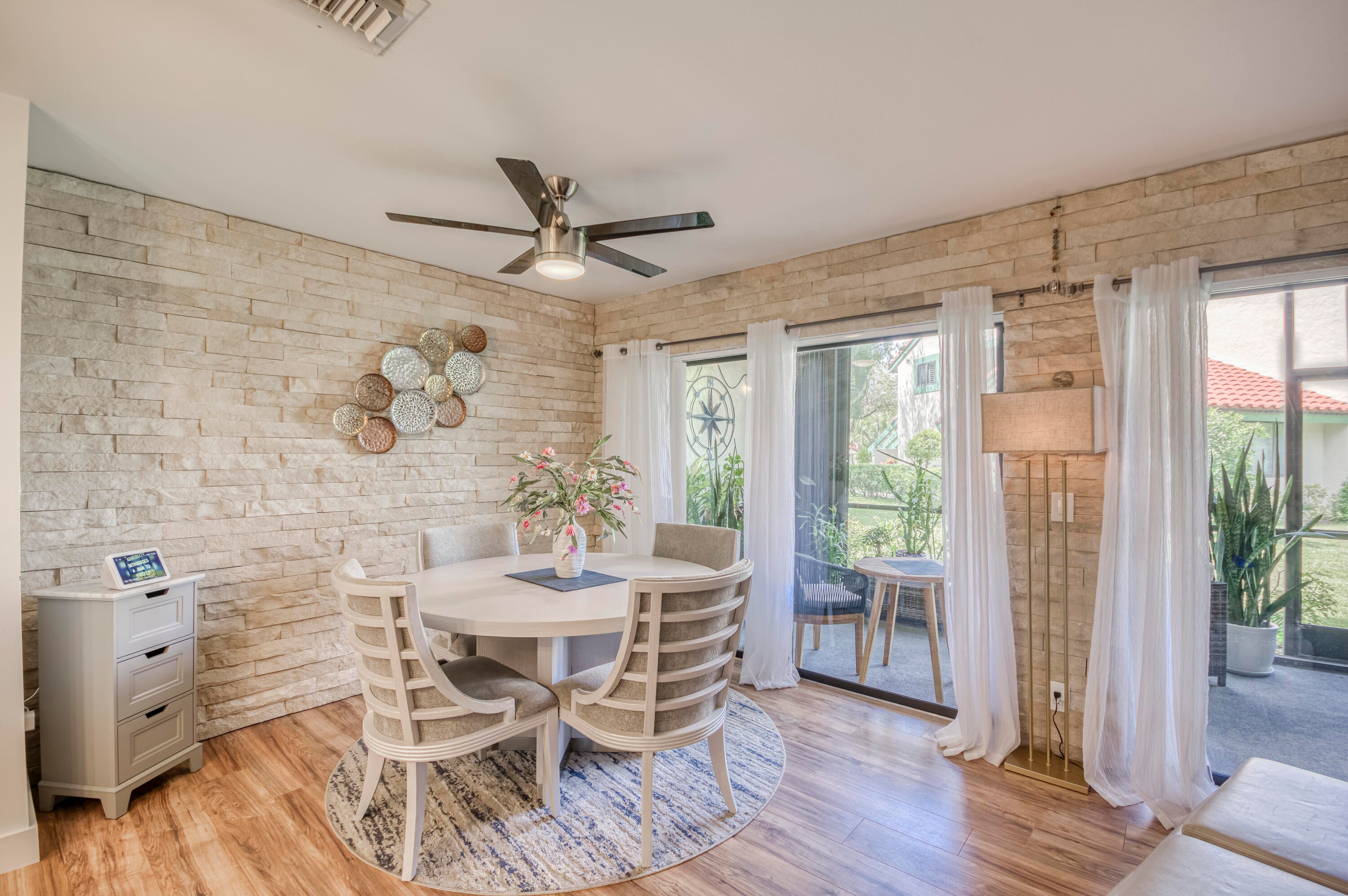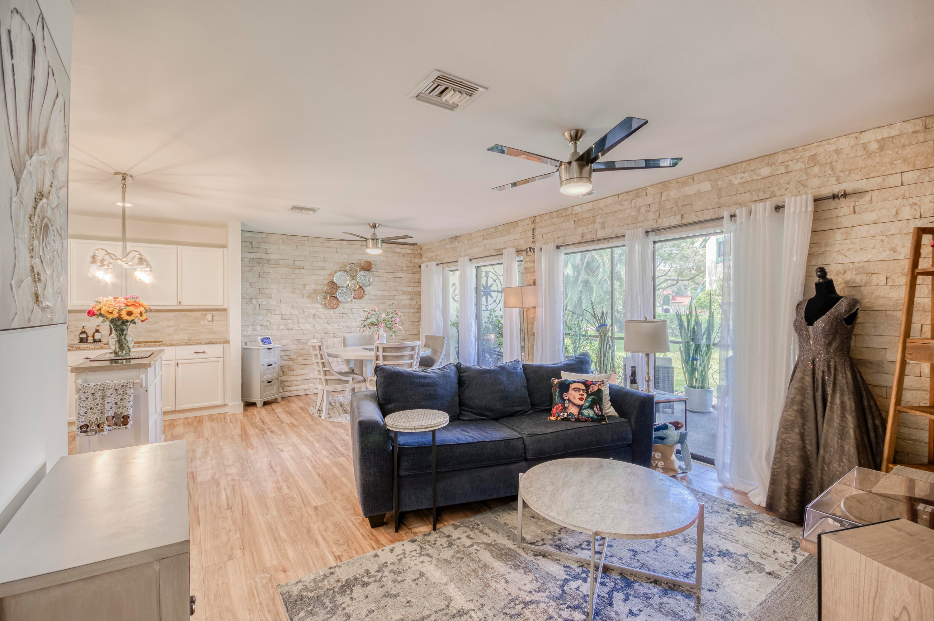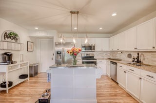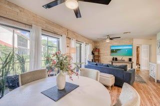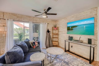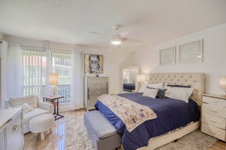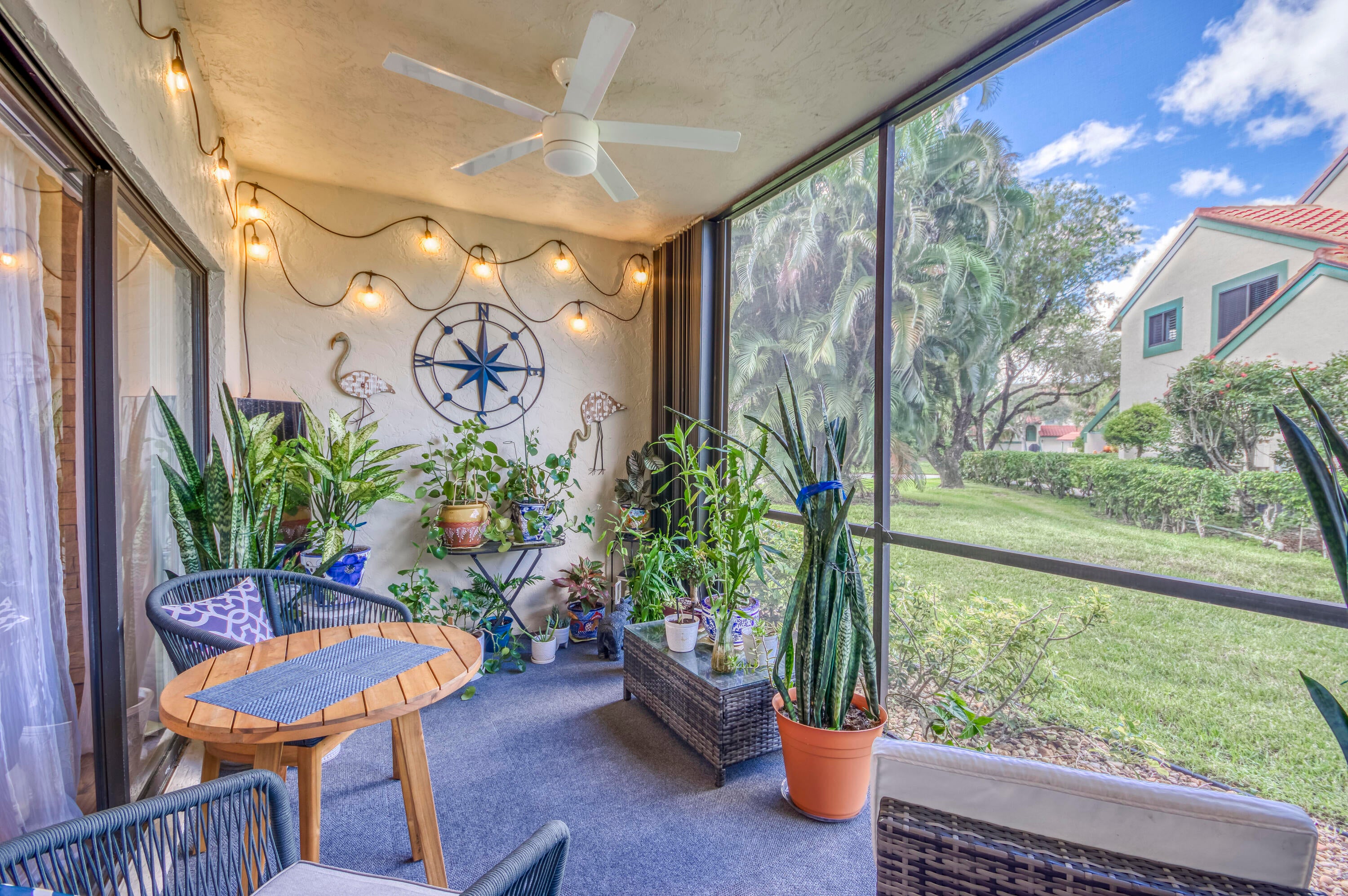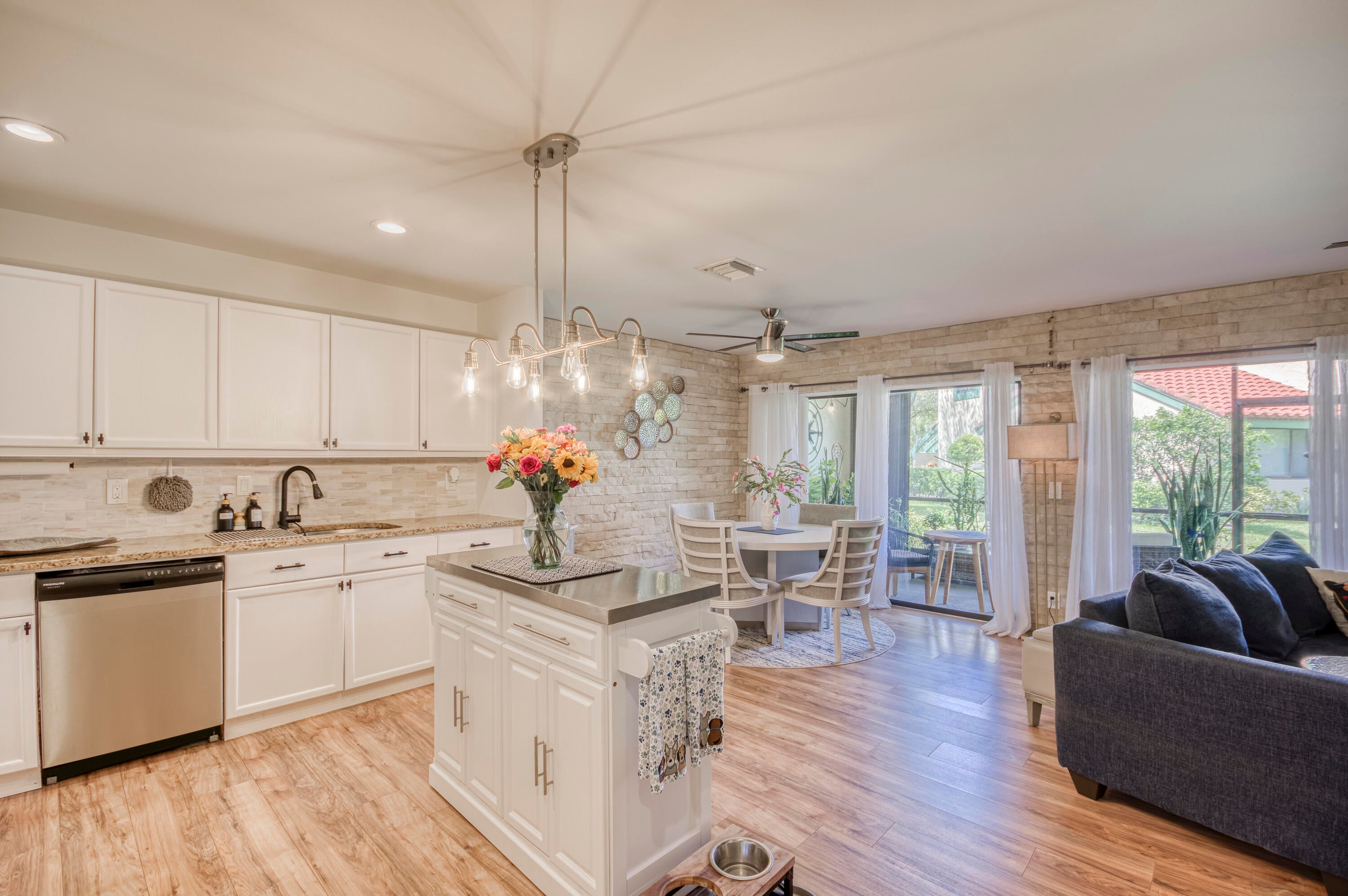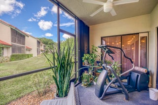 Annual lease available in the Lexington Green neighborhood of PGA National. This 2-bedroom, 2-bath condo offers a one-car garage and screened patio with garden views. Interior features include light oak laminate flooring, an open floor plan with stone tile accents, and sliding glass doors that bring in natural light. The updated kitchen has white cabinetry, granite countertops, subway tile backsplash, and stainless steel appliances. The spacious primary suite includes ample closets, while the guest bedroom offers flex use as an office or bedroom. Bathrooms are finished with stone-look tile, white cabinetry, and quartz countertops. Offered unfurnished with a 12-month lease term.