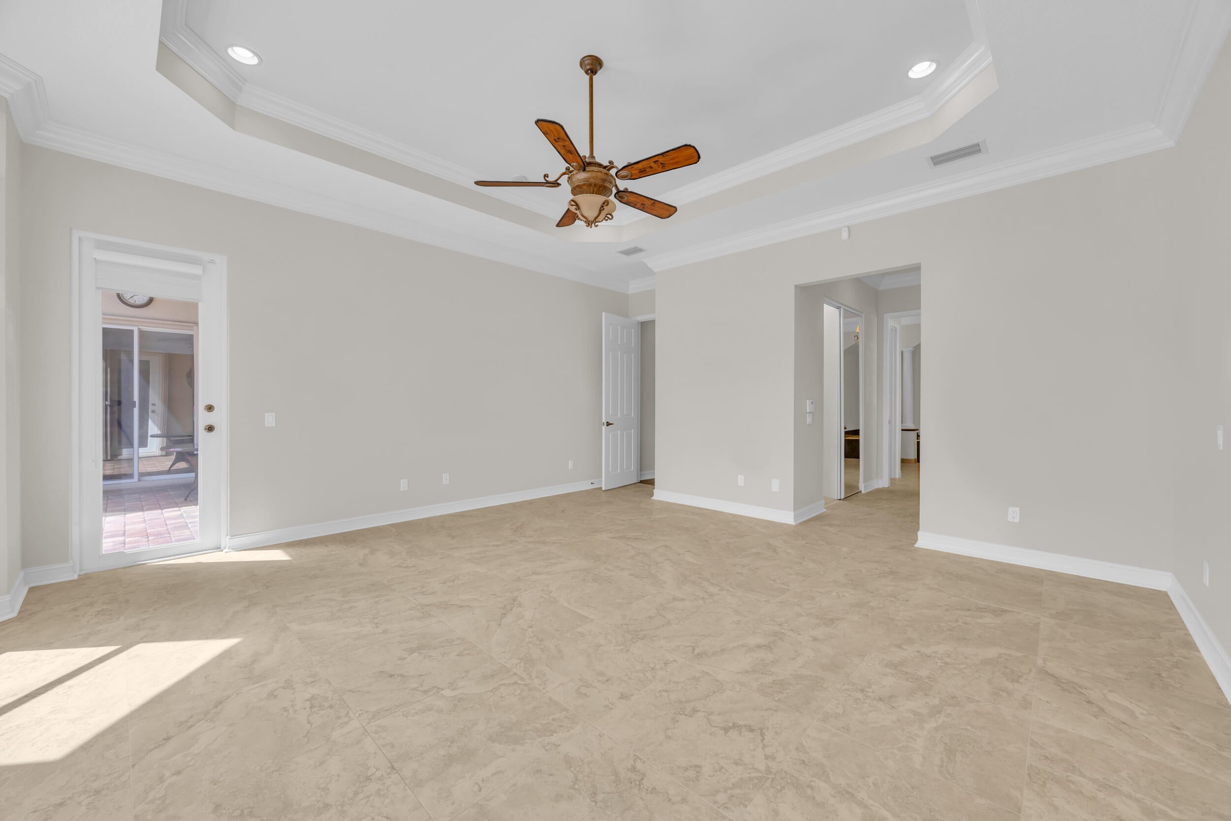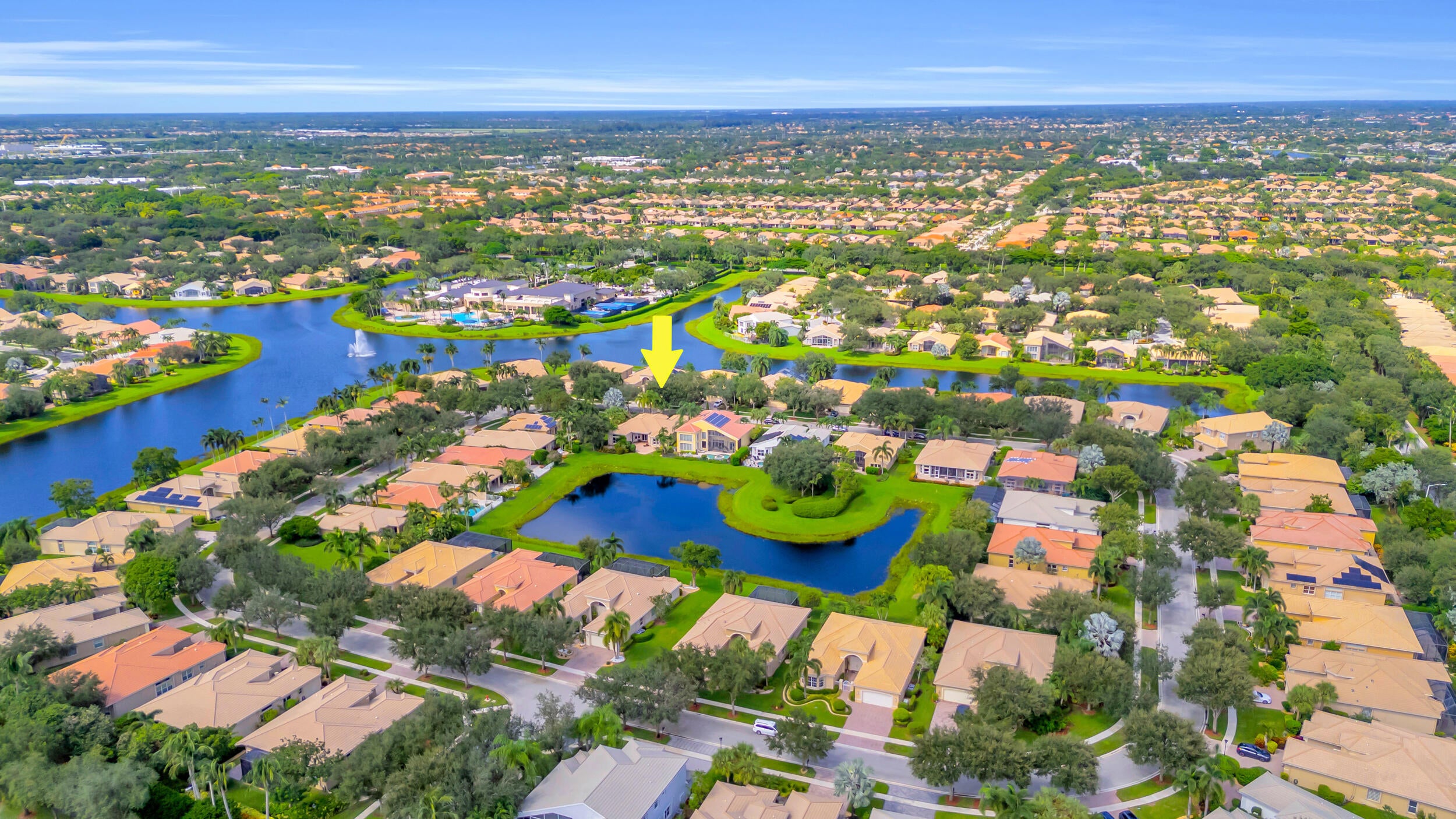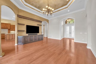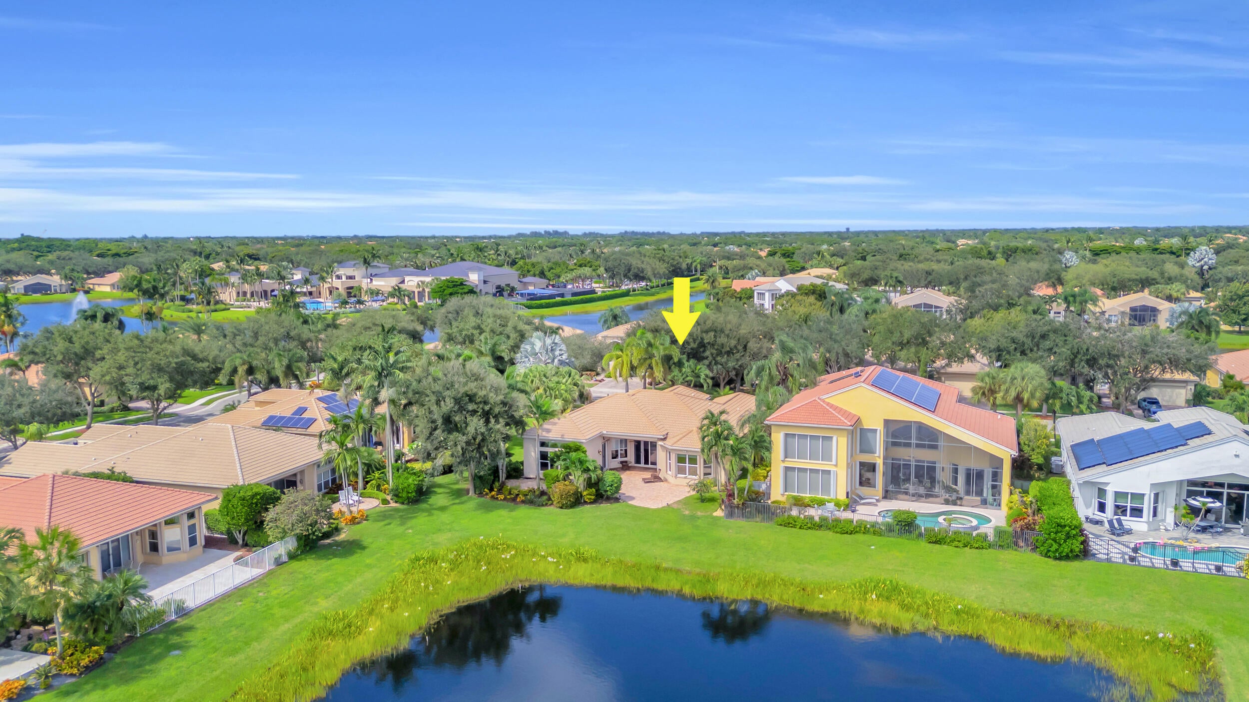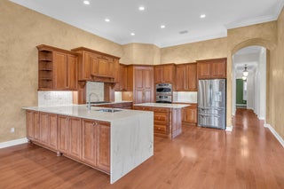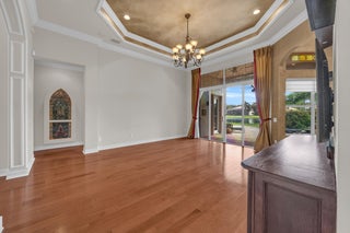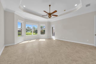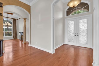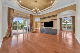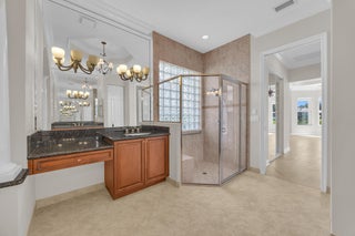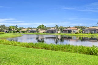 This beautifully appointed Madrid model is nestled in the prestigious Valencia Pointe community. This immaculate home offers the perfect blend of comfort, style, and breathtaking views, featuring a serene private lakefront setting that provides peace and tranquility right in your backyard. Step inside to find spacious open-concept living areas, high ceilings, and an abundance of natural light that enhance the home's elegant design. The gourmet kitchen boasts Bianco Superiore Quartzite kitchen countertops with a waterfall edge, wood cabinetry, stainless steel appliances, a propane gas cook top and a cozy breakfast nook with picture-perfect views of the lake. Upgrade highlights include: full house generator, custom glass entry doors, 2 foot garage extension, expanded driveway,walkway and patio pavers, built-in wall units, electronic ''phantom'' patio screen, 2019 Carrier AC units, gutters, accordion storm shutters, propane gas outdoor grill, 6 month old water heater, brand new pool pump & motor, new mosquito sprayer motor, new garage door mechanicals: motor, wheels, etc... and so much more. Half bath has been converted to a closet; plumbing hook-ups remain to convert back if desired. Walls have been photo shopped as they have been patched/sanded/prepped for paint. The expansive primary suite is a true retreat, complete with walk-in closets, a luxurious en-suite bath with dual vanities and a separate shower. Additional bedrooms offer flexibility for guests, a home office or a hobby room. Step outside to your expansive patio, where you can enjoy peaceful mornings or relaxing evenings overlooking the sparkling lake and lush landscaping or enjoy the separate sitting area just off the waterfall and mini pond...your private sanctuary awaits you on this incredible lot with no one on your right side. Located in the sought-after 55+ Valencia Pointe community, residents enjoy access to a resort-style clubhouse, café, fitness center, tennis and pickleball courts, swimming pools, and a full calendar of social activities.