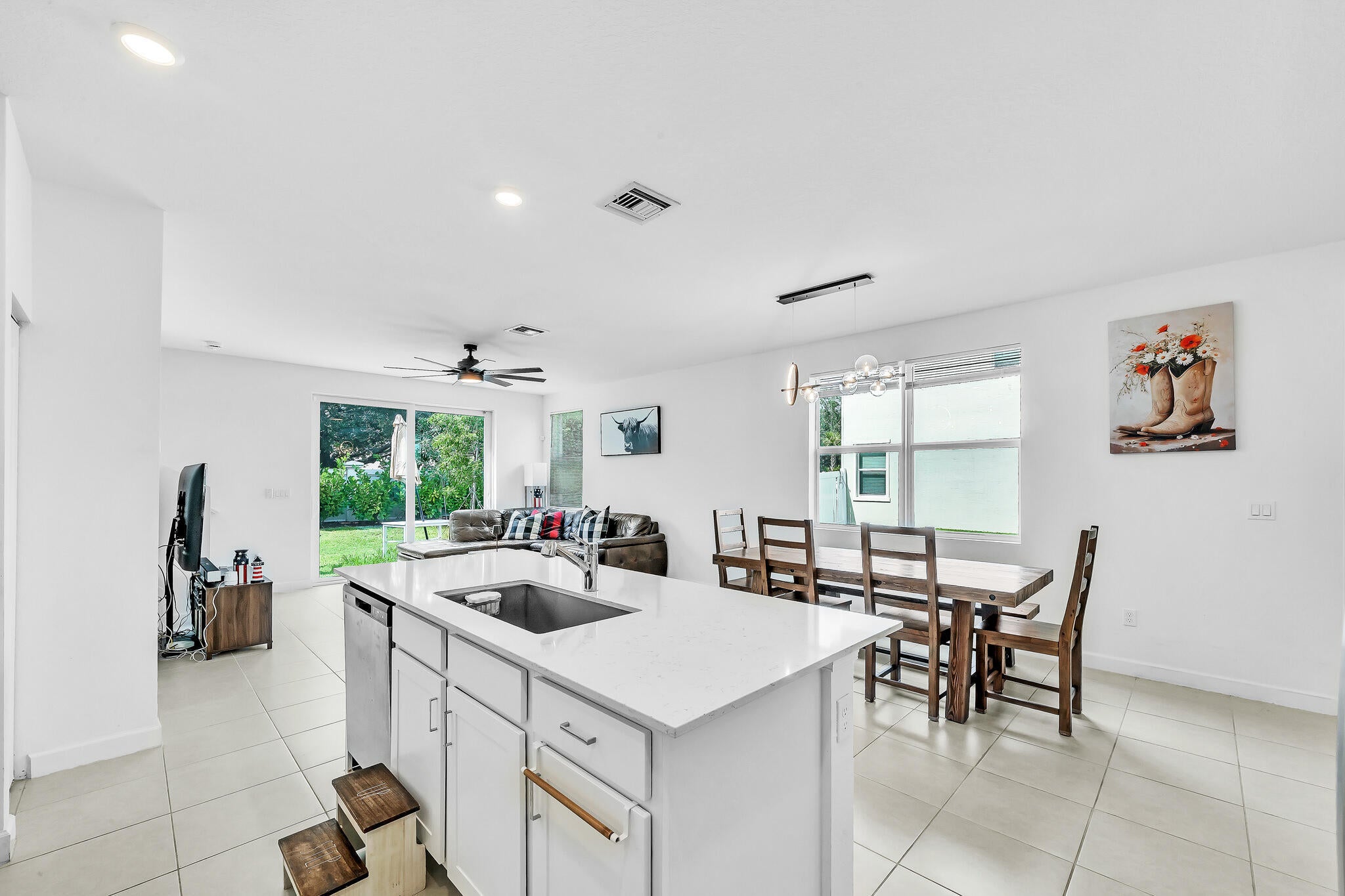 This beautifully appointed TH offers 3-2.5 + den, 1,821 sq ft of living space 2,105 total. A modern, open-concept layout designed for both style and functionality.Featuring a seamless flow between the living room, dining area, and spacious kitchen, perfect for entertaining. The kitchen showcases quartz countertops, a large island, SS appliances, and white shaker cabinetry, all complemented for indoor-outdoor living. A quiet den on the first floor provides the ideal space for a home office or study. The 1-car garage is finished with sleek epoxy flooring for a clean, polished look.Upstairs, you'll find you'll find three serene bedrooms and baths. Residents of Veranda Landing enjoy a pet-friendly community. Minutes from the Turnpike, supermarkets, restaurants, shops, and a new hospital.