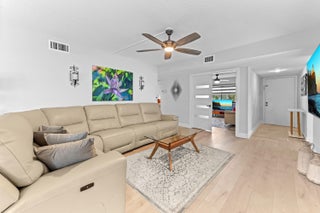 Welcome to Fairway Park Condominiums at Indian Spring, a gated 55+ community offering comfort, convenience, and peace of mind. This spacious 2-story corner condo features a 2nd-floor unit with 1,426 sq. ft. of living space, impact glass on all windows, and a bright, open layout.The home includes a remodeled kitchen with modern finishes, a pass-through breakfast bar, and appliances including a microwave, range, refrigerator, washer, and dryer. Laminate flooring flows throughout, enhancing the home's open feel.Offering 3 bedrooms and 2 bathrooms, the primary suite provides private sliding door access to the screened and covered balcony with pool views and accordion shutters.Notable updates include a new roof (2025), AC (2018), water heater and flooring (2024), plus 2022 upgrades: zebra blinds, hurricane-rated windows, washer and dryer, light fixtures, ceiling fans, electrical panel, privacy screens, and designer interior doors. Additional features include remodeled bathrooms, assigned parking, and access to community amenities - golf, social and tennis memberships are optional. This well-maintained condo blends modern updates with a desirable location in a secure 55+ community!