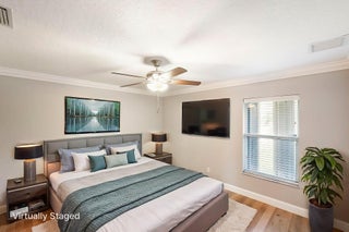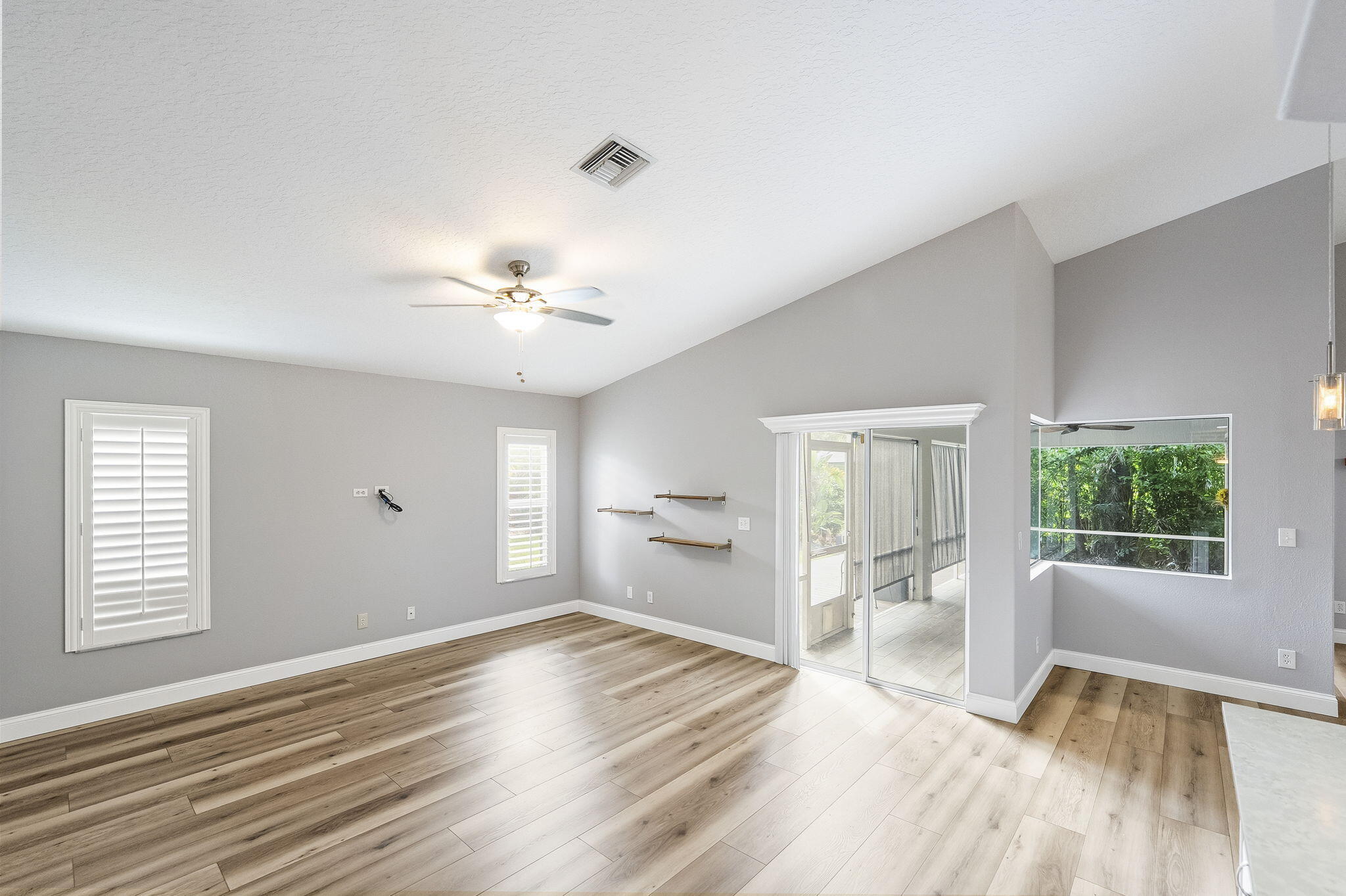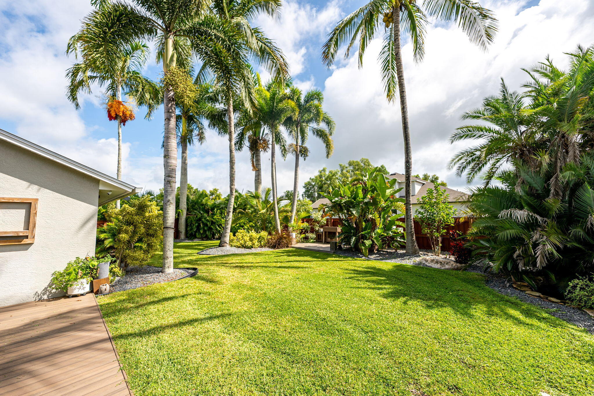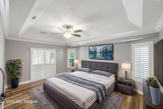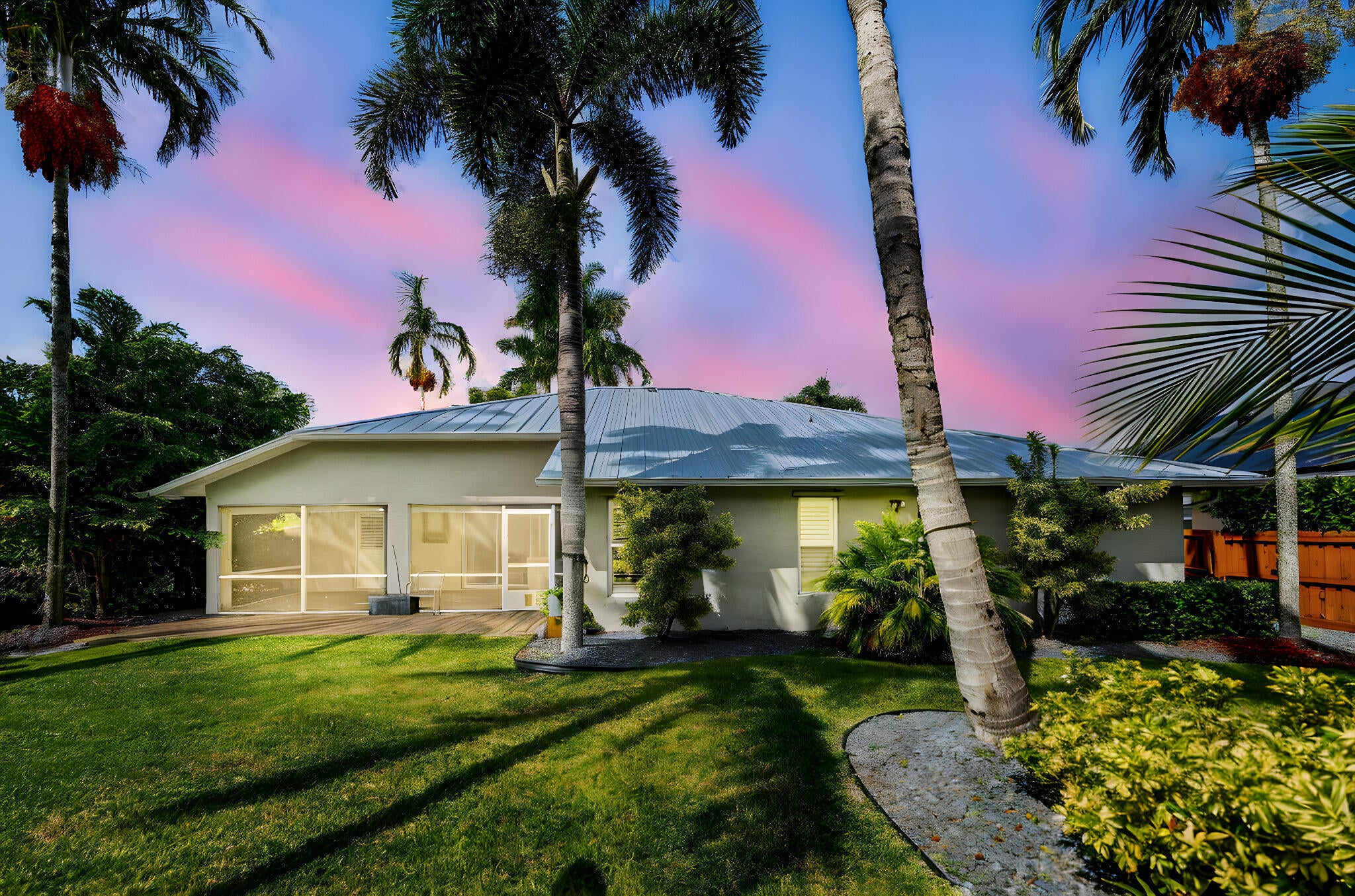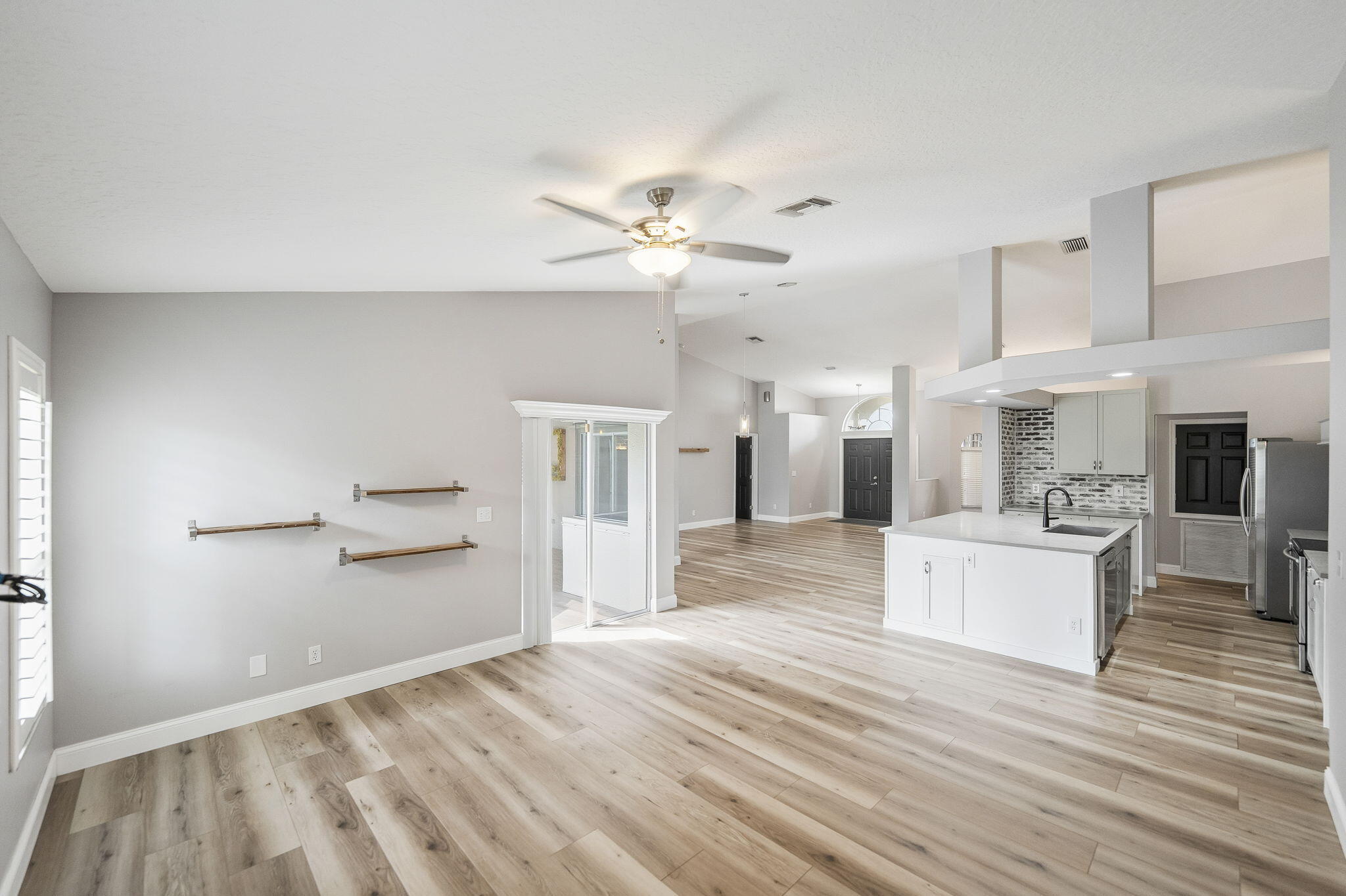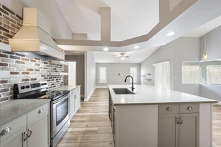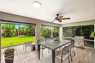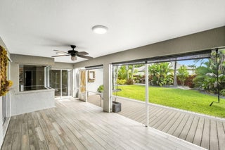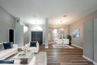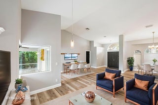 Discover this distinctive 3-bedroom, 2-bath, CBS home, with an attached 2-car garage, on a quiet street in the highly desirable Torino neighborhood. This property shows like a model with an inviting, wide-open floor plan, split-bedrooms and beautiful wood laminate flooring throughout every room. The well-appointed gourmet kitchen has been stylishly updated with quartz countertops, stainless steel appliances, and grey cabinets. You will love the designer Plantation Shutters and crown molding. A newer metal roof was installed in 2022, and the AC system was replaced in 2016. The large screened patio opens to a lushly landscaped, fenced backyard, deck and tranquil outdoor space with koi pond and BBQ area. Top location convenient to shopping, schools, access to I95 and area beaches.