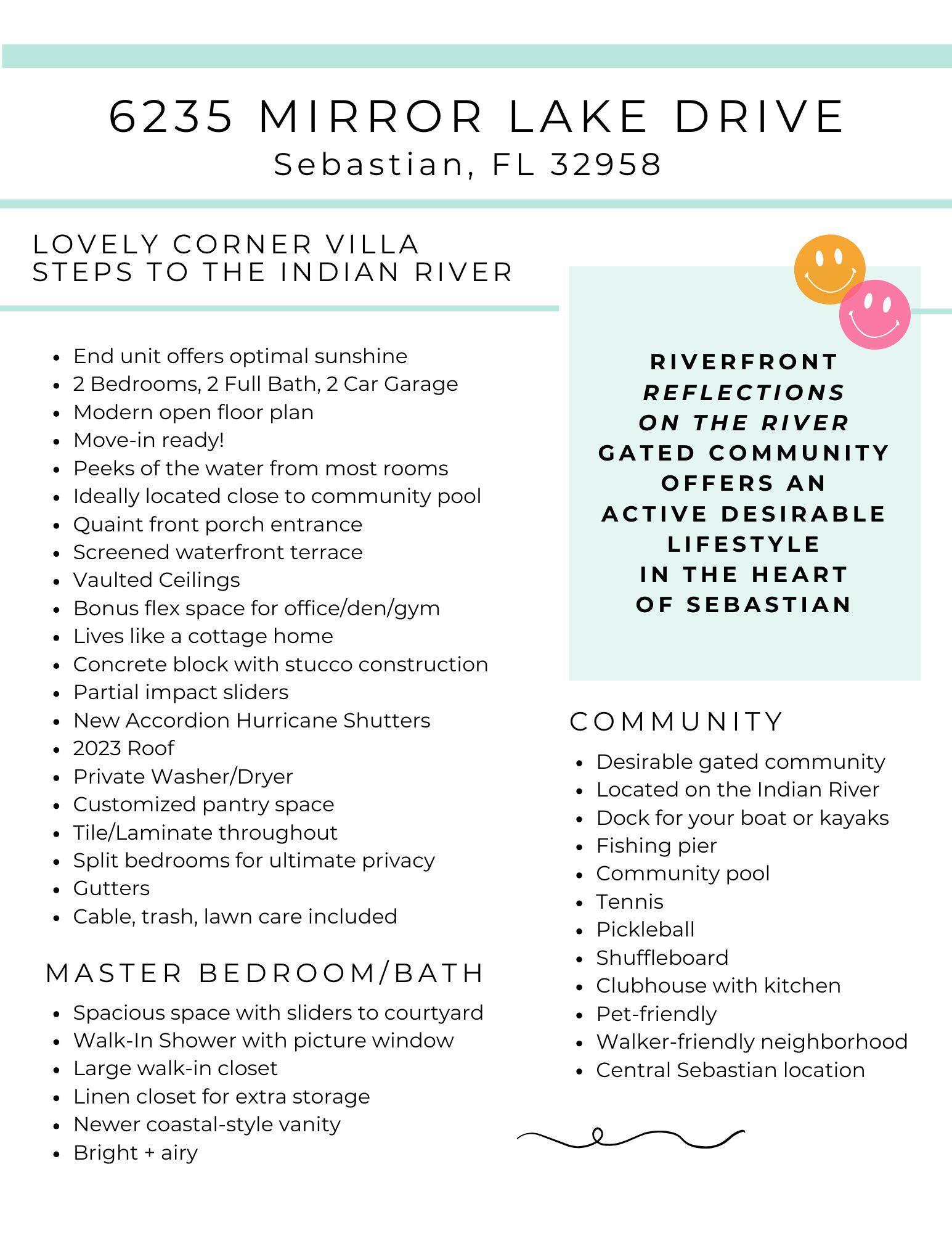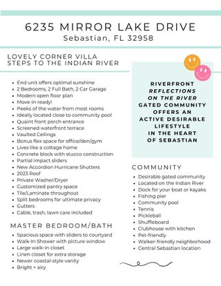 Coastal living in the heart of Sebastian! This rare 2/2 end-unit villa in a gated riverfront community offers 2 car garage + unbeatable pond views from oversized screened terrace to soak in those dreamy sunrises. Inside offers vaulted ceilings, a smart split floor plan, 2023 roof, partial impact sliders + extended living space for a home office/flex area. Dock your boat or kayak + hit the intracoastal in minutes. Enjoy year-round dips in heated pool, challenge friends to pickleball or tennis + throw unforgettable gatherings in the gorgeous clubhouse. This is the Florida lifestyle, upgraded.