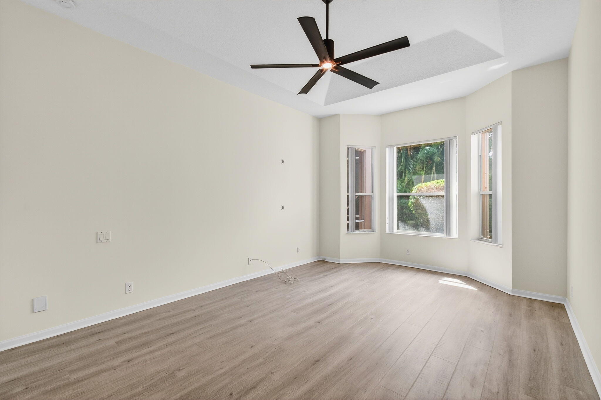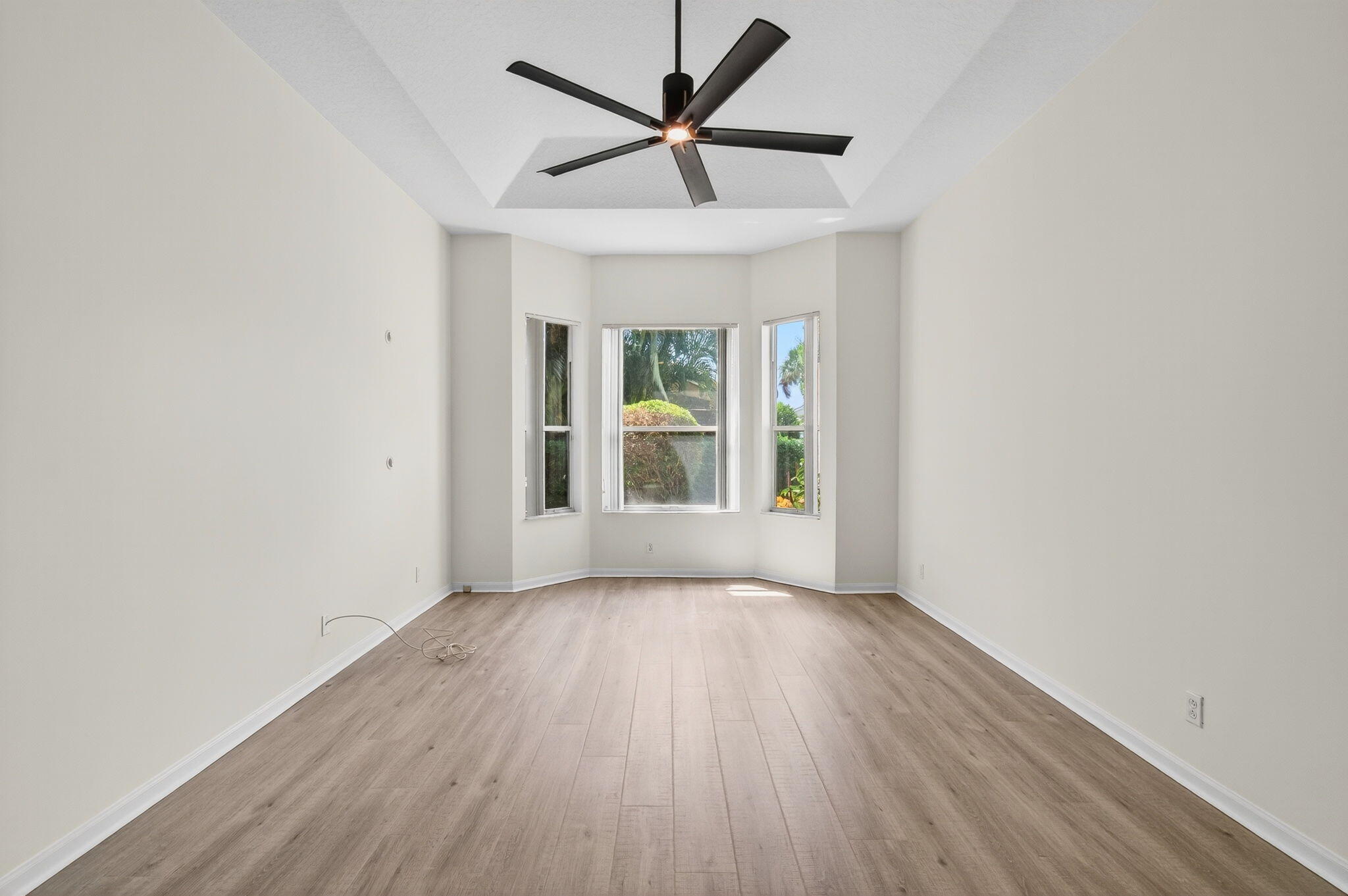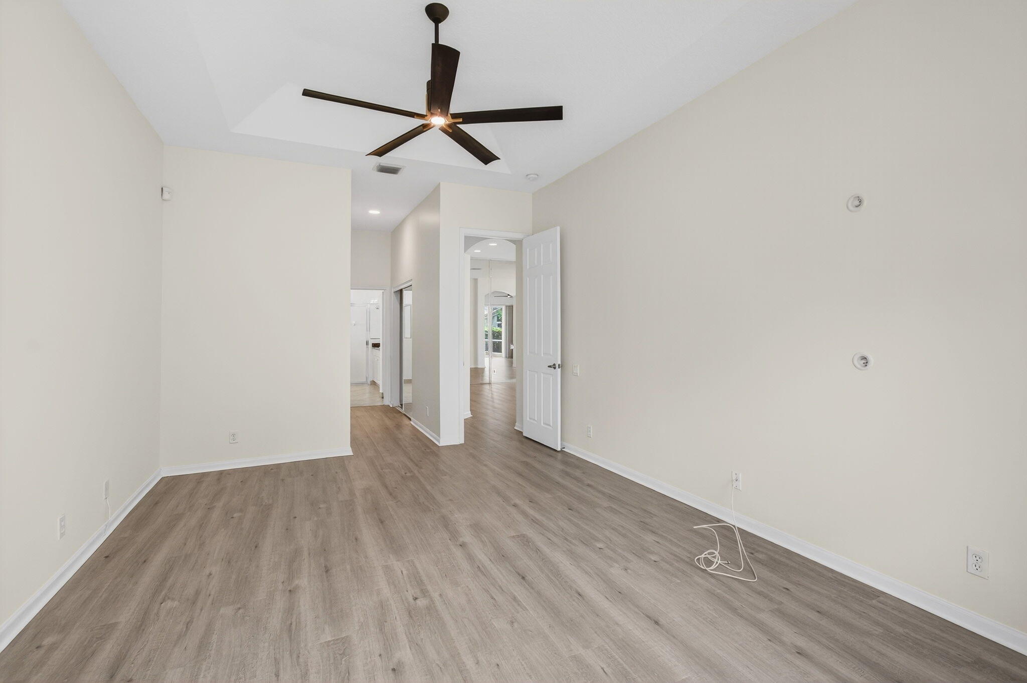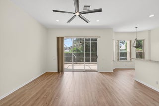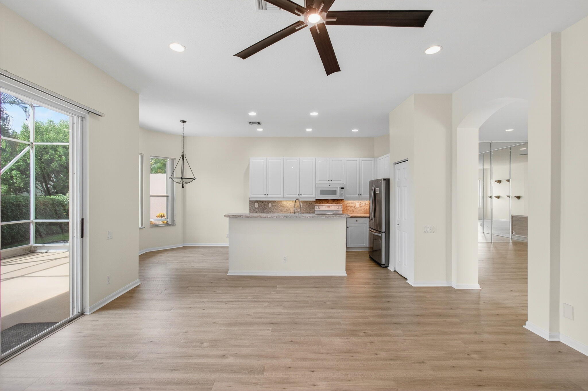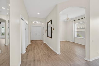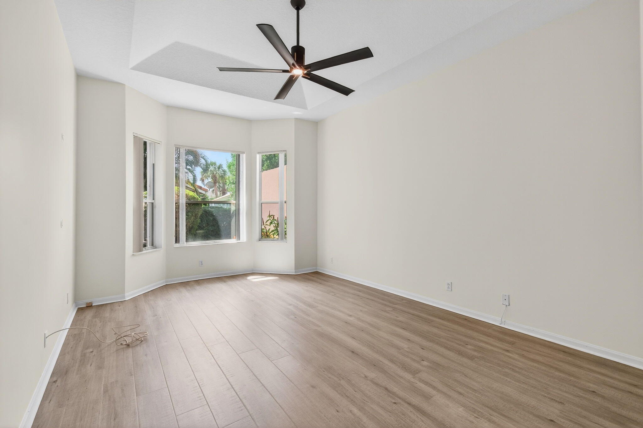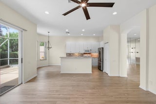 This Granville model in Cascades has been beautifully transformed with BRAND NEW Nature Tek laminate flooring installed throughout the home, offering a seamless and elegant look that enhances every room. With 2 bedrooms plus a den, 2 bathrooms, and over 2,000 square feet of living space, this residence sits on a larger lot with an extended side yard. Freshly painted in neutral Sherwin-Williams tones with wallpaper thoughtfully removed, the interiors are ready for your personal touch. The spacious kitchen offers white 42'' cabinetry, sleek granite countertops, stainless steel appliances--including an LG Stainless Steel refrigerator, a KitchenAide new dishwasher, and a brand new disposal. It opens to both formal and casual living areas, perfect for entertaining or relaxing.The primary suite is a true retreat with his-and-hers custom closets, dual vanities, a soaking tub, and a separate glass-enclosed shower. A split-bedroom layout offers privacy for guests, with an updated second bathroom featuring granite counters and a glass-enclosed tub/shower combo. Additional highlights include a 2024 water heater, 2017 AC with New UV light and New Nest thermostat, Roof 2009, new ceiling fans, hurricane-rated garage door with MyQ remote opener, accordion shutters for storm protection, and central vacuum system. The home is situated on a premium oversized lot with an expansive side yard offering additional privacy and tranquility. Cascades offers resort-style living with a 24/7 manned gated entrance, updated clubhouse, resort-style pool and spa, state-of-the-art fitness center, on-site café serving breakfast and lunch, pickleball and tennis courts, card rooms, clubs, and live entertainment. Golf enthusiasts can enjoy Westchester Country Club's 18-hole courseright next door with no mandatory membership. HOA fee includes high-speed internet, cable, lawn care, exterior home painting, and full access to all community amenities.