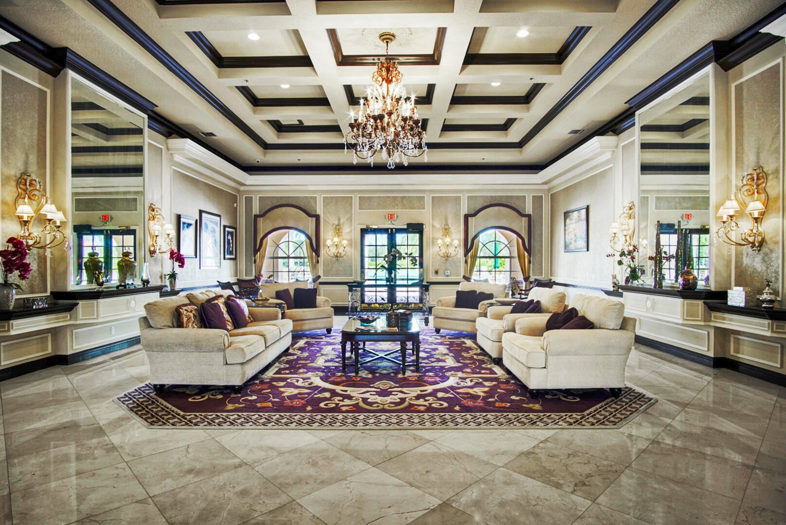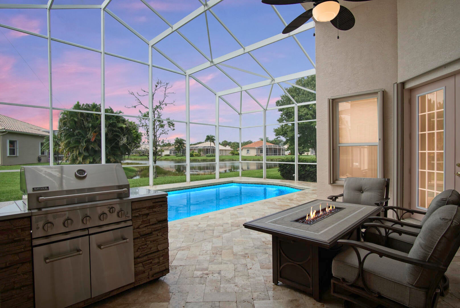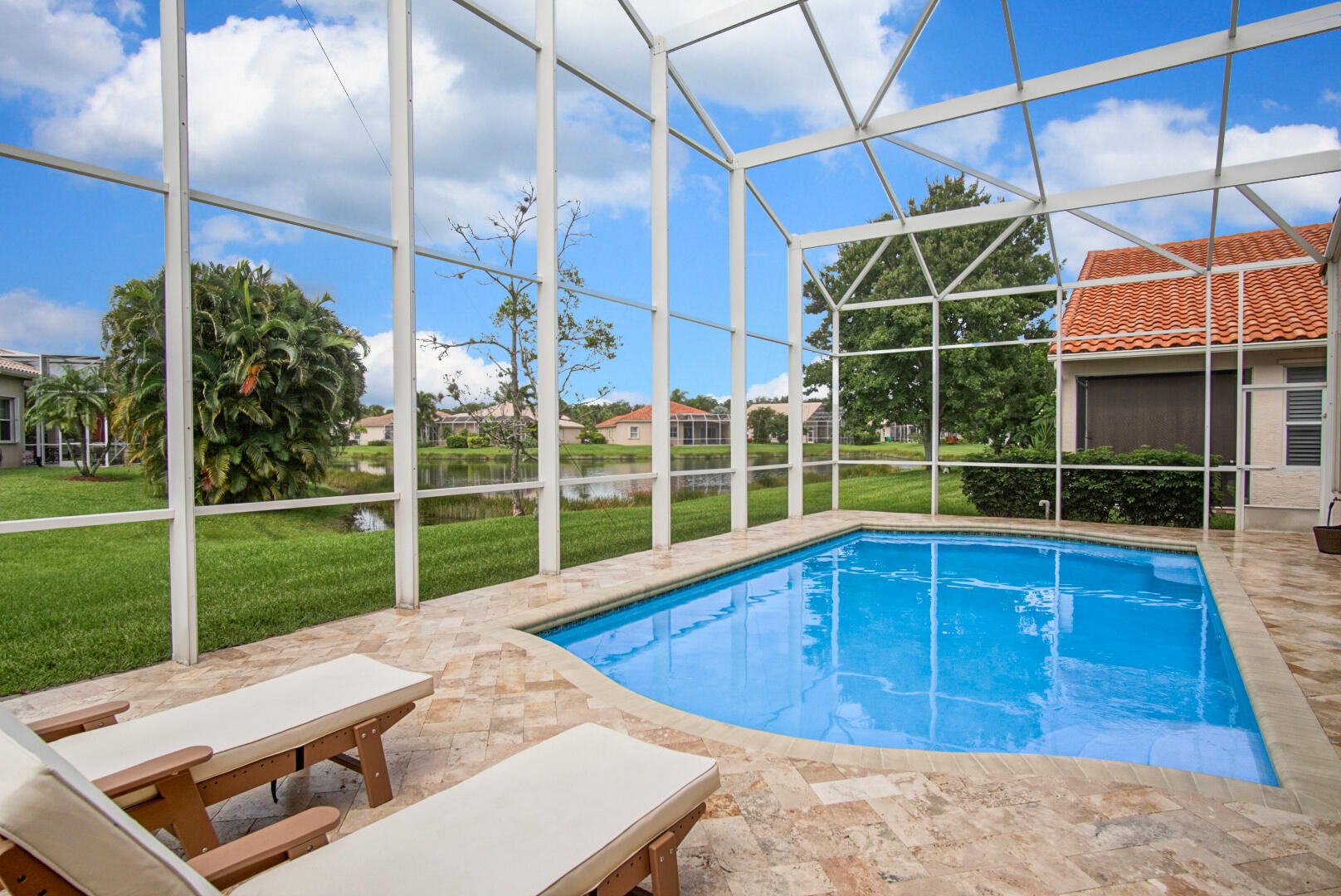 From floor to ceiling, it's obvious that the owner of this gorgeous home is an interior decorator. Meticulously maintained, this home offers over 2200 square feet, 3 spacious bedrooms, and a backyard oasis that just had a $30,000 makeover. Boasting stunning LVT flooring and 16'' diagonally-laid tile throughout, you'll love the oversized formal dining room, beautiful kitchen overlooking your waterfront lot and pool area, and the wow factor you get when you walk through your double door entry. You have loads of natural light in every room, 10' ceilings throughout, two huge his-and-hers walk-in closets with custom wood organizers, and upgraded Hunter Douglas blinds. The master bedroom is accented by a coffered ceiling, access to your pool area, and load of windows allowing for memorableviews. And that's just the inside! Step out back and you'll fall in love with the brand new travertine tile decking, crystal clear blue waters in your 14'x28' heated pool, french drains, pool cover, outdoor grill and pool furniture (may stay with home), and 24' high custom screen enclosure. You'll enjoy endless nights outback with perfect views of the lake. The Cascades has been voted one of the top 55+ communities in America several times, offering a world class clubhouse and amenities, as well as an engaging list of fun activities for those who prefer to stay active. Additional upgrades include accordion shutters, gutters, automatic sprinklers, an epoxied garage floor, extra storage shelves in the garage, and a new LG washer/dryer set (2024). This home has it all!