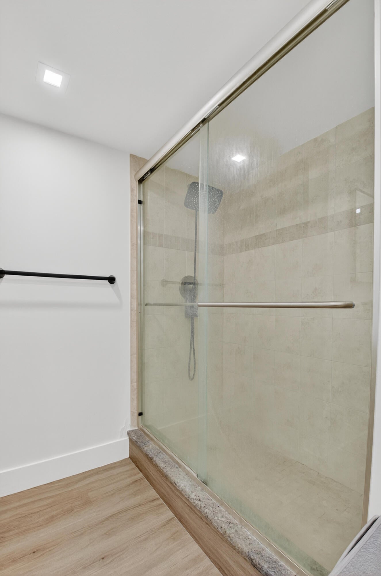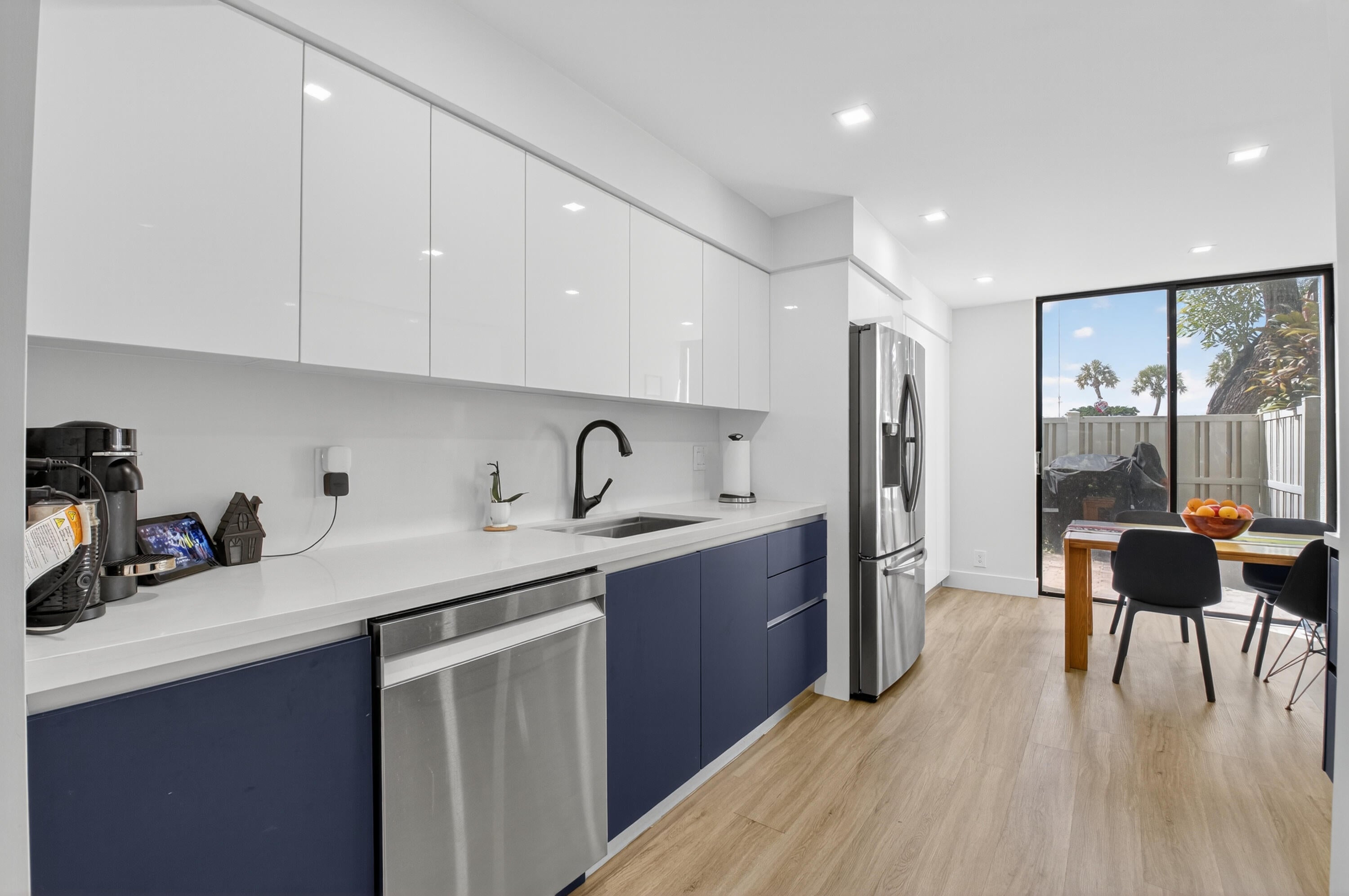 Bridgewood 3 bedroom, 2.5 bath town house. Corner lot with lushly landscaped exterior patio area with partial lake view. Expanded interior area with porch glassed in and opened to the living area. Renovated interior with engineered wood floors throughout. Updated kitchen with granite counters, stainless appliances and kitchen drawers with lights. Oversized washer & dryer. LED Lights in all the rooms. All the bathrooms have been updated with new vanities, toilets and flooring. Tankless water heater. Water filter. No popcorn. Fitted Closets. Private barbecue and sitting area off the kitchen which could be a golf cart area. Comes with a covered parking space. A/C replaced in 2021. New Electrical panel. Club req'd at $150,000. + dues & $10,000 Capital Cont. to the B.W. Master Assoc.