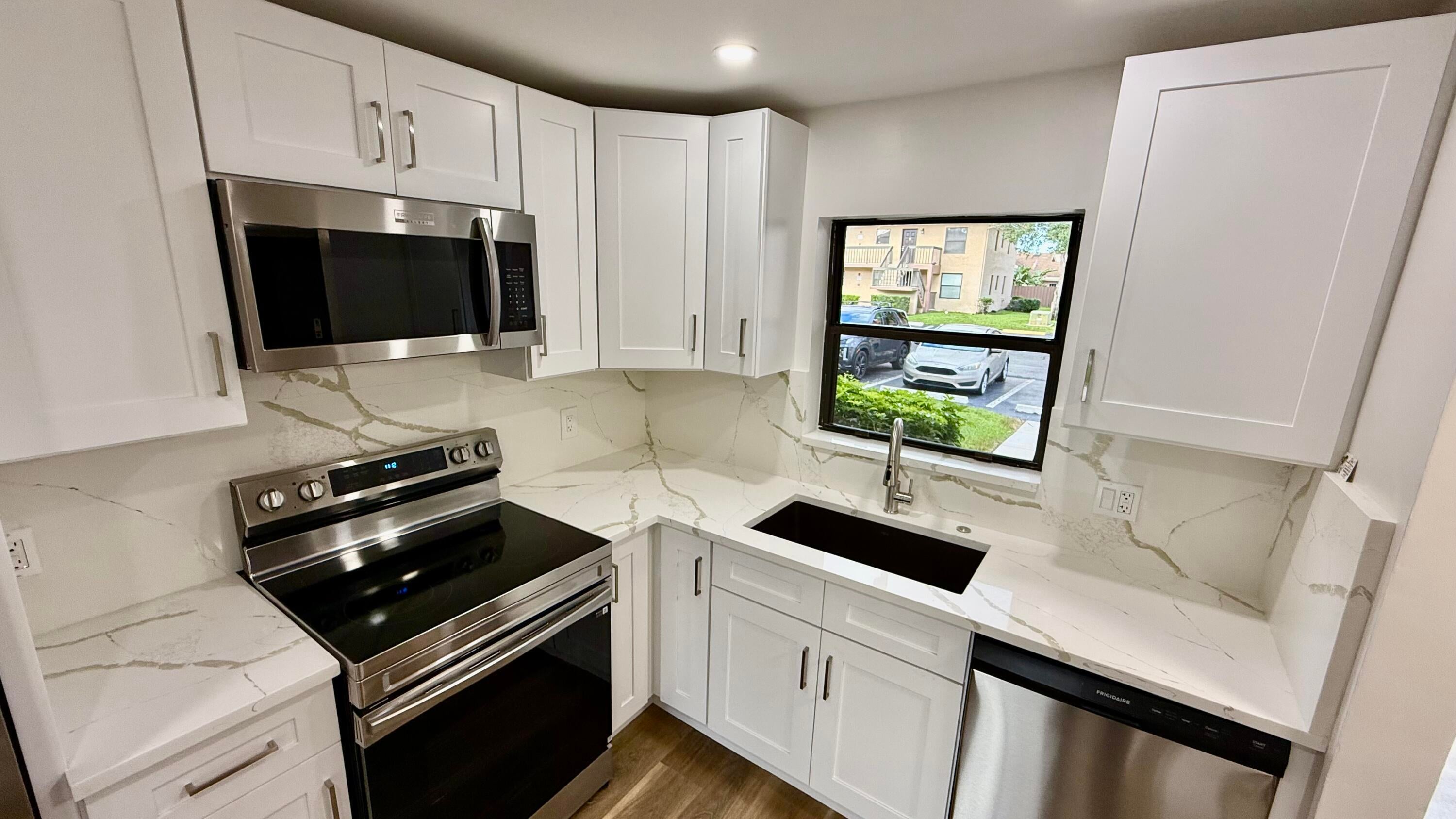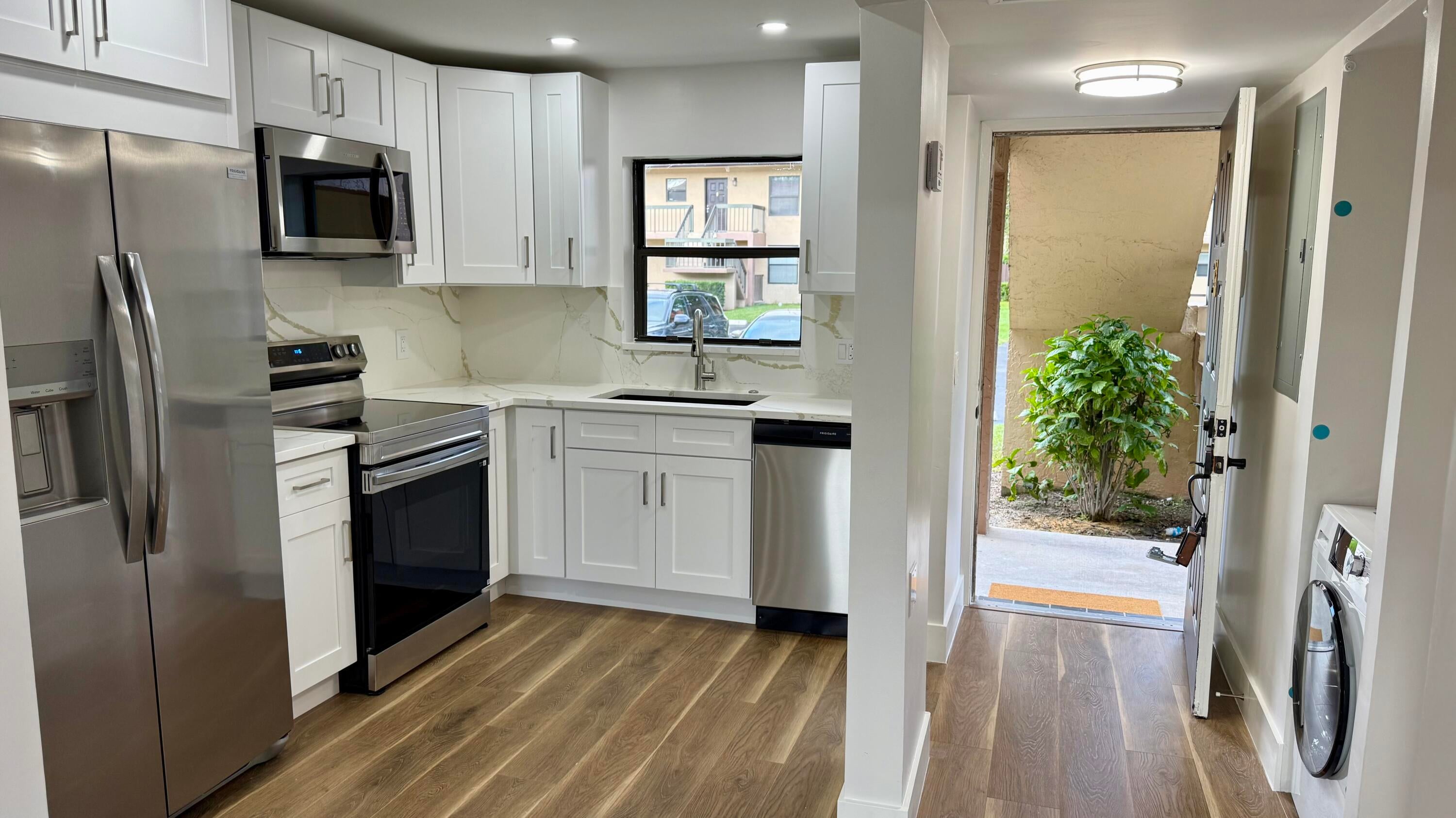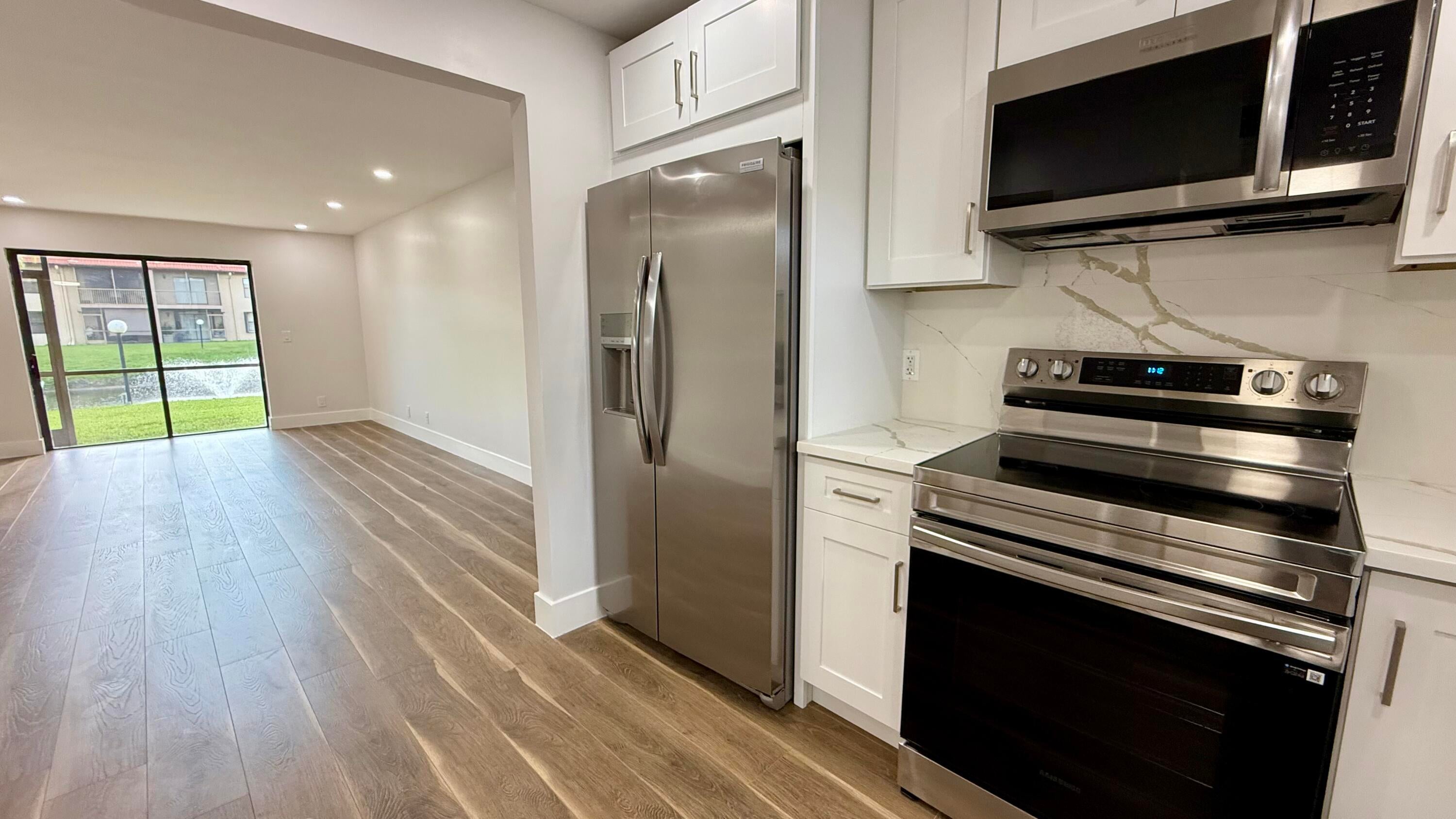 WOW !!Remodeled 2 bedrooms , 2 bathrooms 1st floor condo with lakeview and steps to the community pool .Great Central location at the heart of Boca Raton , close to shops, major roads and shopping .Brand New appliances , flooring , bathrooms , kitchen , light & plumbing fixtures .CAN RENT RIGHT AWAY !! (Easy $2,500 PM)HOA is only $ 350 per month ; water & cable is included in the dues .