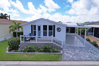 Jupiter River Park prime location. This turnkey, furnished 3BR/2BA + bunk room home was renovated in 2023. Stucco, impact windows/doors, metal roof, HVAC, water heater & water filtration, paver drive, landscaping, auto sprinklers. Bright & open w/vaulted ceilings. Custom cabinets, quartz tops, SS appliances, & laminate floors. Screened patio w/large storage room & storage below deck. Steps away to beaches, parks, dining, & community marina. This is a 55+ community where you OWN the land and a low HOA of $157.00 per month includes management, clubhouse, comcast cable & internet. Community boat slips and storage (see dock master for availability).