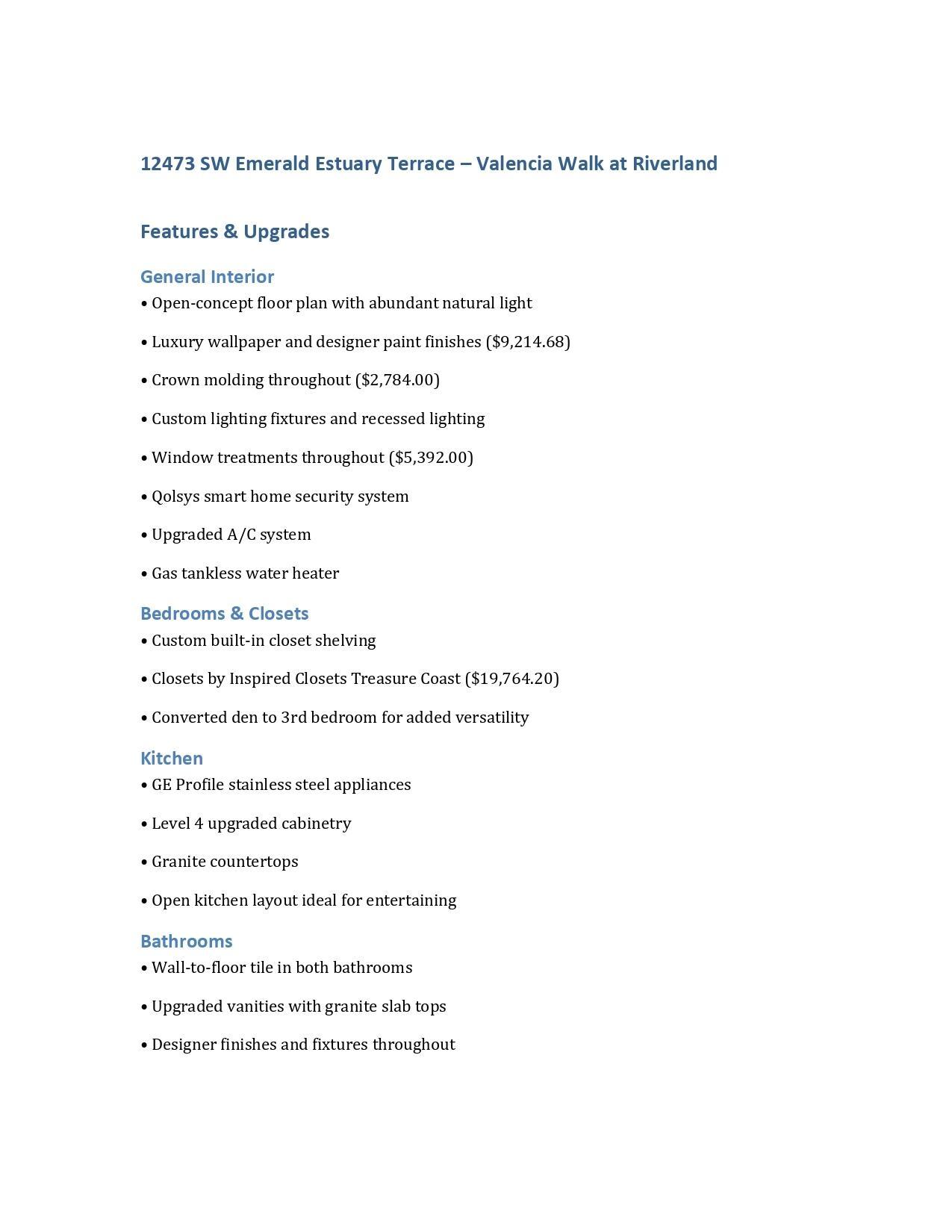 Experience luxury living at its finest in this meticulously upgraded 3-bedroom, 2-bathroom home located in the prestigious Valencia Walk at Riverland community. Every inch of this residence showcases elegance, craftsmanship, and thoughtful design. Step inside to an open floor plan enhanced by luxury wallpaper, designer paint, and custom lighting fixtures that create a warm, inviting atmosphere. The crown molding adds timeless sophistication throughout, while Closets by Inspired Closets Treasure Coast and built-in custom shelving maximize organization and style.The gourmet kitchen is a true showpiece, featuring GE Profile stainless steel appliances, Level 4 cabinetry, and granite countertops that blend elegance with practicality. Both bathrooms offer floor-to-ceiling tile, upgraded granite slab vanities, and refined details for a spa-like retreat. The converted den provides a versatile third bedroom or office option, perfectly suited to modern lifestyles. Additional highlights include an upgraded A/C system, gas tankless water heater, Qolsys smart security system, and recessed lighting throughout. The garage floors by Premier Garage ($3,458) add a polished, durable finish, while custom window treatments ($5,392) complete the home's sophisticated aesthetic. Outdoor spaces shine with a pavered patio, driveway, and walkway, plus an expanded wide driveway for extra parking and curb appeal. Located in the heart of Riverland, residents enjoy access to world-class amenities, scenic walking trails, and an unmatched resort-style community atmosphere. With a Lifestyle Director on site, residents enjoy a relaxed, yet active and vibrant lifestyle with access to a wealth of resort inspired amenities, including a Clubhouse with Events Hall, Café and Bar, plus Riverland's 24 total acres of state-of-the-art sports and fitness complex, swimming pools and dozens of Pickleball courts, Tennis courts, Bocce courts and the Paseo Park and walking / biking trails and dog parks. All with convenient access to Tradition's shopping, dining, and entertainment options. Everything you need is at your fingertips!