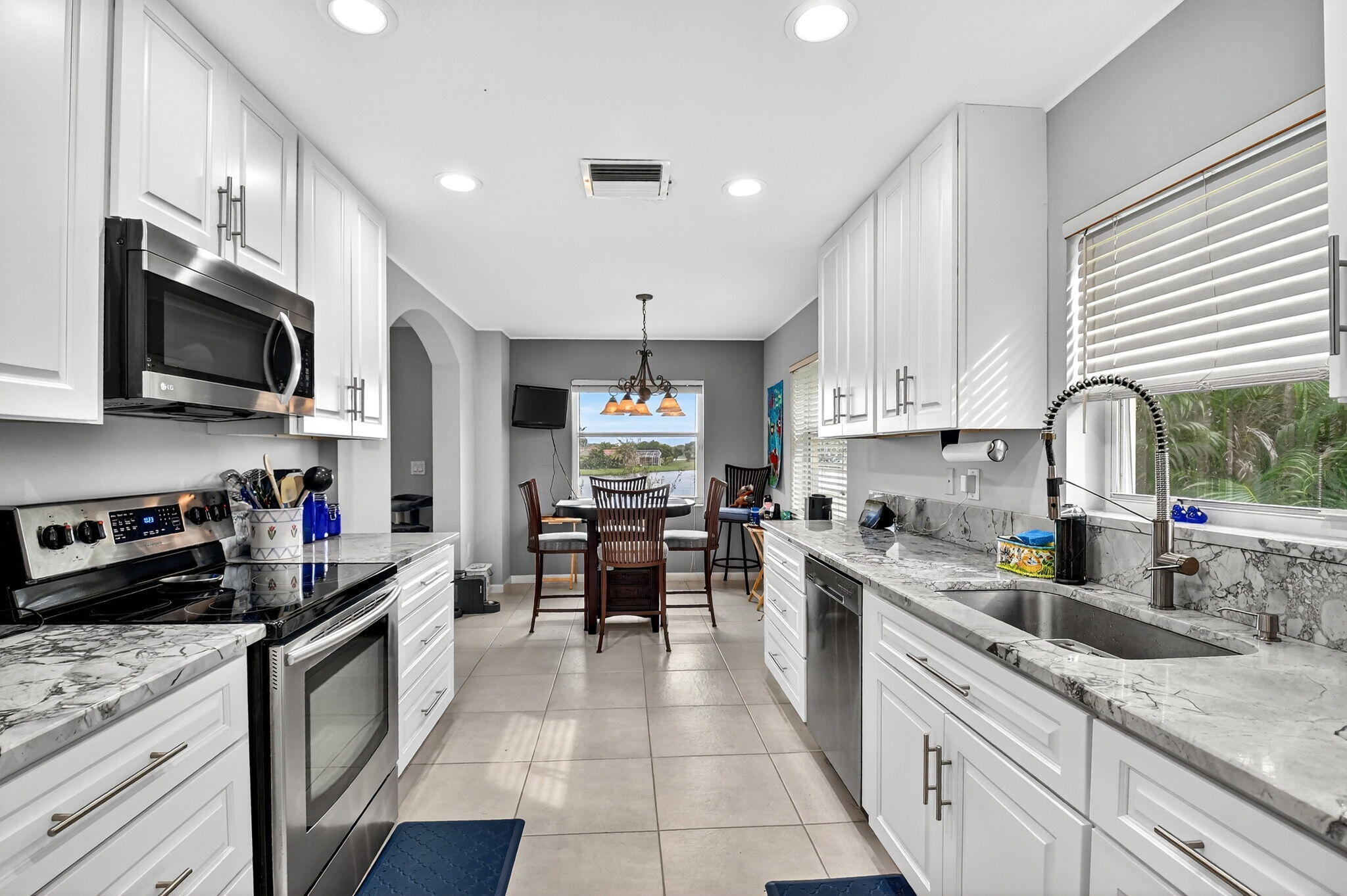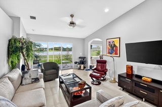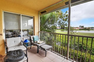 RARELY AVAILABLE 2nd floor coach home with interior elevator, extensively renovated featuring vaulted ceiling, screened-in patio overlooking a gorgeous wide lake (outdoor living at its finest.) modern kitchen with quartz counters, custom white cabinets & SS Appliances, 2 beautiful, renovated bathrooms. Luxury laminate in master & 2nd bedroom. New roof was installed in 2024. NO assessments! Condo fees include water. alarm, internet, TV, all amenities at newly renovated Club with tennis, pickleball, billiards, bocce, theatre, cafe, 35 social clubs, gym, water aerobics & much more, No country club fees. Move right in and enjoy. Can be rented immediately.