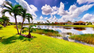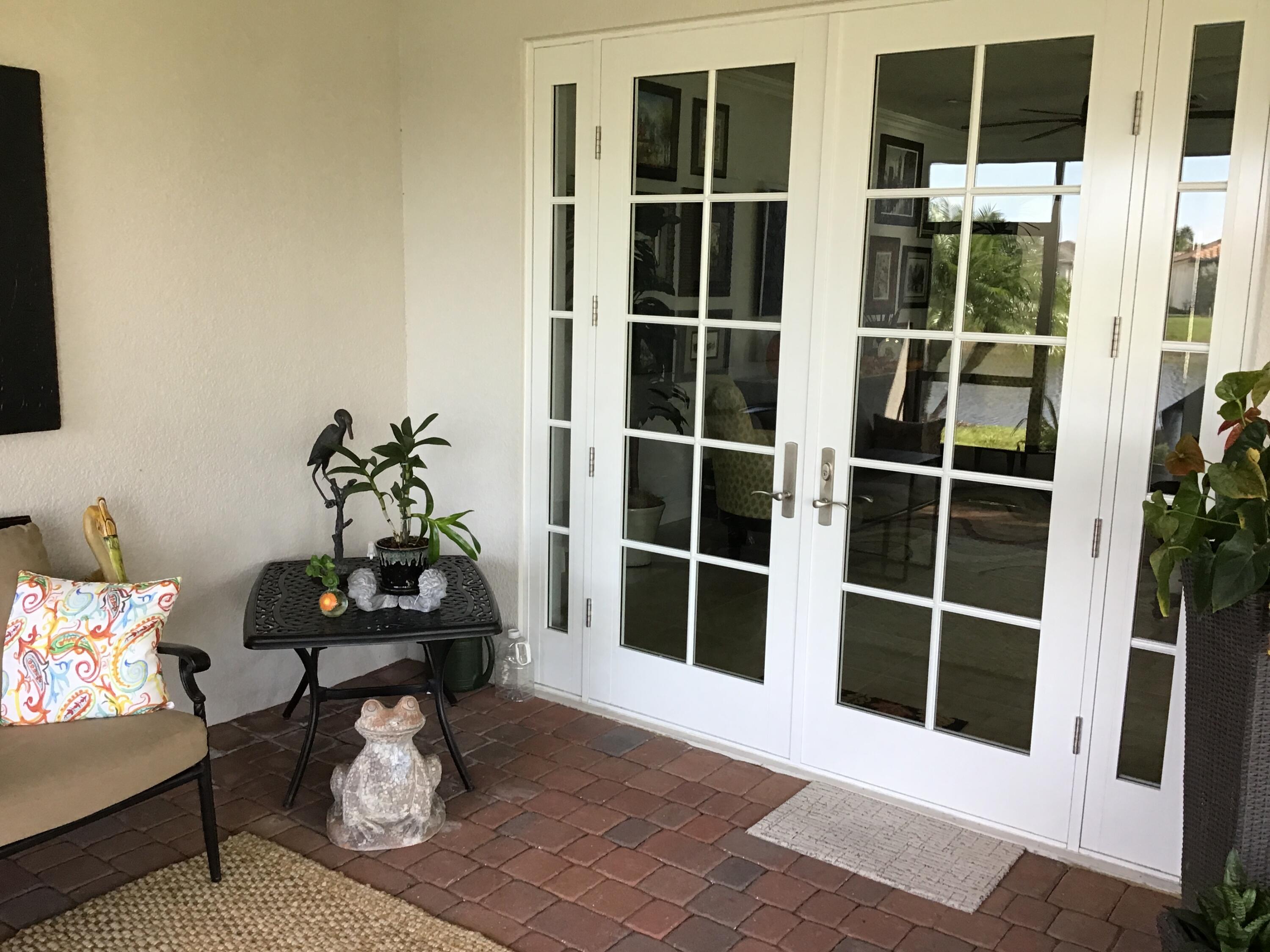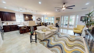 This beautifully appointed 2-bedroom, 2-bath home with a den offers over 2100 sq. ft. of luxurious living space and impeccable design throughout. The open floor plan features a spacious great room that flows seamlessly into the dining area and gourmet kitchen, complete with quartz countertops, 42-inch cabinets, and an upgraded gas range. Unique double glass French doors lead to an extended, covered lanai where you can enjoy stunning lake views and lush, upgraded landscaping, the perfect setting for entertaining or quiet relaxation. The home showcases elegant details such as crown molding, custom cabinetry, a barrel tile roof, and impact windows for peace of mind. The den includes built-in dual desks and cabinets, ideal for a home office or creative space.The oversized master suite overlooks the lake and features dual sinks, a walk-in shower, and a built-in vanity near dual closets. Guests will feel right at home in the secondary bedroom with its fully remodeled bathroom. A 4-foot garage extension adds valuable extra space for storage or hobbies. This home combines luxury, comfort, and functionality all set against a backdrop of breathtaking lake views.