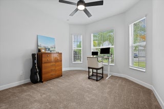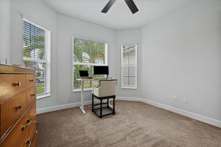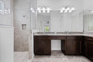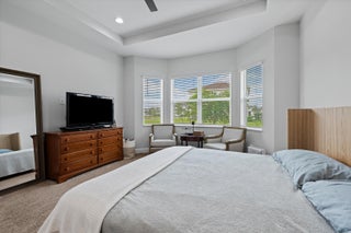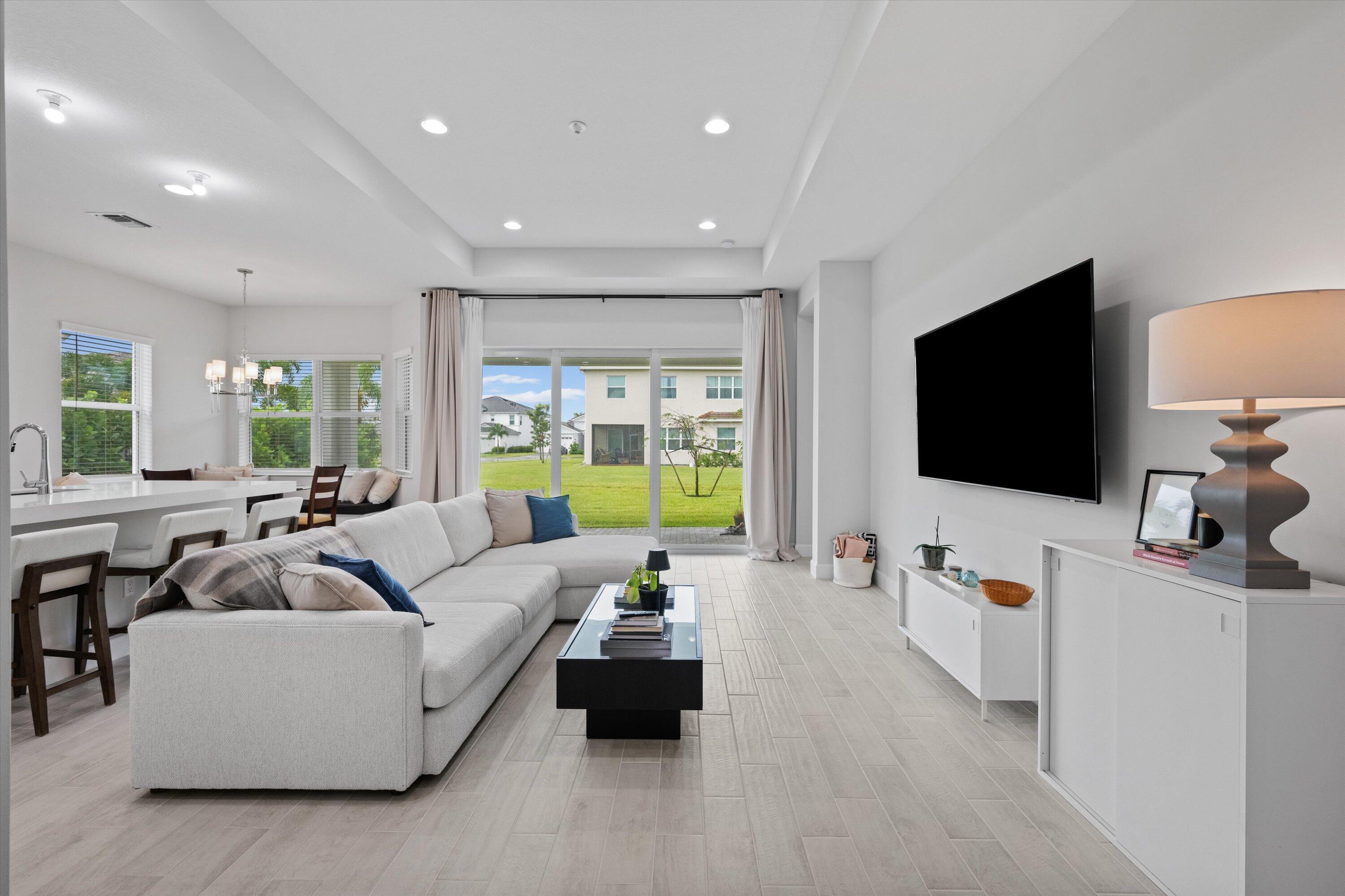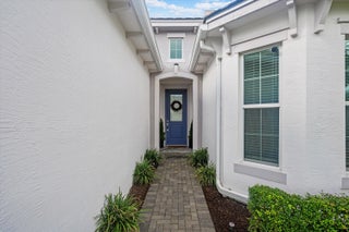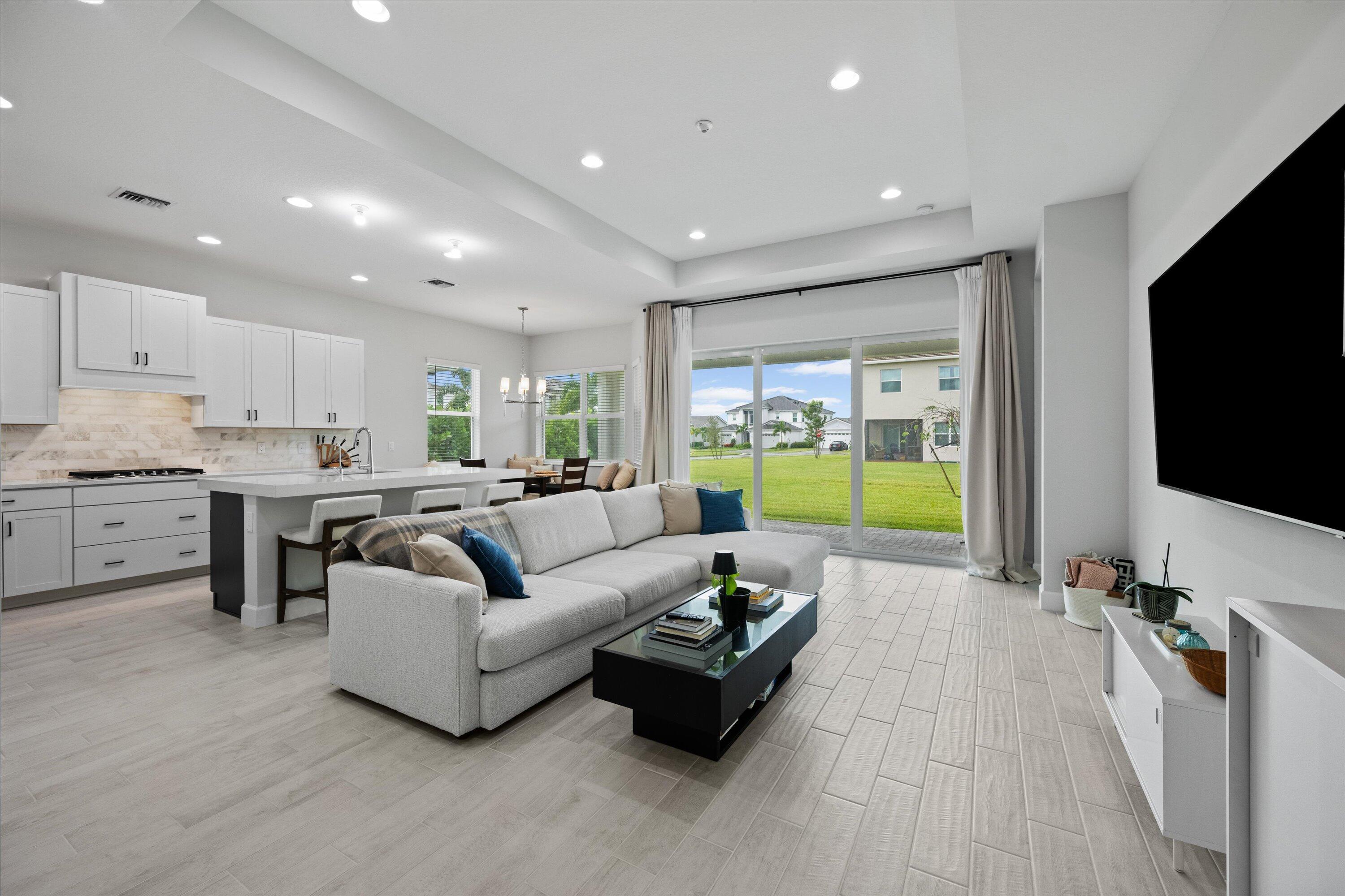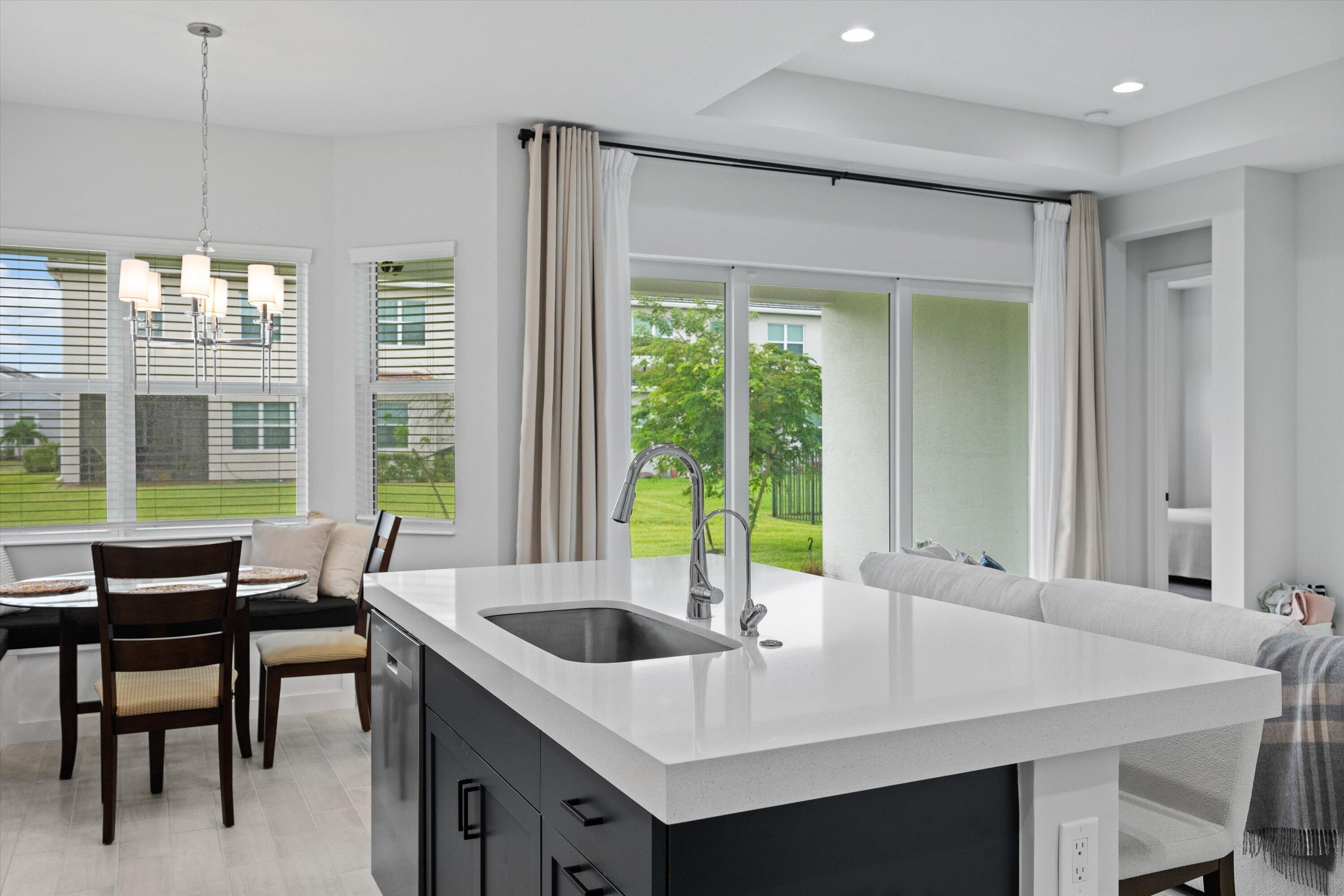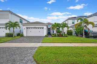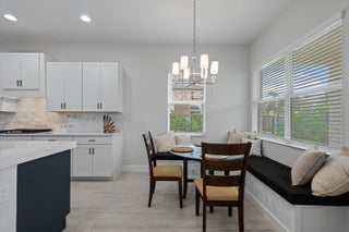 Welcome to the Marlberry model located in The Orchards of Westlake! This beautifully designed single-story home offers 3 bedrooms, 2 bathrooms, and a 2-car garage, spanning approximately 1,913 sq. ft. of living space. Built in 2023, this residence showcases a perfect balance of modern finishes and functional design.As you approach the home, you're greeted by a charming blue front door that opens into a grand, curved foyer with high ceilings and abundant natural light. The home features neutral white interior paint and tile flooring throughout all main living areas, creating a bright and cohesive flow. The gourmet kitchen is a standout, boasting white shaker cabinetry, a quartz island, contrasting dark lower cabinets, a stylish backsplash, and stainless steel appliances including a gas range. Adjacent to the kitchen is a cozy breakfast nook with custom built-in seating, and nearby you'll find a formal dining area with convenient kitchen access. The expansive living room is filled with natural light thanks to sliding glass doors and recessed lighting, offering an ideal layout for entertaining or relaxing. The primary suite is spacious and thoughtfully designed, featuring carpet flooring, a bay window, two large walk-in closets, and an ensuite bathroom with dual sinks, brown shaker cabinetry, granite countertops, and an upgraded walk-in shower with dual shower heads. The additional bedrooms also include carpet flooring, with one featuring a bay window. A full secondary bathroom with granite counters, brown cabinetry, and a bathtub sits conveniently between them. Additional highlights include a large laundry room with built-in cabinetry, granite counters, and Maytag washer and dryer, plus a covered lanai that overlooks a spacious backyardperfect for outdoor living. The home is equipped with impact windows throughout for peace of mind and energy efficiency. This Marlberry model combines luxury, comfort, and practicality set in the desirable, family-friendly community of The Orchards in Westlake, Florida.