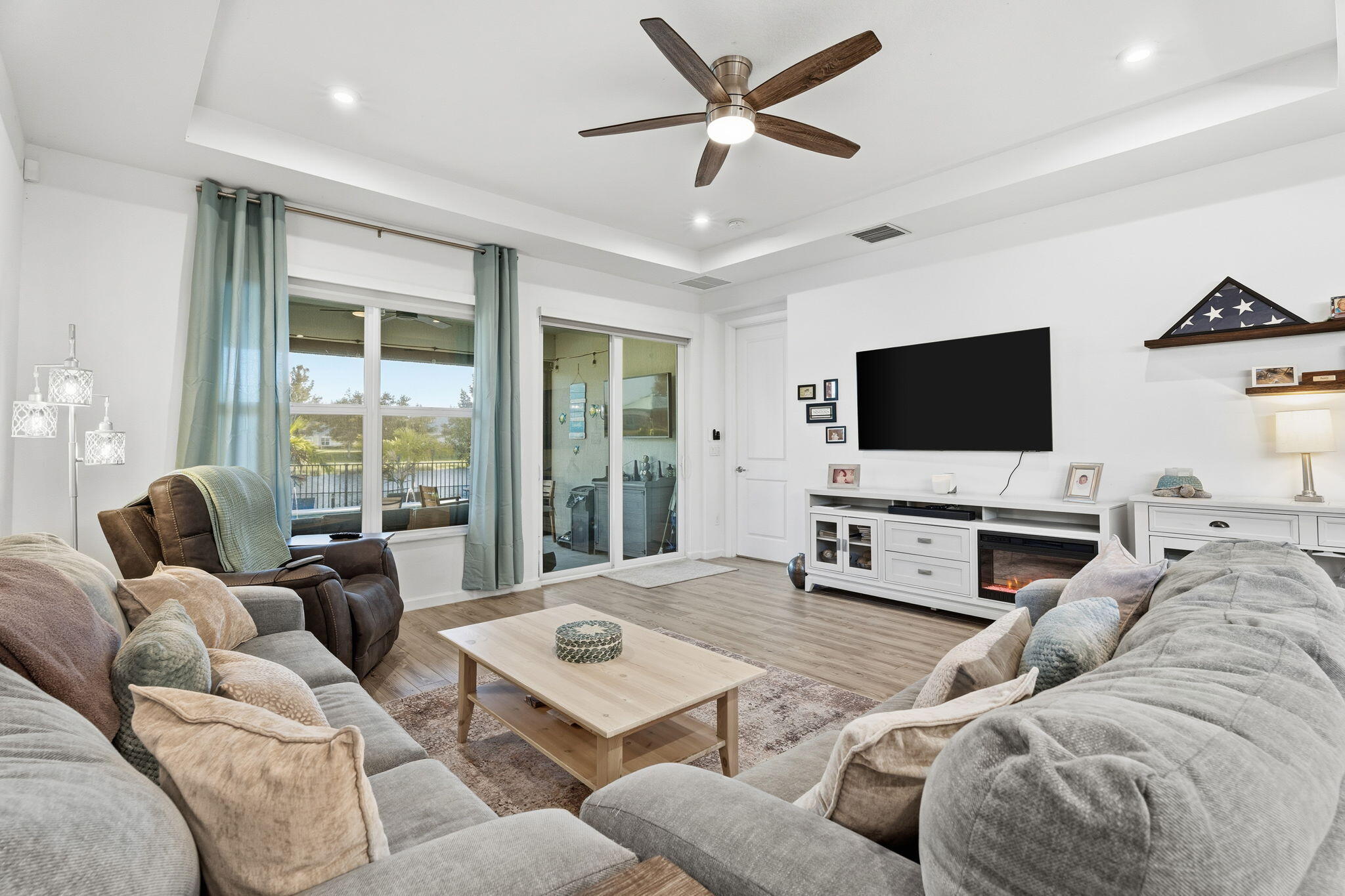 There's something special about waking up to the soft reflection of sunlight over the water -- where every morning feels like a reset, and every evening ends with golden skies dancing on the lake. This home was designed for that feeling -- peaceful, easy, and beautifully connected to the outdoors. Whether you're relaxing by the saltwater pool, sharing dinner on the covered patio, or watching your favorite show with the sliders open to the breeze, everything flows naturally. Here, life feels organized but never rushed -- a short bike ride to Tradition Square, a quick drive to dining and shops, yet tucked inside a gated community where quiet and safety come first. Seller may offer concessions with acceptable offer.