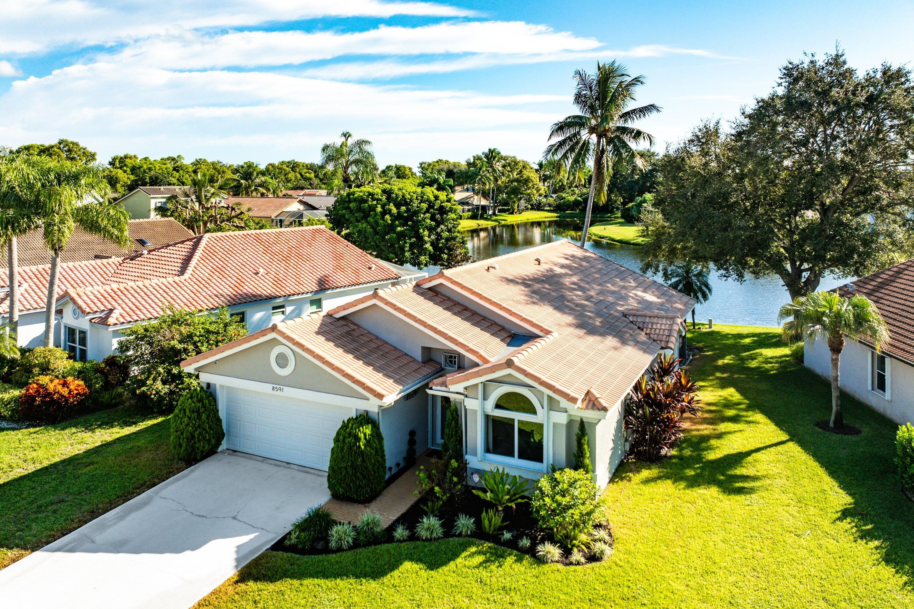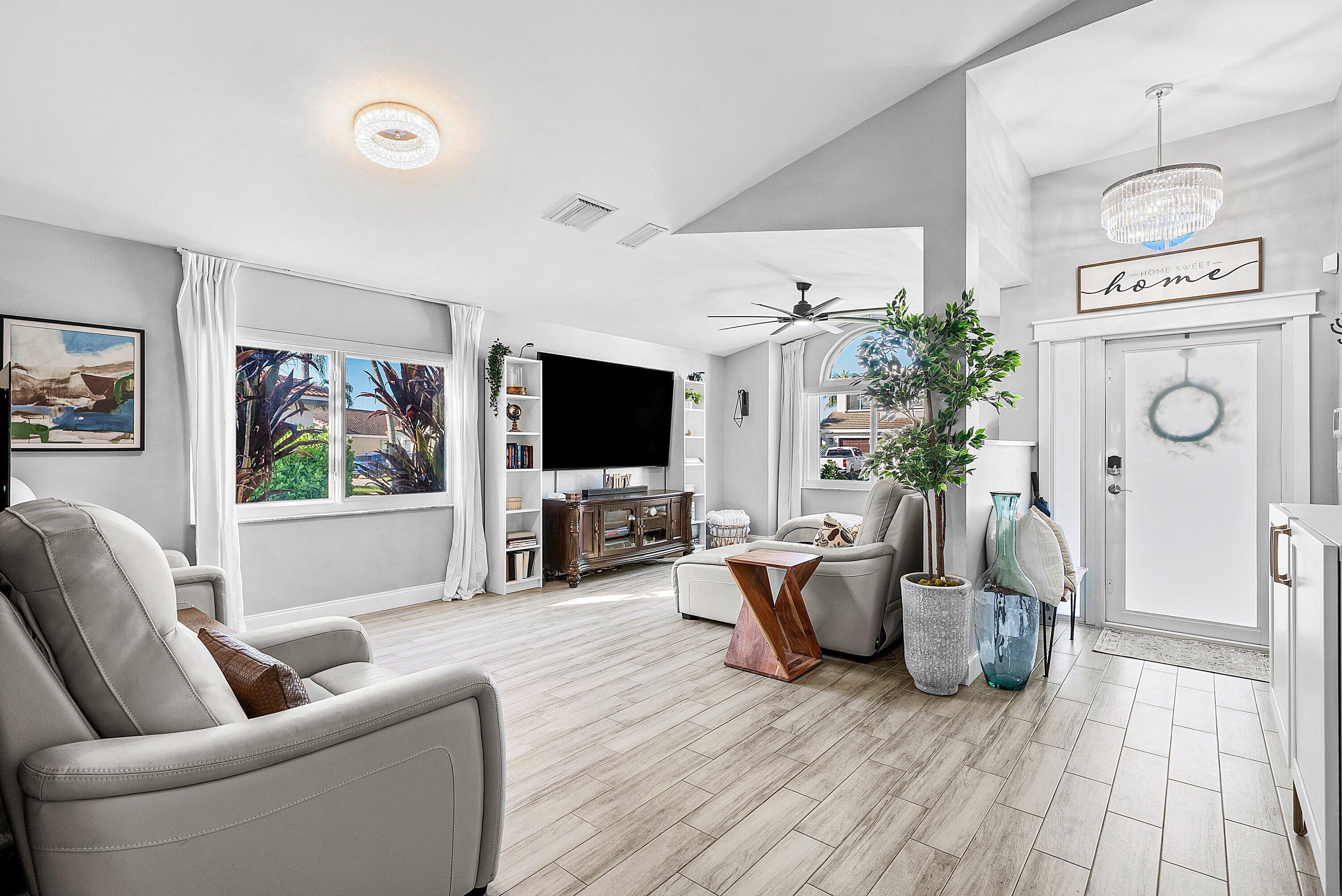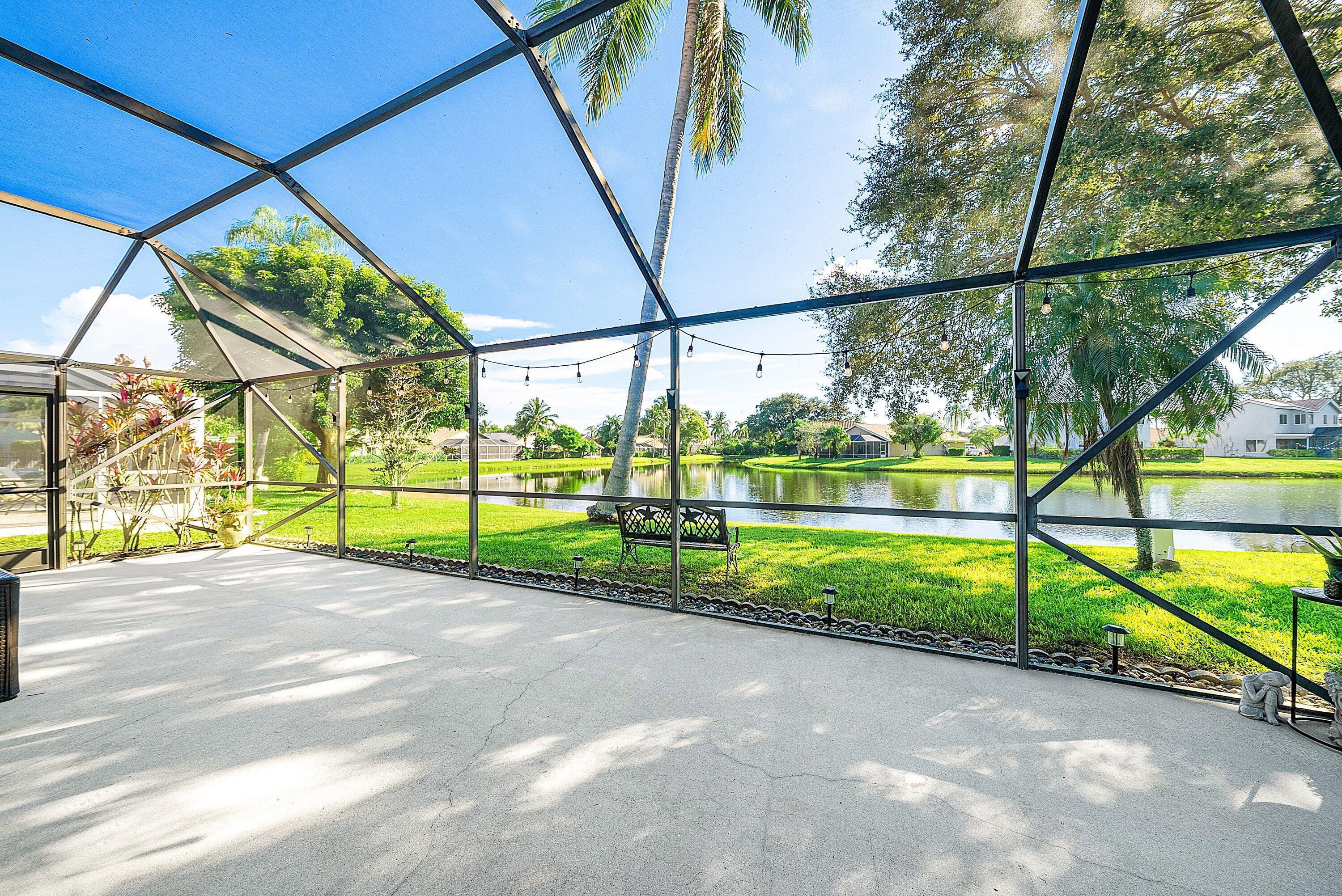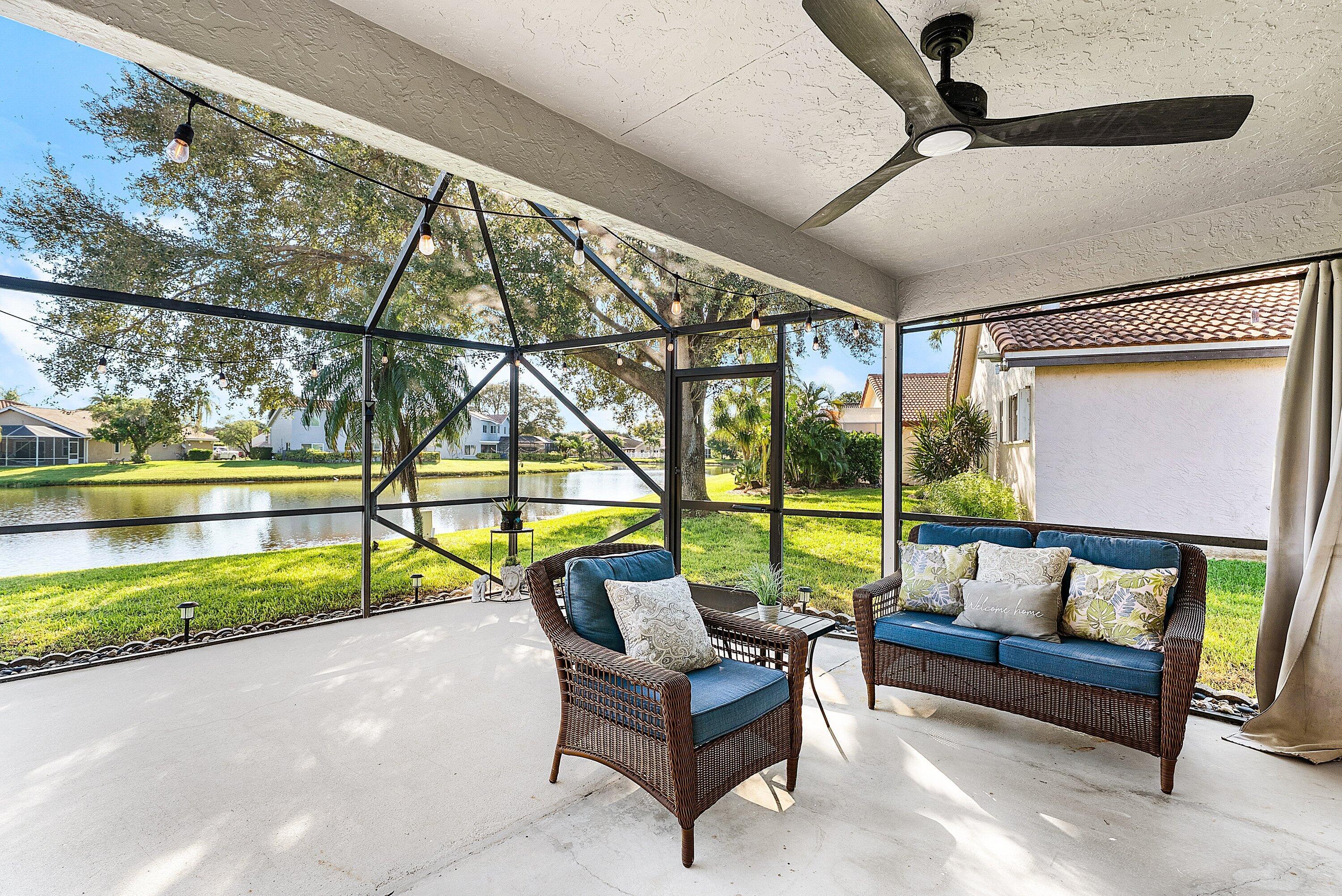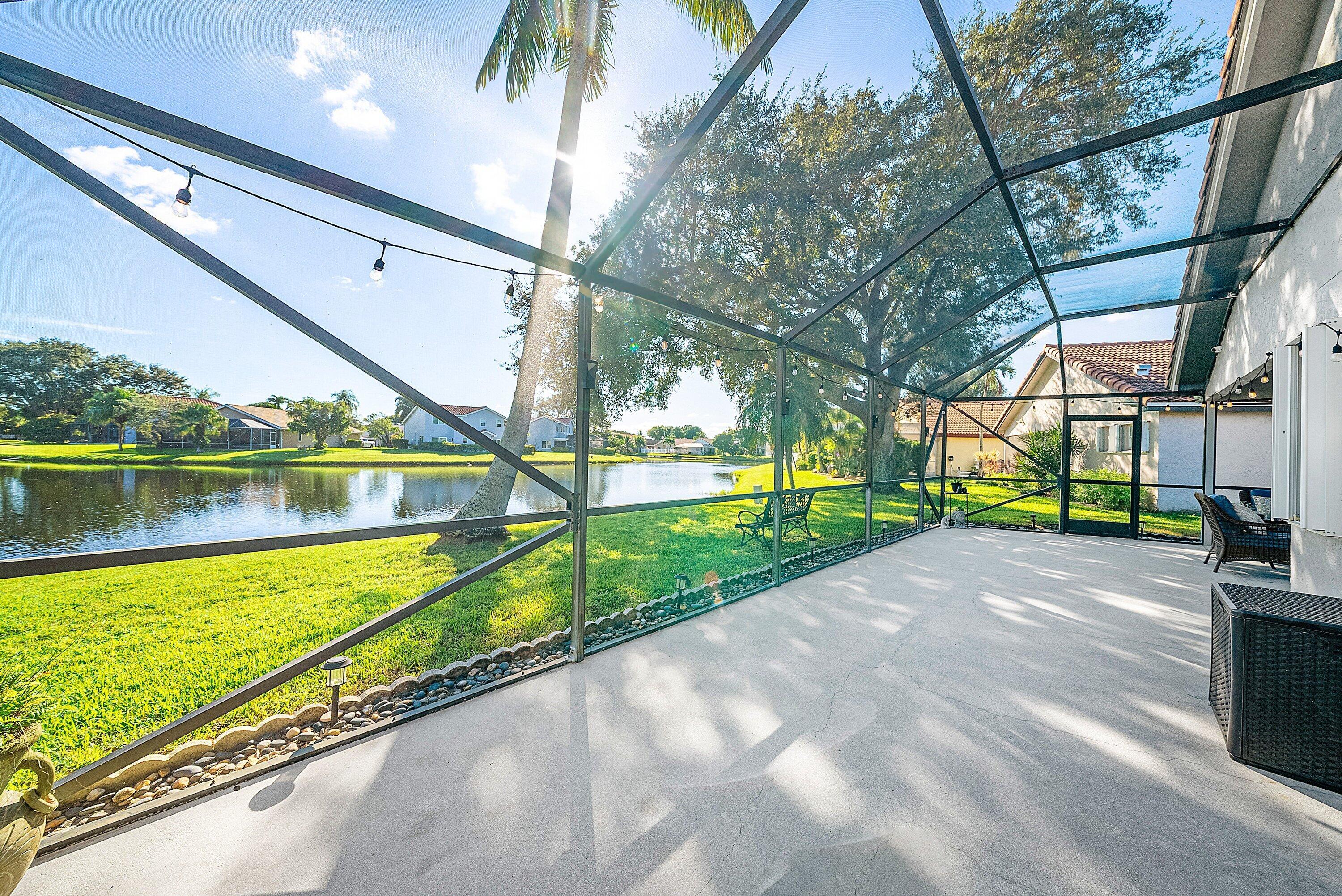 Welcome home to this beautifully renovated 3-bedroom, 2-bathroom lakefront residence with a 2-car garage, perfectly situated in the sought-after community of The Colors. This home combines comfort and style in an ideal location, zoned for top-rated schools including Crystal Lakes Elementary, Christa McAuliffe Middle, and Park Vista Community High. The moment you enter through the impact privacy glass front door, you'll immediately notice the refined touches and thoughtful updates throughout. Highlights include vertically laid wood look tile flooring, 10 foot vaulted ceilings, and updated trim, lighting, and fixtures that create a warm and contemporary feel. Significant updates include a full remodel of the floors, kitchen, and bathrooms (2021), impact windows and doors,mini split A/C in the garage, newly epoxied garage floor, new irrigation motor, freshly painted exterior with updated trim, a hard wired security camera system, newer HVAC with all ductwork replaced, newer electrical panel, newer appliances, all new light and fan fixtures, a custom primary closet, custom built ins and new screening on the lanai, The meticulously updated kitchen showcases solid wood shaker cabinetry with soft close hinges, white quartz countertops, and a stylish tile backsplash. Additional features include newer Samsung appliances, an oversized sink with disposal, updated hardware, a dedicated pantry, and a spacious snack bar with extra cabinetry. The adjacent dining area offers updated trim, pendant lighting, and an abundance of natural light through impact sliding glass doors. The spacious living room features a decorative wood accent wall, updated lighting, and abundant natural light through impact windows with modern blinds. The primary bedroom is generous in size, featuring vaulted ceilings, a large custom walk-in closet, and impact sliders that lead to your private lakefront screened patio. The en suite bathroom continues the modern design with solid wood shaker cabinetry, quartz countertops with dual sinks with updated hardware, updated fixtures, and a fully tiled walk-in shower with frameless glass door. Both secondary bedrooms are well sized, one with custom built in shelving, and both featuring wood look tile flooring, ample closet space, and plenty of natural light. The secondary bathroom mirrors the home's quality finishes with matching shaker cabinetry, quartz countertop, floating shelving, and a fully tiled shower tub combo with niche shelving and updated fixtures and hardware. The nearby laundry area includes newer washer and dryer, additional shelving, and updated doors. Step outside to your expansive private lakefront screened patio, the perfect space to enjoy morning coffee or unwind in the evening while taking in peaceful water views. Residents enjoy a range of community amenities such as a pool, tennis and basketball courts, and open green spaces. The low monthly HOA also includes cable, internet, and maintenance of common areas. Offering the perfect blend of comfort, convenience, and community, this home captures the best of South Florida living with modern updates, serene lake views, and a location that truly fits today's lifestyle.