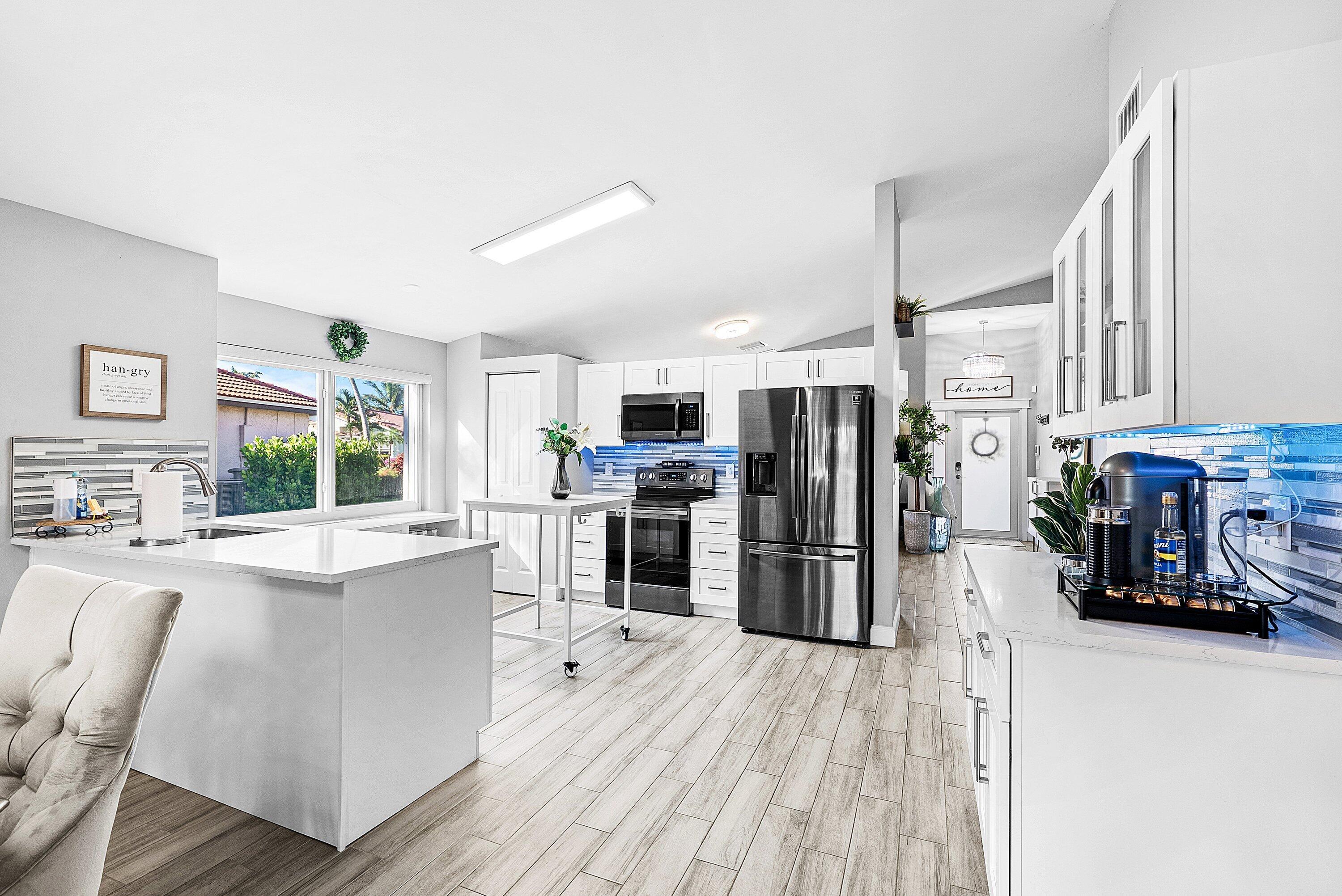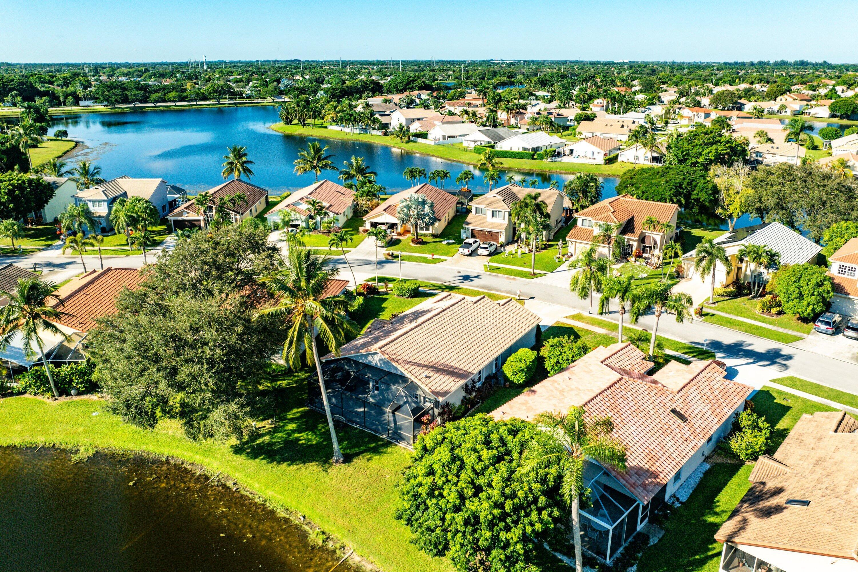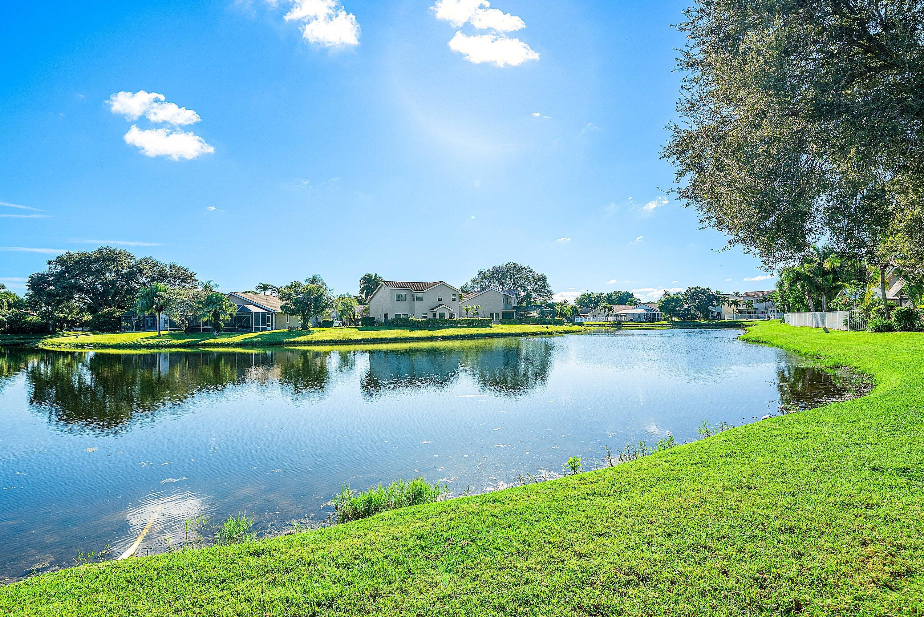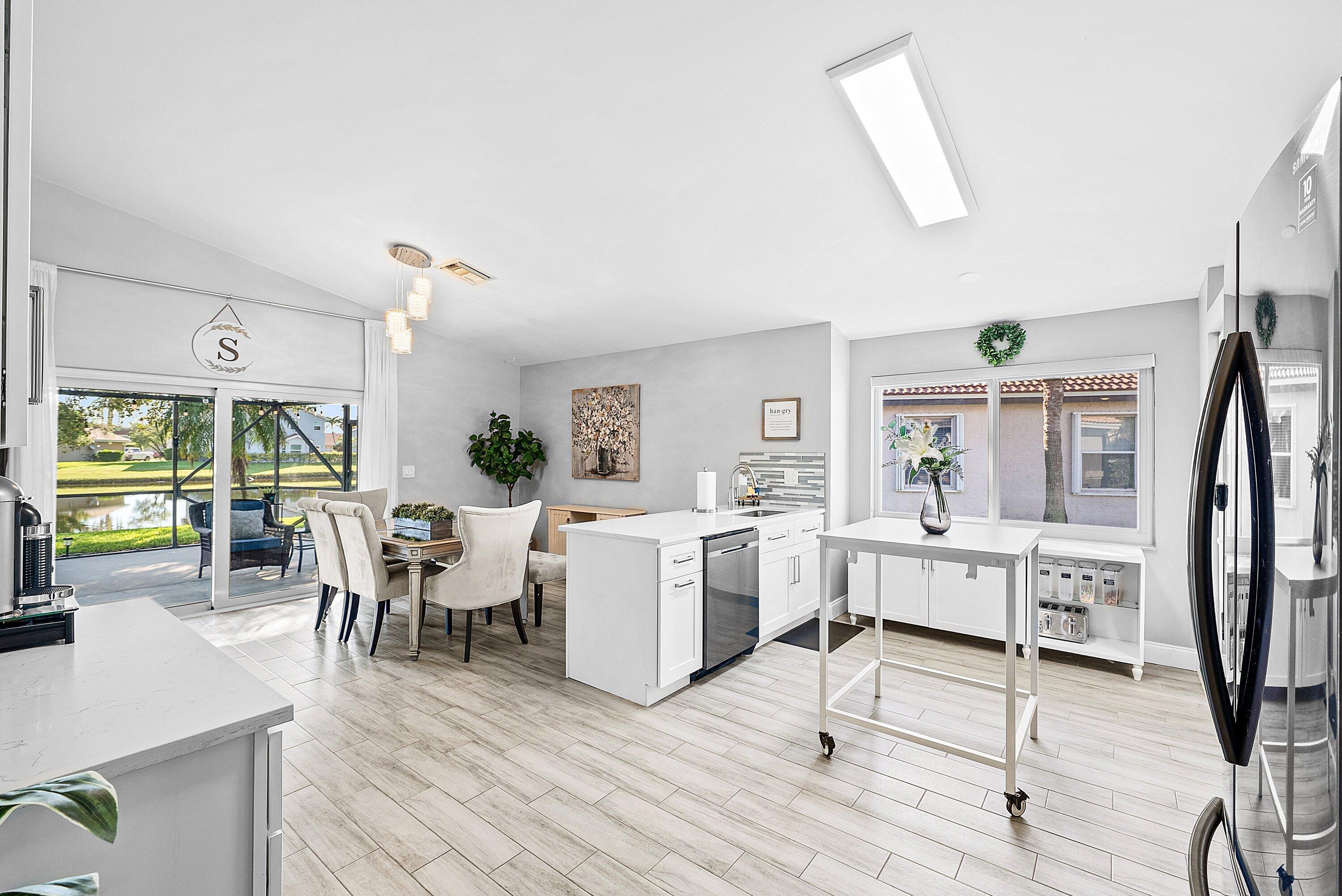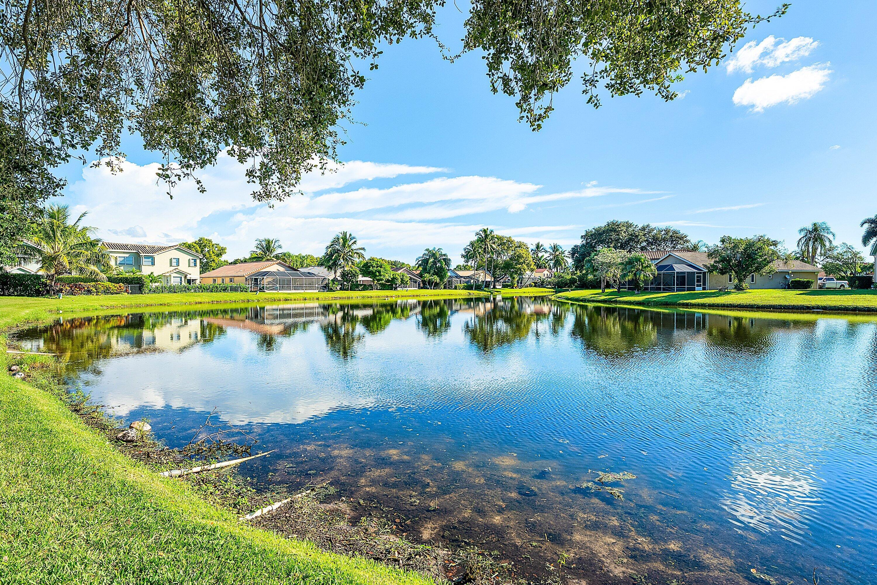 Welcome home to this beautifully renovated 3-bedroom, 2-bathroom lakefront residence with a 2-car garage, perfectly situated in the sought-after community of The Colors. This home combines comfort and style in an ideal location, zoned for top-rated schools including Crystal Lakes Elementary, Christa McAuliffe Middle, and Park Vista Community High. The moment you enter through the impact privacy glass front door, you'll immediately notice the refined touches and thoughtful updates throughout. Highlights include vertically laid wood look tile flooring, 10 foot vaulted ceilings, and updated trim, lighting, and fixtures that create a warm and contemporary feel. Significant updates include a full remodel of the floors, kitchen, and bathrooms (2021), impact windows and doors,mini split A/C in the garage, newly epoxied garage floor, new irrigation motor, freshly painted exterior with updated trim, a hard wired security camera system, newer HVAC with all ductwork replaced, newer electrical panel, newer appliances, all new light and fan fixtures, a custom primary closet, custom built ins and new screening on the lanai, The meticulously updated kitchen showcases solid wood shaker cabinetry with soft close hinges, white quartz countertops, and a stylish tile backsplash. Additional features include newer Samsung appliances, an oversized sink with disposal, updated hardware, a dedicated pantry, and a spacious snack bar with extra cabinetry. The adjacent dining area offers updated trim, pendant lighting, and an abundance of natural light through impact sliding glass doors. The spacious living room features a decorative wood accent wall, updated lighting, and abundant natural light through impact windows with modern blinds. The primary bedroom is generous in size, featuring vaulted ceilings, a large custom walk-in closet, and impact sliders that lead to your private lakefront screened patio. The en suite bathroom continues the modern design with solid wood shaker cabinetry, quartz countertops with dual sinks with updated hardware, updated fixtures, and a fully tiled walk-in shower with frameless glass door. Both secondary bedrooms are well sized, one with custom built in shelving, and both featuring wood look tile flooring, ample closet space, and plenty of natural light. The secondary bathroom mirrors the home's quality finishes with matching shaker cabinetry, quartz countertop, floating shelving, and a fully tiled shower tub combo with niche shelving and updated fixtures and hardware. The nearby laundry area includes newer washer and dryer, additional shelving, and updated doors. Step outside to your expansive private lakefront screened patio, the perfect space to enjoy morning coffee or unwind in the evening while taking in peaceful water views. Residents enjoy a range of community amenities such as a pool, tennis and basketball courts, and open green spaces. The low monthly HOA also includes cable, internet, and maintenance of common areas. Offering the perfect blend of comfort, convenience, and community, this home captures the best of South Florida living with modern updates, serene lake views, and a location that truly fits today's lifestyle.