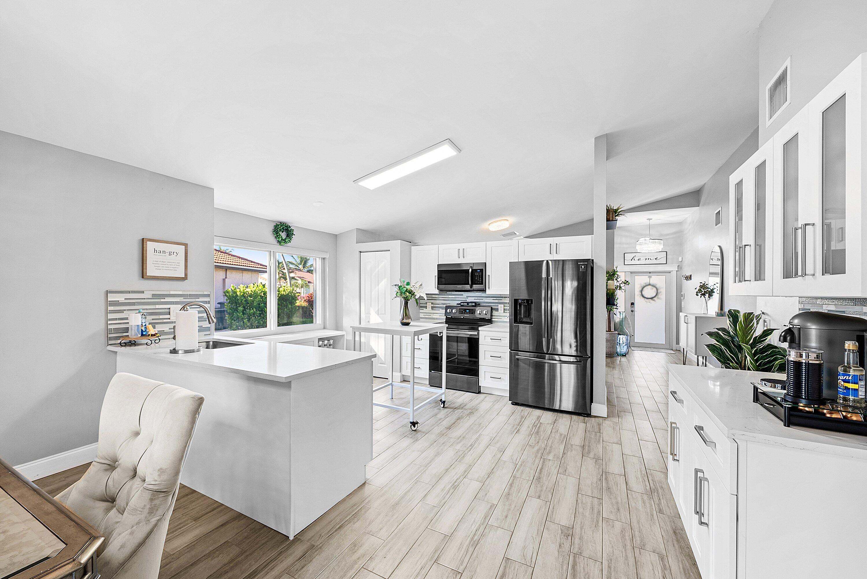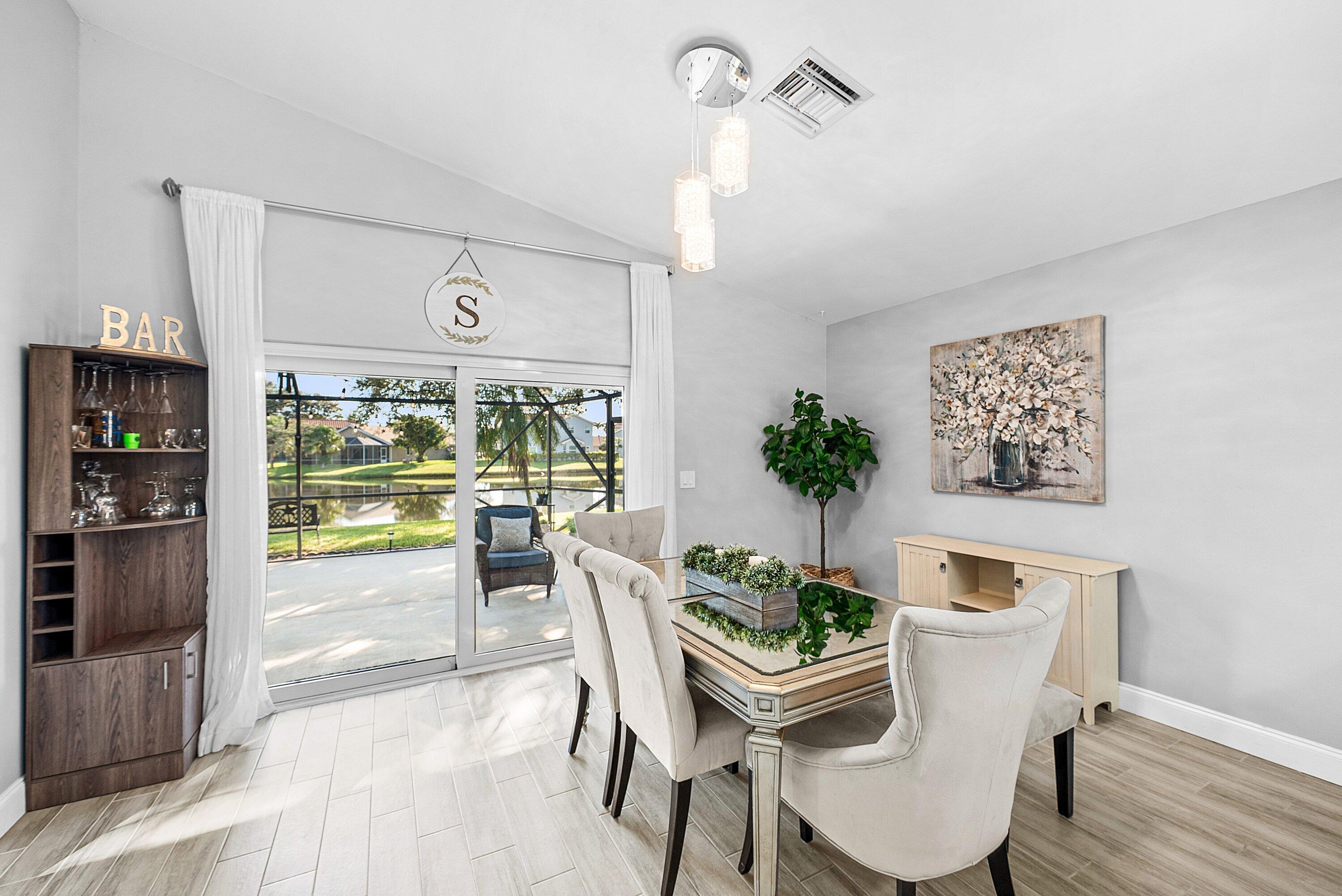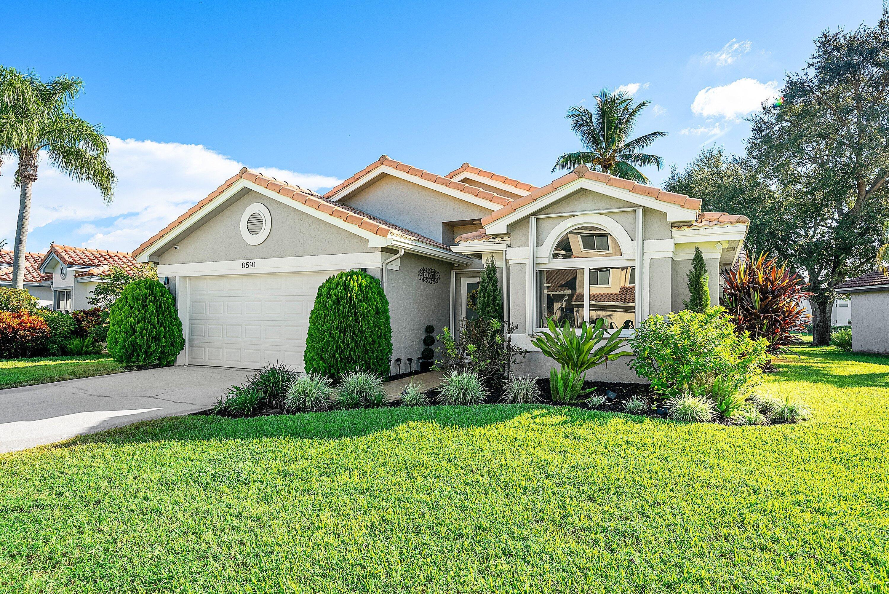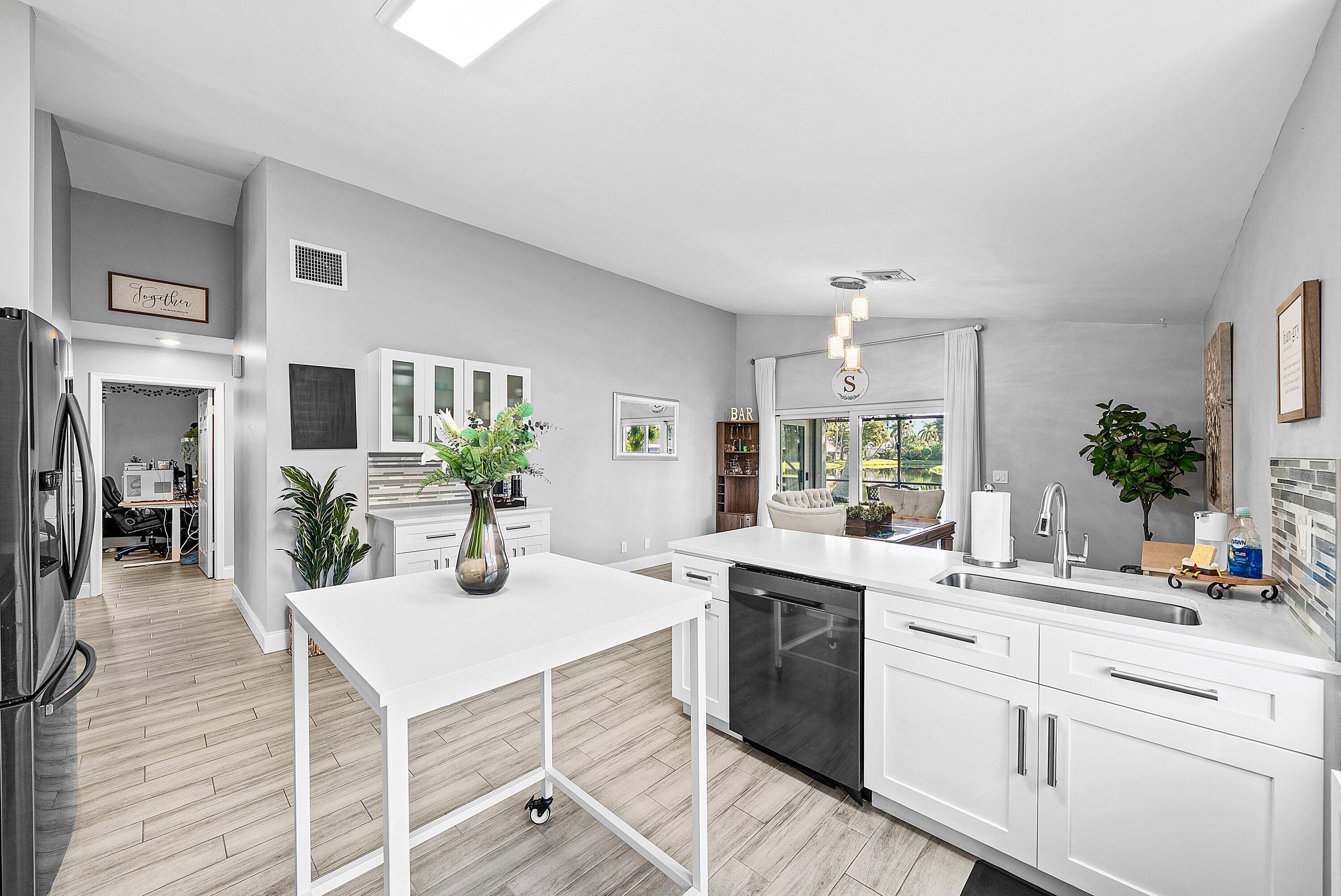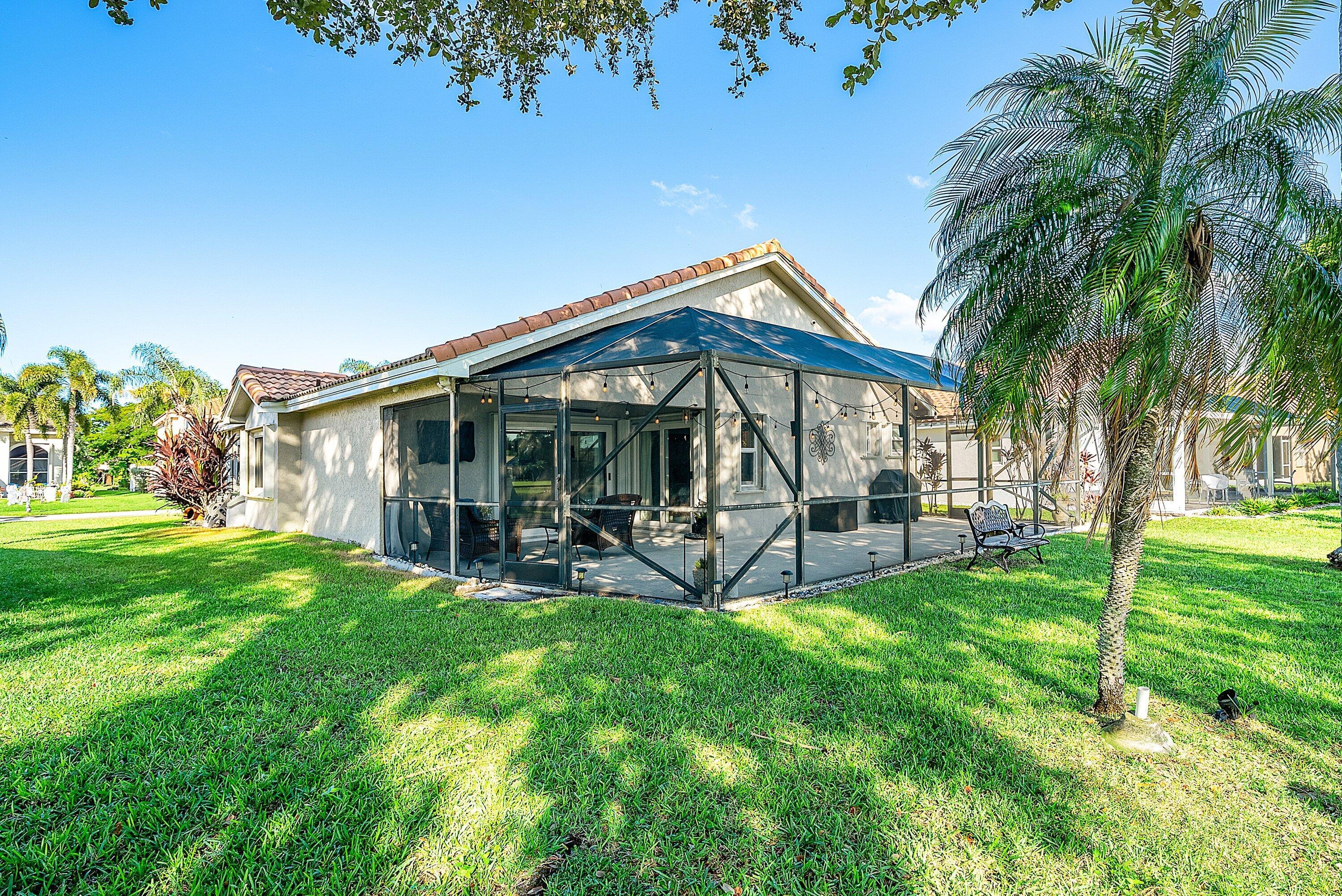 Welcome home to this beautifully renovated 3-bedroom, 2-bathroom lakefront residence with a 2-car garage, perfectly situated in the sought-after community of The Colors. This home combines comfort and style in an ideal location, zoned for top-rated schools including Crystal Lakes Elementary, Christa McAuliffe Middle, and Park Vista Community High. The moment you enter through the impact privacy glass front door, you'll immediately notice the refined touches and thoughtful updates throughout. Highlights include vertically laid wood look tile flooring, 10 foot vaulted ceilings, and updated trim, lighting, and fixtures that create a warm and contemporary feel. Significant updates include a full remodel of the floors, kitchen, and bathrooms (2021), impact windows and doors,mini split A/C in the garage, newly epoxied garage floor, new irrigation motor, freshly painted exterior with updated trim, a hard wired security camera system, newer HVAC with all ductwork replaced, newer electrical panel, newer appliances, all new light and fan fixtures, a custom primary closet, custom built ins and new screening on the lanai, The meticulously updated kitchen showcases solid wood shaker cabinetry with soft close hinges, white quartz countertops, and a stylish tile backsplash. Additional features include newer Samsung appliances, an oversized sink with disposal, updated hardware, a dedicated pantry, and a spacious snack bar with extra cabinetry. The adjacent dining area offers updated trim, pendant lighting, and an abundance of natural light through impact sliding glass doors. The spacious living room features a decorative wood accent wall, updated lighting, and abundant natural light through impact windows with modern blinds. The primary bedroom is generous in size, featuring vaulted ceilings, a large custom walk-in closet, and impact sliders that lead to your private lakefront screened patio. The en suite bathroom continues the modern design with solid wood shaker cabinetry, quartz countertops with dual sinks with updated hardware, updated fixtures, and a fully tiled walk-in shower with frameless glass door. Both secondary bedrooms are well sized, one with custom built in shelving, and both featuring wood look tile flooring, ample closet space, and plenty of natural light. The secondary bathroom mirrors the home's quality finishes with matching shaker cabinetry, quartz countertop, floating shelving, and a fully tiled shower tub combo with niche shelving and updated fixtures and hardware. The nearby laundry area includes newer washer and dryer, additional shelving, and updated doors. Step outside to your expansive private lakefront screened patio, the perfect space to enjoy morning coffee or unwind in the evening while taking in peaceful water views. Residents enjoy a range of community amenities such as a pool, tennis and basketball courts, and open green spaces. The low monthly HOA also includes cable, internet, and maintenance of common areas. Offering the perfect blend of comfort, convenience, and community, this home captures the best of South Florida living with modern updates, serene lake views, and a location that truly fits today's lifestyle.