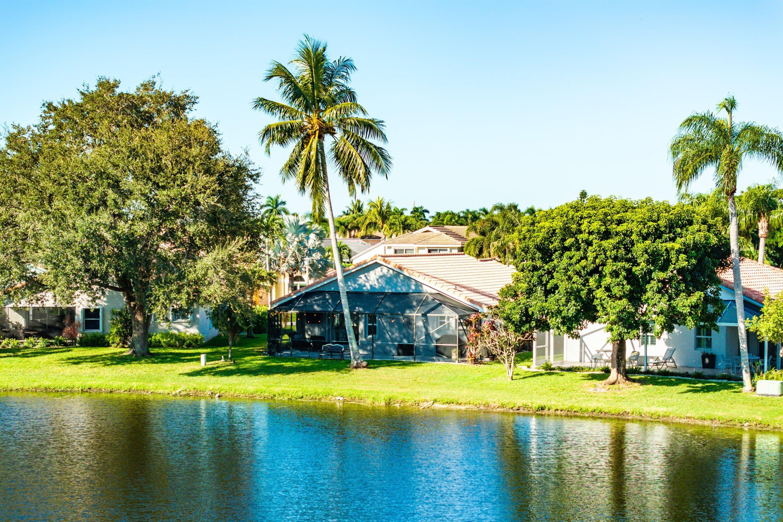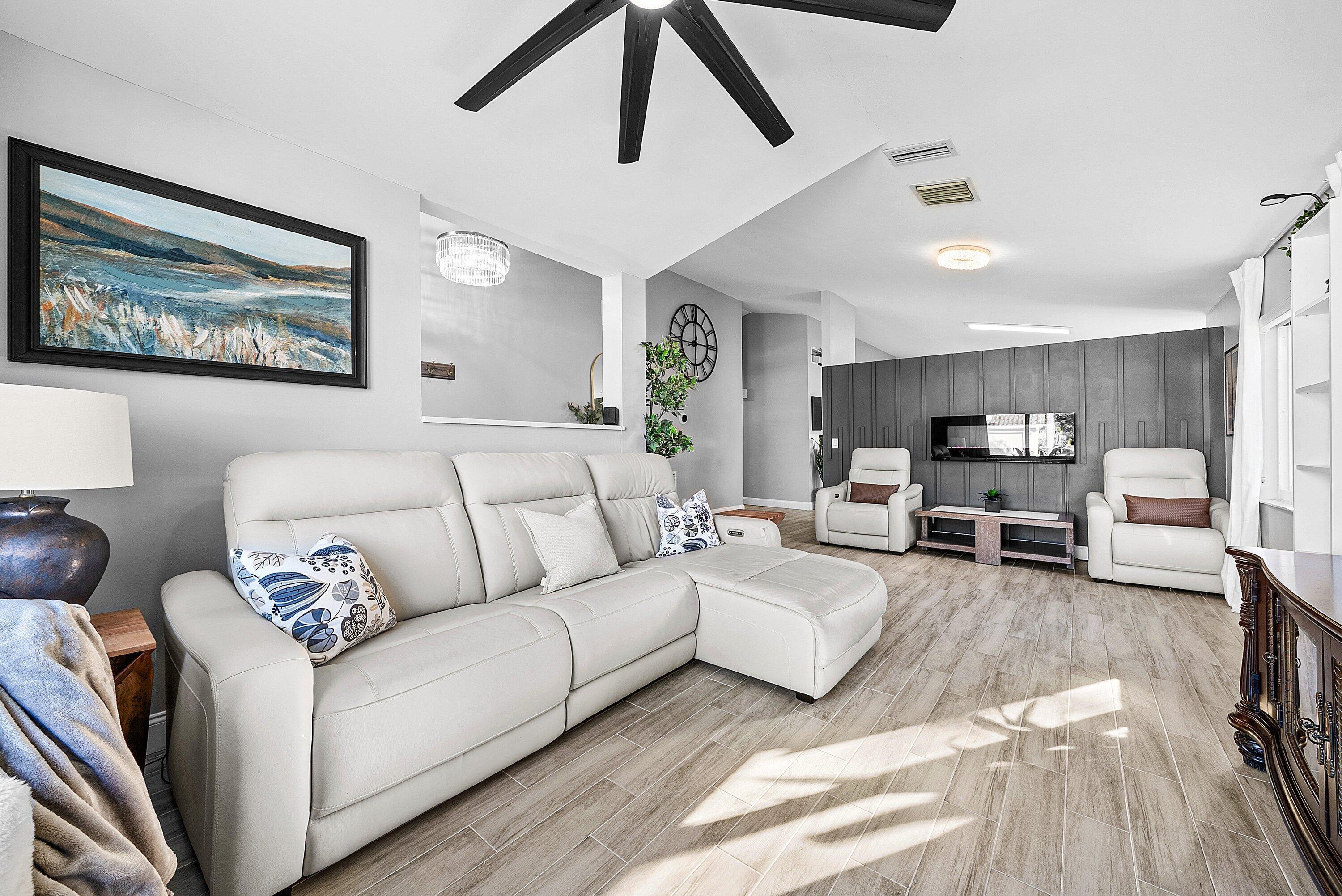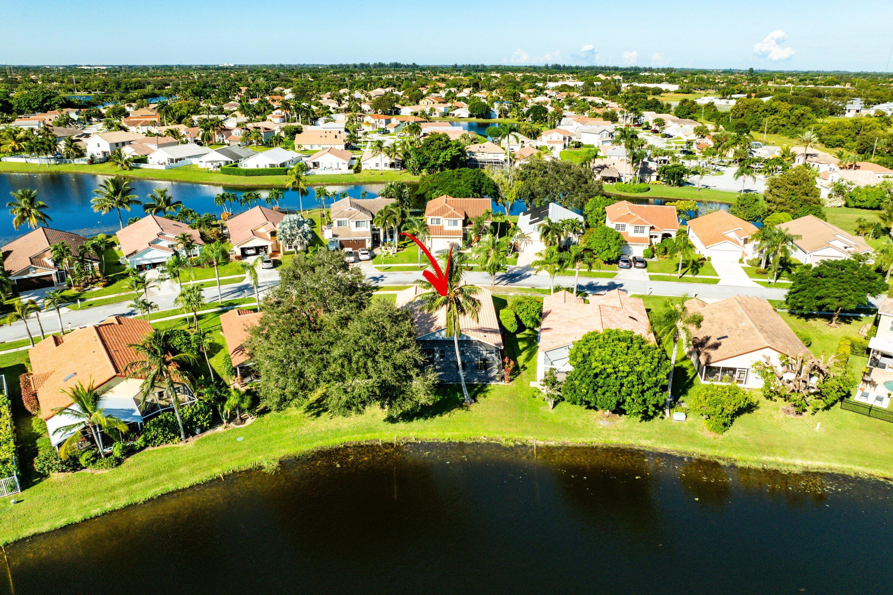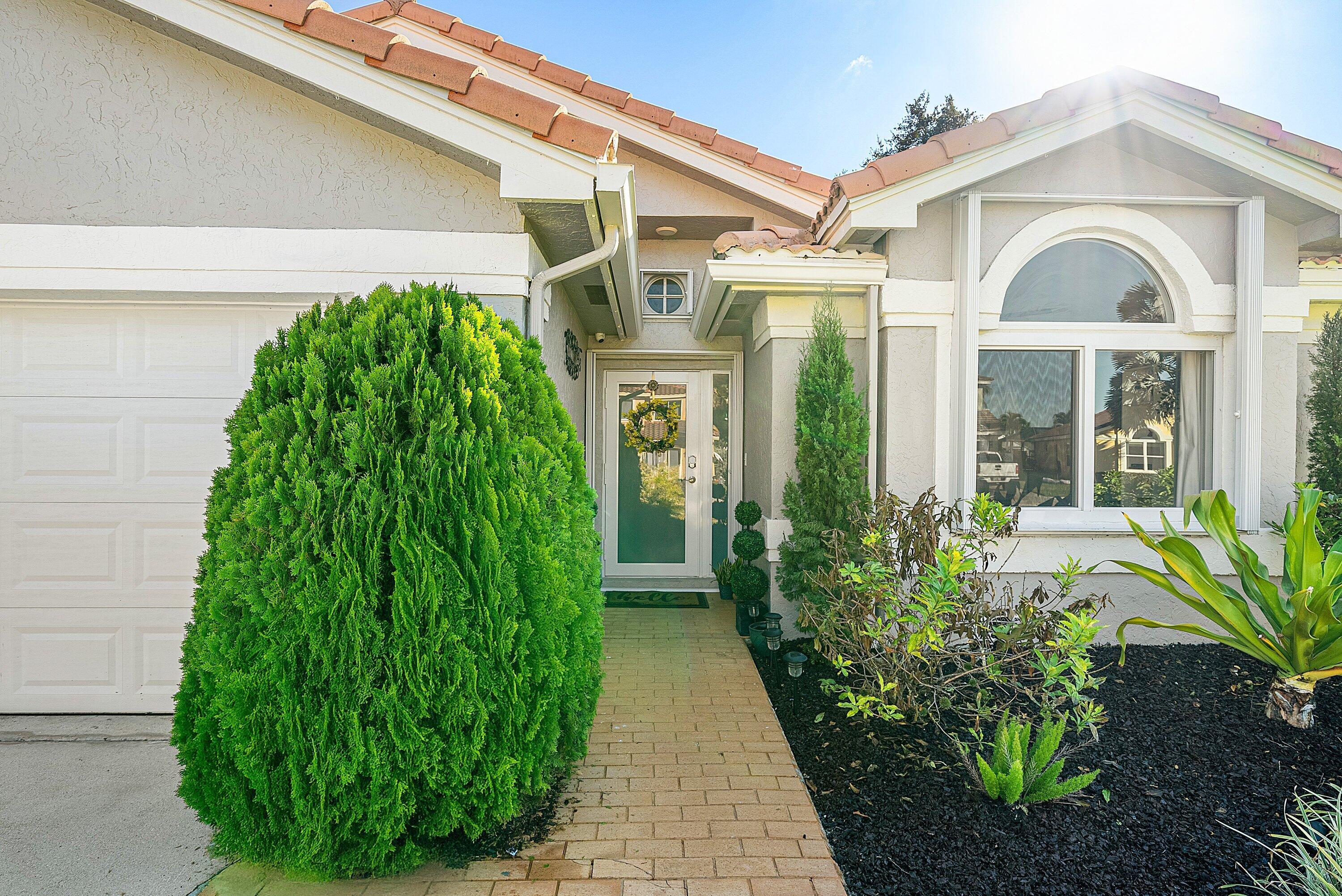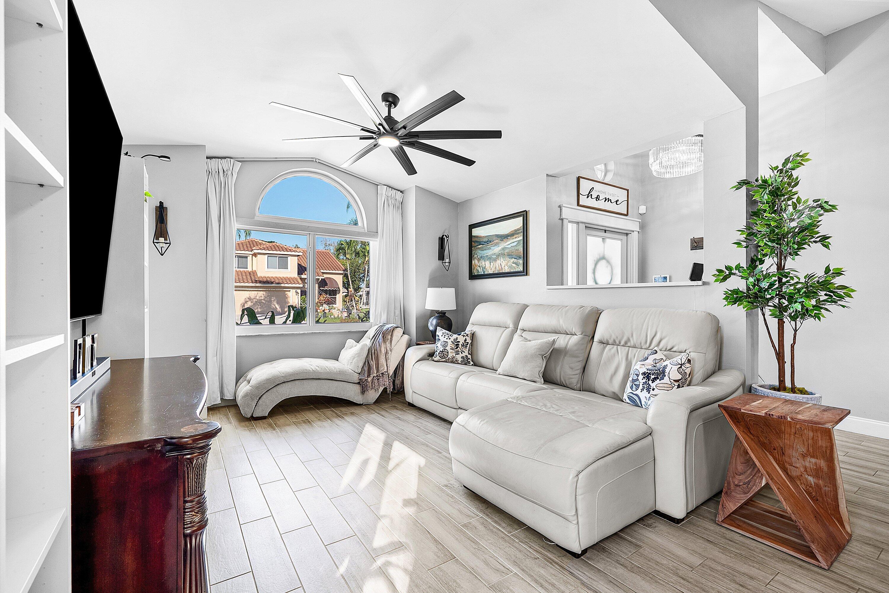 Welcome home to this beautifully renovated 3-bedroom, 2-bathroom lakefront residence with a 2-car garage, perfectly situated in the sought-after community of The Colors. This home combines comfort and style in an ideal location, zoned for top-rated schools including Crystal Lakes Elementary, Christa McAuliffe Middle, and Park Vista Community High. The moment you enter through the impact privacy glass front door, you'll immediately notice the refined touches and thoughtful updates throughout. Highlights include vertically laid wood look tile flooring, 10 foot vaulted ceilings, and updated trim, lighting, and fixtures that create a warm and contemporary feel. Significant updates include a full remodel of the floors, kitchen, and bathrooms (2021), impact windows and doors,mini split A/C in the garage, newly epoxied garage floor, new irrigation motor, freshly painted exterior with updated trim, a hard wired security camera system, newer HVAC with all ductwork replaced, newer electrical panel, newer appliances, all new light and fan fixtures, a custom primary closet, custom built ins and new screening on the lanai, The meticulously updated kitchen showcases solid wood shaker cabinetry with soft close hinges, white quartz countertops, and a stylish tile backsplash. Additional features include newer Samsung appliances, an oversized sink with disposal, updated hardware, a dedicated pantry, and a spacious snack bar with extra cabinetry. The adjacent dining area offers updated trim, pendant lighting, and an abundance of natural light through impact sliding glass doors. The spacious living room features a decorative wood accent wall, updated lighting, and abundant natural light through impact windows with modern blinds. The primary bedroom is generous in size, featuring vaulted ceilings, a large custom walk-in closet, and impact sliders that lead to your private lakefront screened patio. The en suite bathroom continues the modern design with solid wood shaker cabinetry, quartz countertops with dual sinks with updated hardware, updated fixtures, and a fully tiled walk-in shower with frameless glass door. Both secondary bedrooms are well sized, one with custom built in shelving, and both featuring wood look tile flooring, ample closet space, and plenty of natural light. The secondary bathroom mirrors the home's quality finishes with matching shaker cabinetry, quartz countertop, floating shelving, and a fully tiled shower tub combo with niche shelving and updated fixtures and hardware. The nearby laundry area includes newer washer and dryer, additional shelving, and updated doors. Step outside to your expansive private lakefront screened patio, the perfect space to enjoy morning coffee or unwind in the evening while taking in peaceful water views. Residents enjoy a range of community amenities such as a pool, tennis and basketball courts, and open green spaces. The low monthly HOA also includes cable, internet, and maintenance of common areas. Offering the perfect blend of comfort, convenience, and community, this home captures the best of South Florida living with modern updates, serene lake views, and a location that truly fits today's lifestyle.