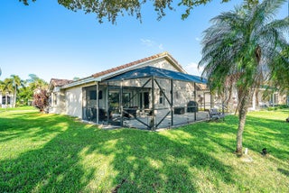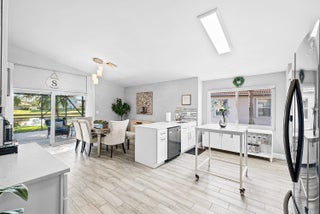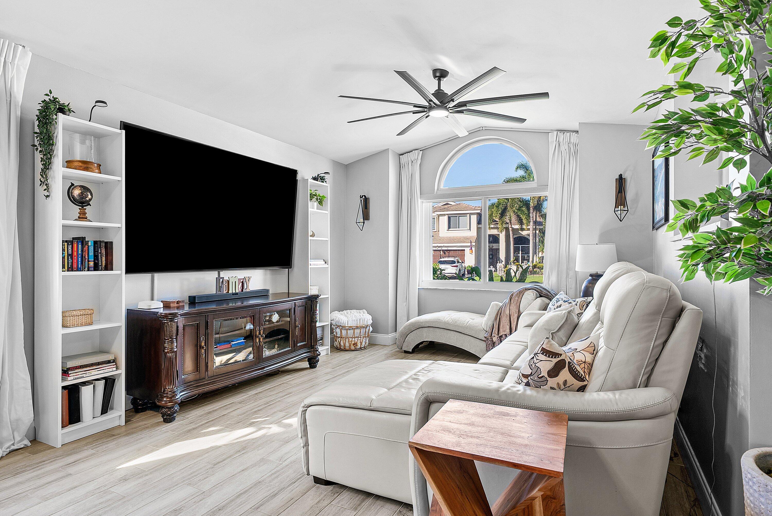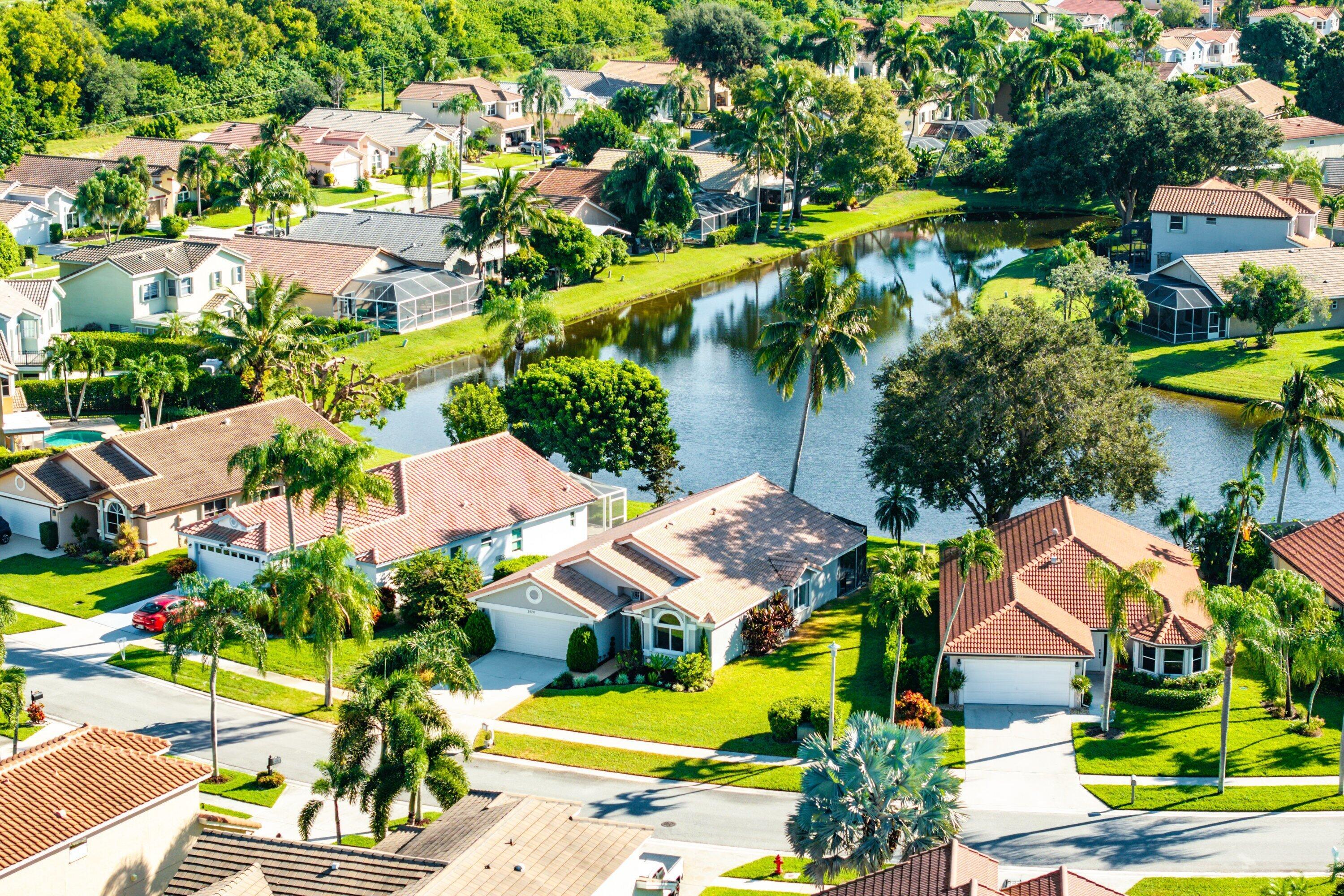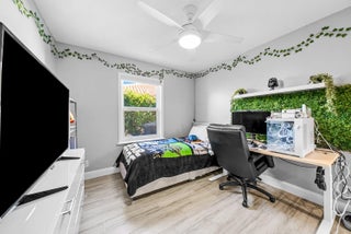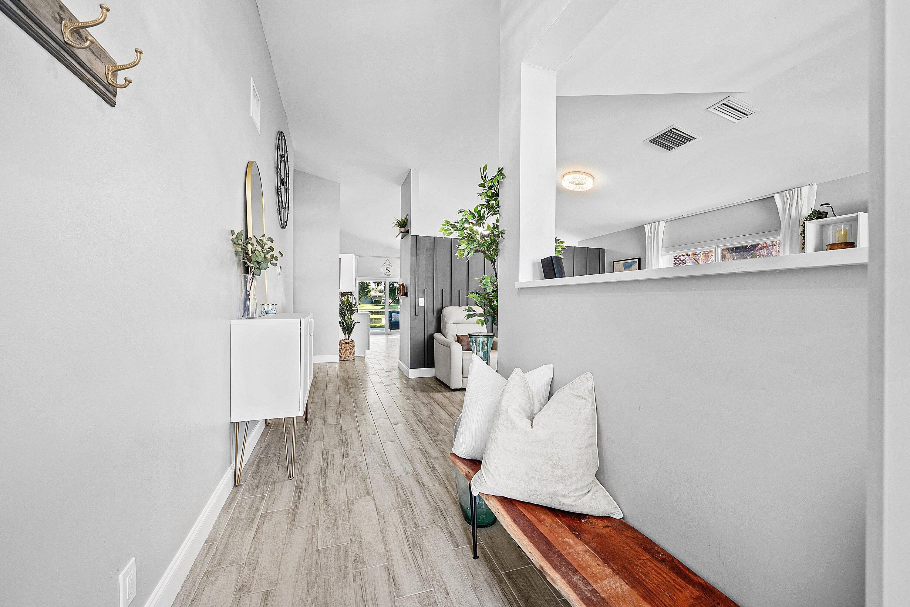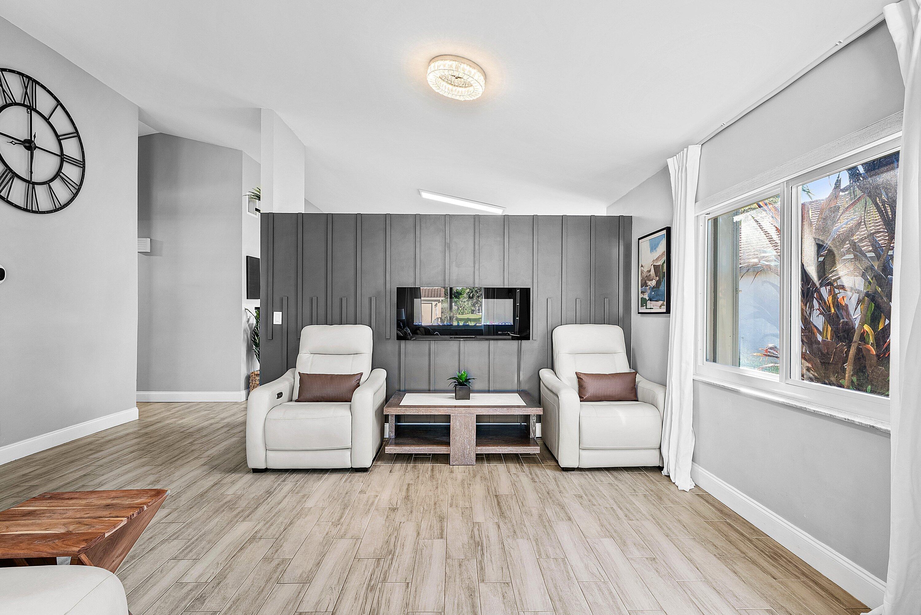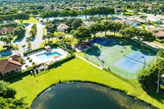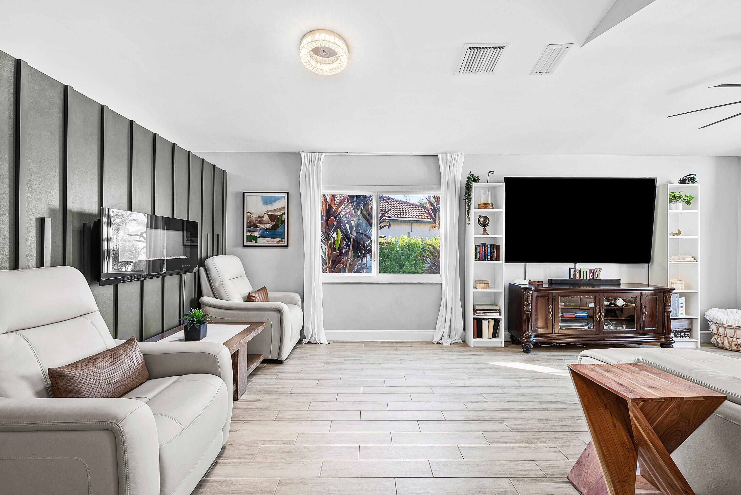 Welcome home to this beautifully renovated 3-bedroom, 2-bathroom lakefront residence with a 2-car garage, perfectly situated in the sought-after community of The Colors. This home combines comfort and style in an ideal location, zoned for top-rated schools including Crystal Lakes Elementary, Christa McAuliffe Middle, and Park Vista Community High. The moment you enter through the impact privacy glass front door, you'll immediately notice the refined touches and thoughtful updates throughout. Highlights include vertically laid wood look tile flooring, 10 foot vaulted ceilings, and updated trim, lighting, and fixtures that create a warm and contemporary feel. Significant updates include a full remodel of the floors, kitchen, and bathrooms (2021), impact windows and doors,mini split A/C in the garage, newly epoxied garage floor, new irrigation motor, freshly painted exterior with updated trim, a hard wired security camera system, newer HVAC with all ductwork replaced, newer electrical panel, newer appliances, all new light and fan fixtures, a custom primary closet, custom built ins and new screening on the lanai, The meticulously updated kitchen showcases solid wood shaker cabinetry with soft close hinges, white quartz countertops, and a stylish tile backsplash. Additional features include newer Samsung appliances, an oversized sink with disposal, updated hardware, a dedicated pantry, and a spacious snack bar with extra cabinetry. The adjacent dining area offers updated trim, pendant lighting, and an abundance of natural light through impact sliding glass doors. The spacious living room features a decorative wood accent wall, updated lighting, and abundant natural light through impact windows with modern blinds. The primary bedroom is generous in size, featuring vaulted ceilings, a large custom walk-in closet, and impact sliders that lead to your private lakefront screened patio. The en suite bathroom continues the modern design with solid wood shaker cabinetry, quartz countertops with dual sinks with updated hardware, updated fixtures, and a fully tiled walk-in shower with frameless glass door. Both secondary bedrooms are well sized, one with custom built in shelving, and both featuring wood look tile flooring, ample closet space, and plenty of natural light. The secondary bathroom mirrors the home's quality finishes with matching shaker cabinetry, quartz countertop, floating shelving, and a fully tiled shower tub combo with niche shelving and updated fixtures and hardware. The nearby laundry area includes newer washer and dryer, additional shelving, and updated doors. Step outside to your expansive private lakefront screened patio, the perfect space to enjoy morning coffee or unwind in the evening while taking in peaceful water views. Residents enjoy a range of community amenities such as a pool, tennis and basketball courts, and open green spaces. The low monthly HOA also includes cable, internet, and maintenance of common areas. Offering the perfect blend of comfort, convenience, and community, this home captures the best of South Florida living with modern updates, serene lake views, and a location that truly fits today's lifestyle.