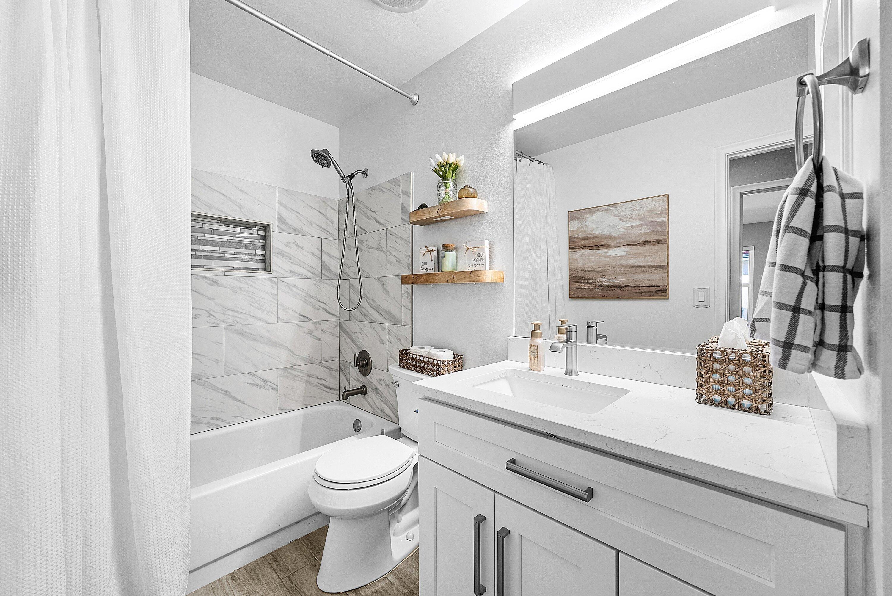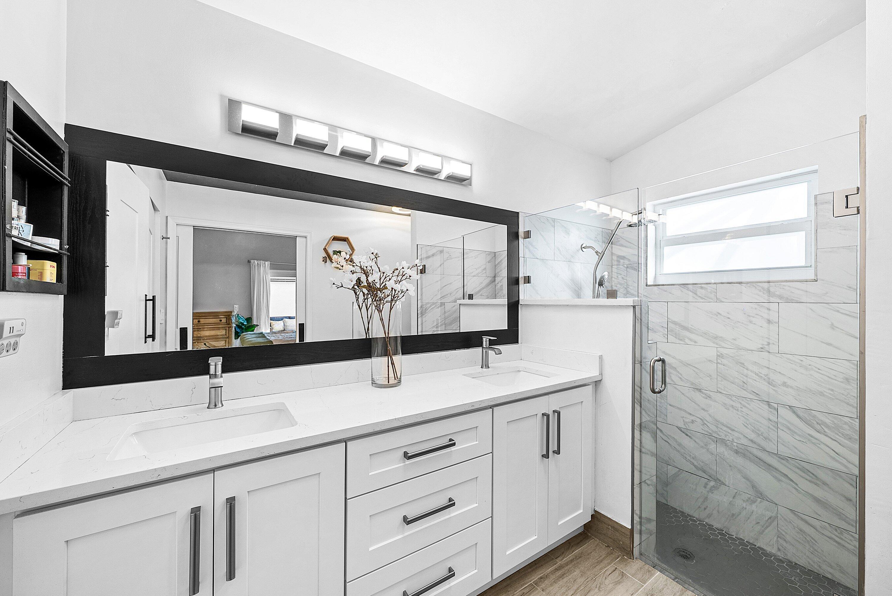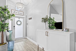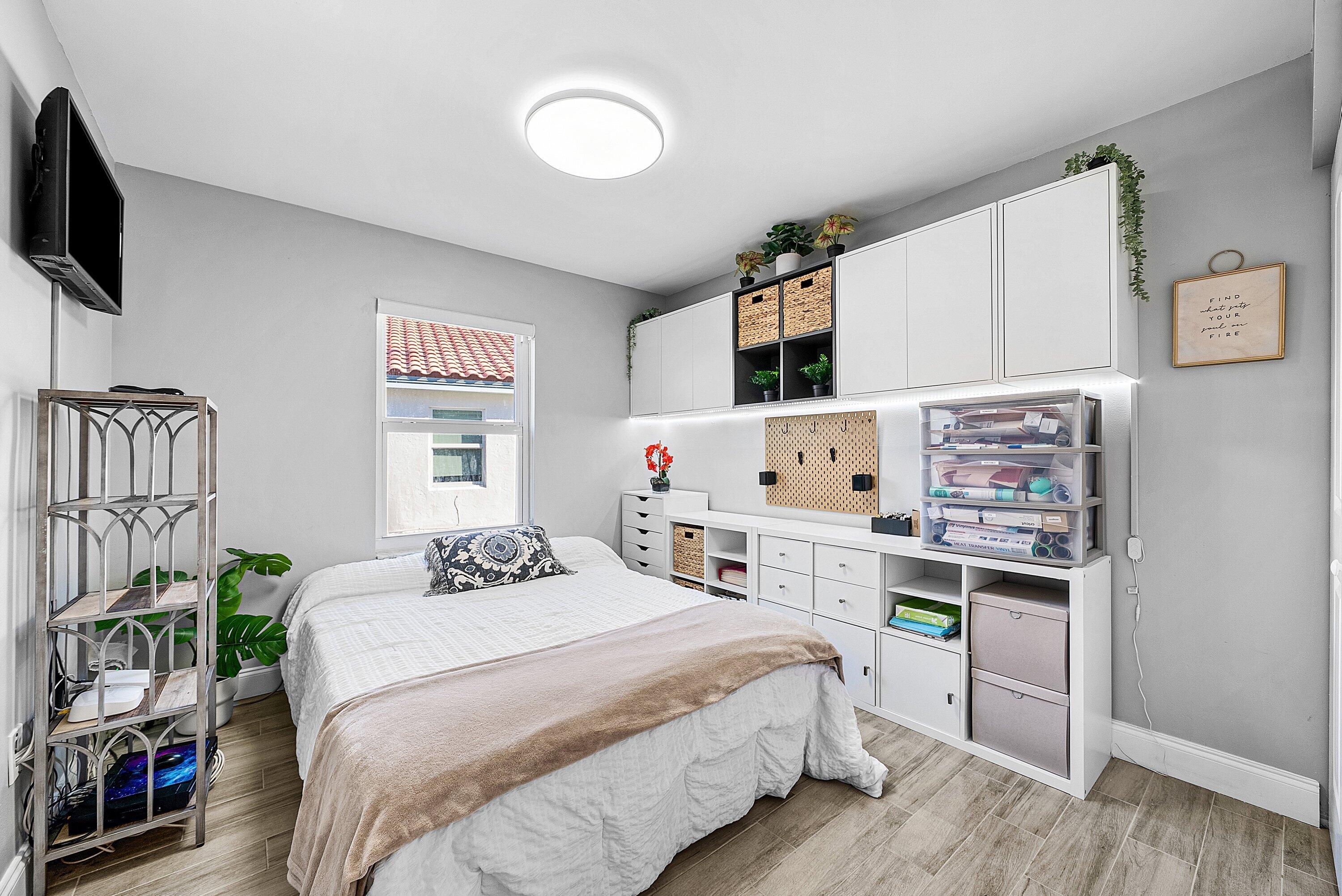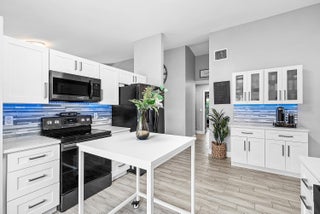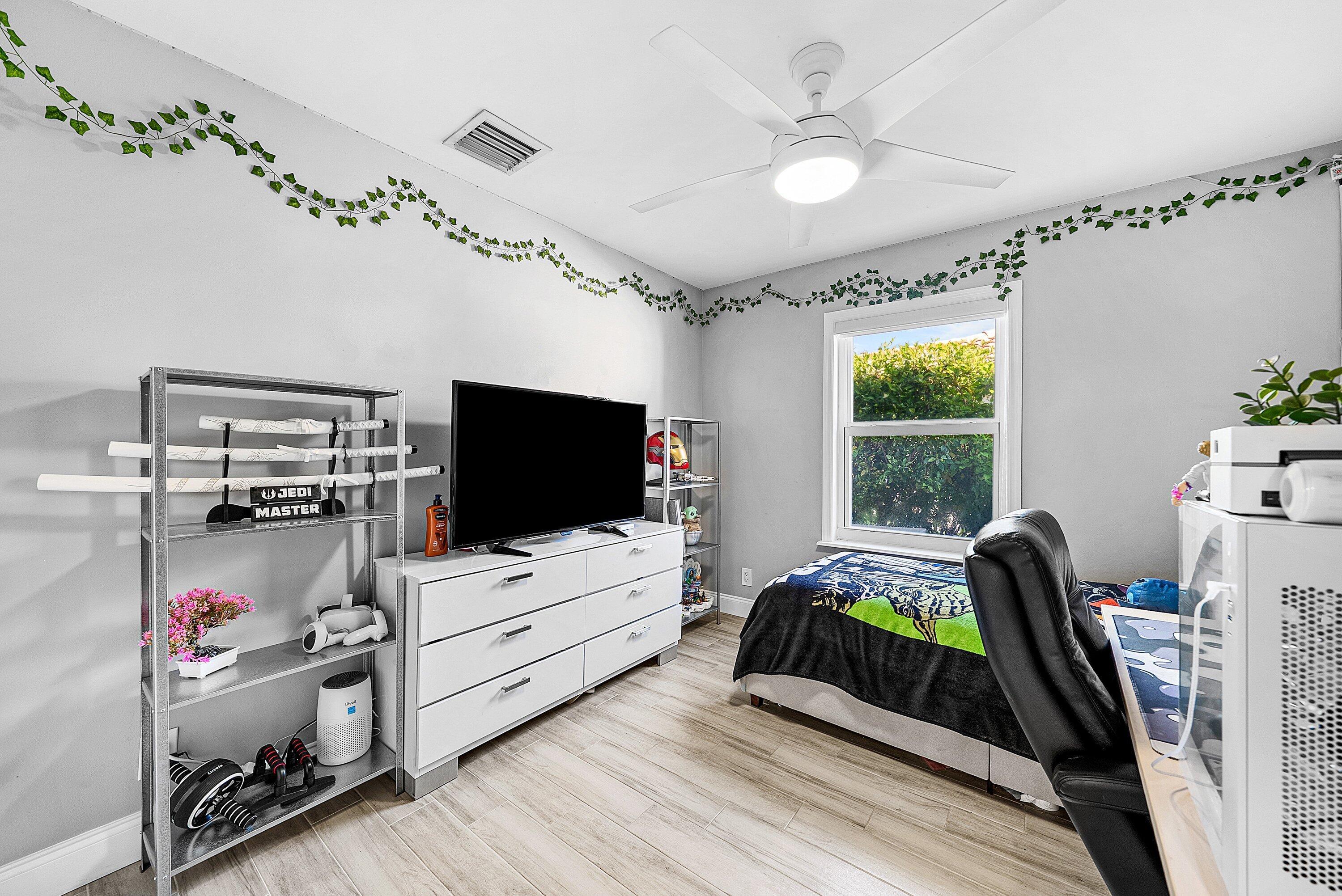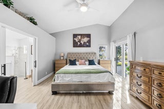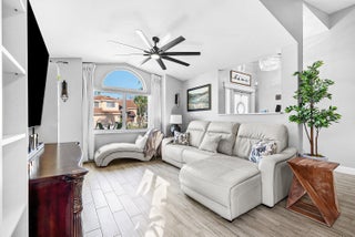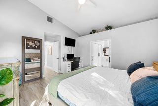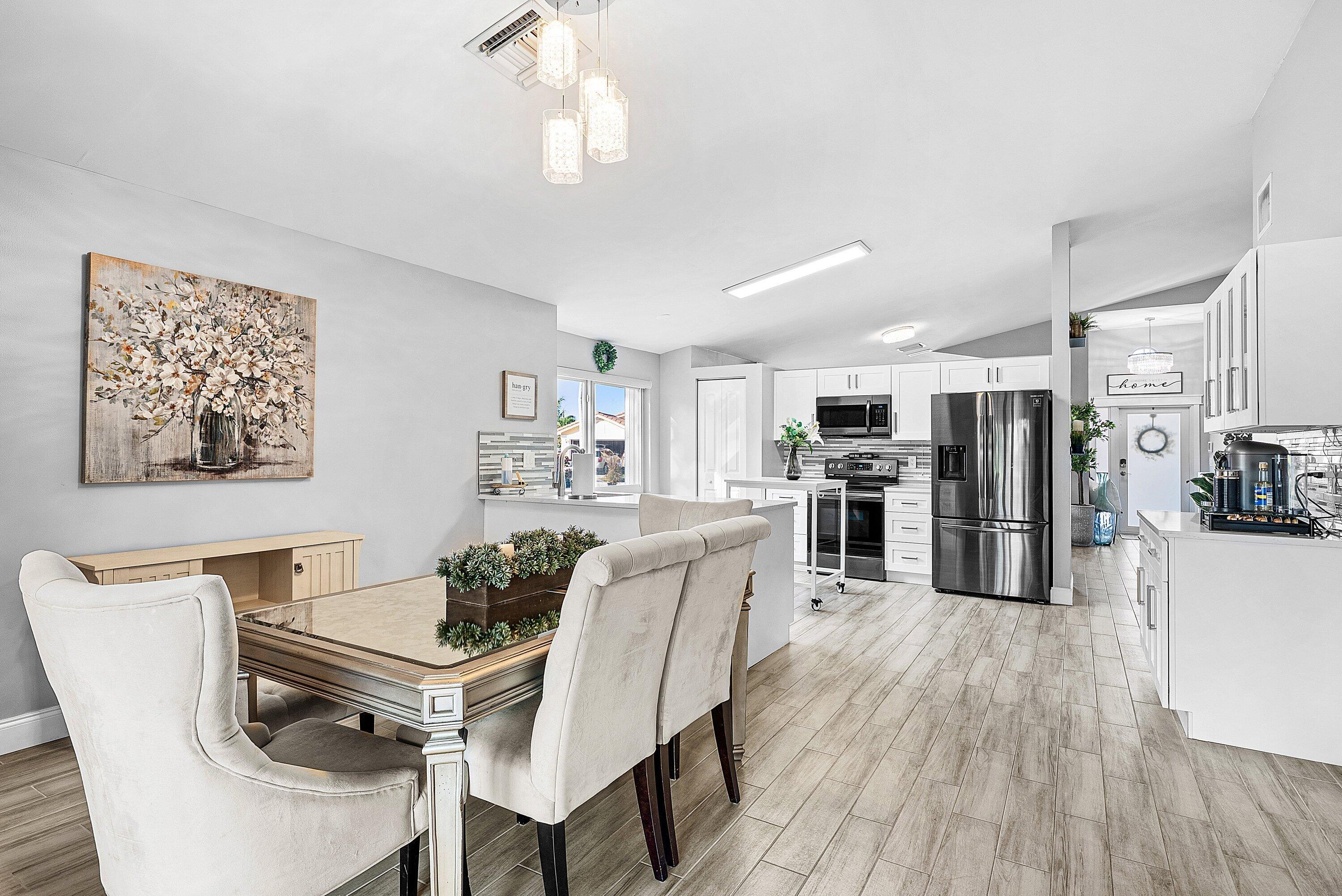 Welcome home to this beautifully renovated 3-bedroom, 2-bathroom lakefront residence with a 2-car garage, perfectly situated in the sought-after community of The Colors. This home combines comfort and style in an ideal location, zoned for top-rated schools including Crystal Lakes Elementary, Christa McAuliffe Middle, and Park Vista Community High. The moment you enter through the impact privacy glass front door, you'll immediately notice the refined touches and thoughtful updates throughout. Highlights include vertically laid wood look tile flooring, 10 foot vaulted ceilings, and updated trim, lighting, and fixtures that create a warm and contemporary feel. Significant updates include a full remodel of the floors, kitchen, and bathrooms (2021), impact windows and doors,mini split A/C in the garage, newly epoxied garage floor, new irrigation motor, freshly painted exterior with updated trim, a hard wired security camera system, newer HVAC with all ductwork replaced, newer electrical panel, newer appliances, all new light and fan fixtures, a custom primary closet, custom built ins and new screening on the lanai, The meticulously updated kitchen showcases solid wood shaker cabinetry with soft close hinges, white quartz countertops, and a stylish tile backsplash. Additional features include newer Samsung appliances, an oversized sink with disposal, updated hardware, a dedicated pantry, and a spacious snack bar with extra cabinetry. The adjacent dining area offers updated trim, pendant lighting, and an abundance of natural light through impact sliding glass doors. The spacious living room features a decorative wood accent wall, updated lighting, and abundant natural light through impact windows with modern blinds. The primary bedroom is generous in size, featuring vaulted ceilings, a large custom walk-in closet, and impact sliders that lead to your private lakefront screened patio. The en suite bathroom continues the modern design with solid wood shaker cabinetry, quartz countertops with dual sinks with updated hardware, updated fixtures, and a fully tiled walk-in shower with frameless glass door. Both secondary bedrooms are well sized, one with custom built in shelving, and both featuring wood look tile flooring, ample closet space, and plenty of natural light. The secondary bathroom mirrors the home's quality finishes with matching shaker cabinetry, quartz countertop, floating shelving, and a fully tiled shower tub combo with niche shelving and updated fixtures and hardware. The nearby laundry area includes newer washer and dryer, additional shelving, and updated doors. Step outside to your expansive private lakefront screened patio, the perfect space to enjoy morning coffee or unwind in the evening while taking in peaceful water views. Residents enjoy a range of community amenities such as a pool, tennis and basketball courts, and open green spaces. The low monthly HOA also includes cable, internet, and maintenance of common areas. Offering the perfect blend of comfort, convenience, and community, this home captures the best of South Florida living with modern updates, serene lake views, and a location that truly fits today's lifestyle.