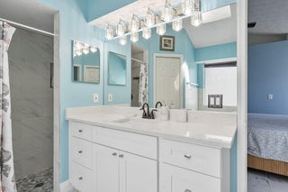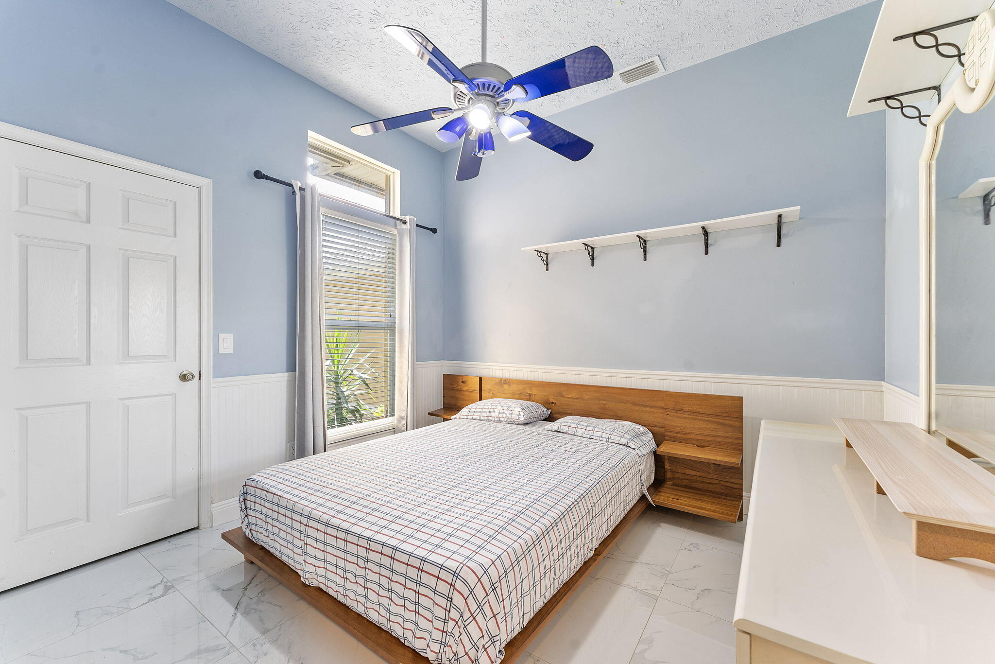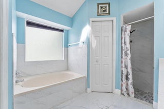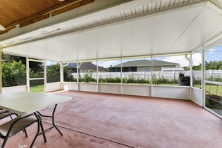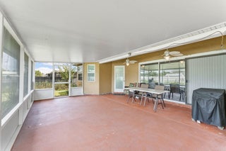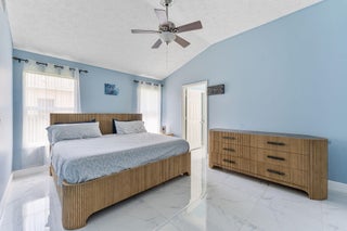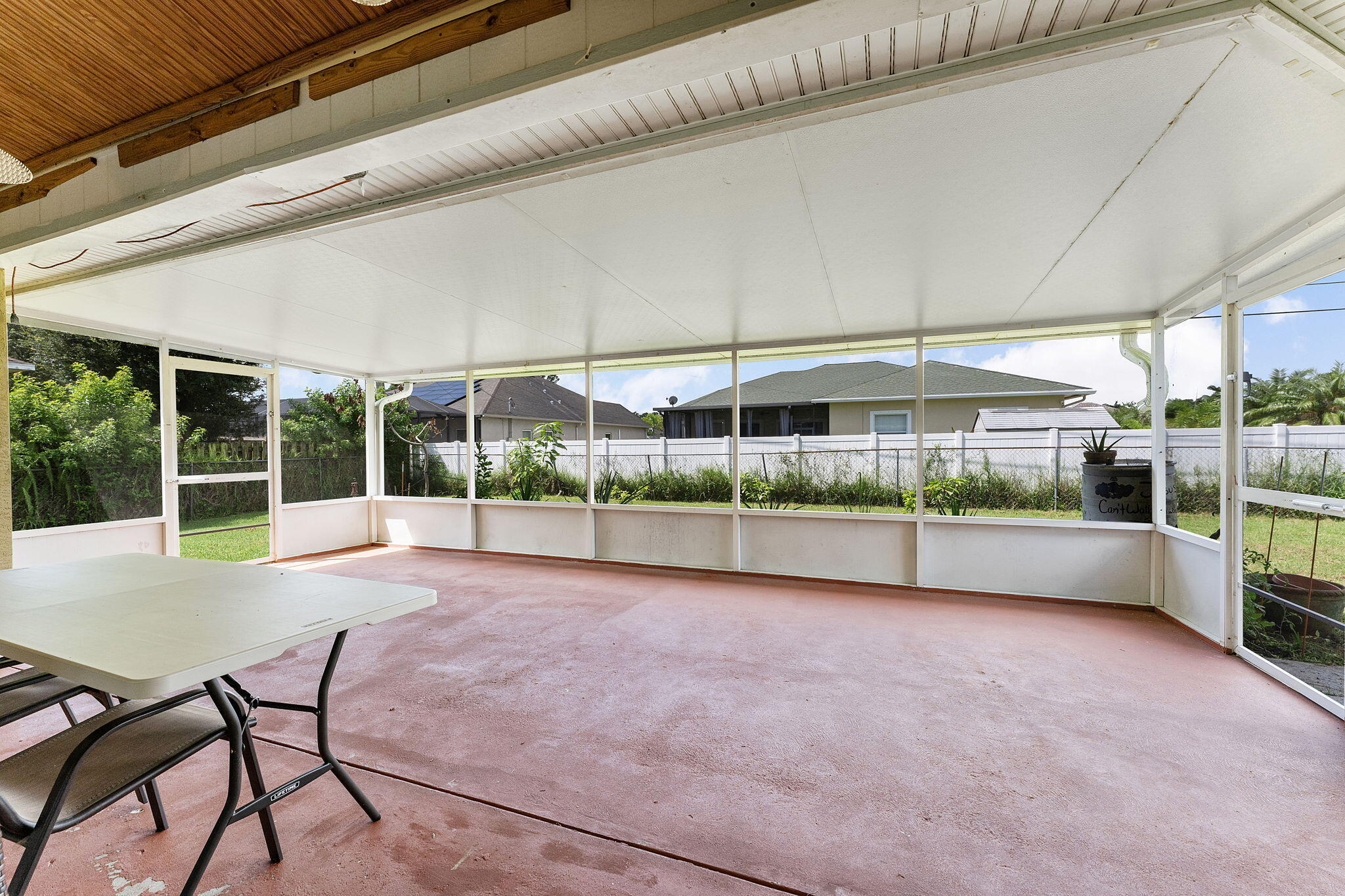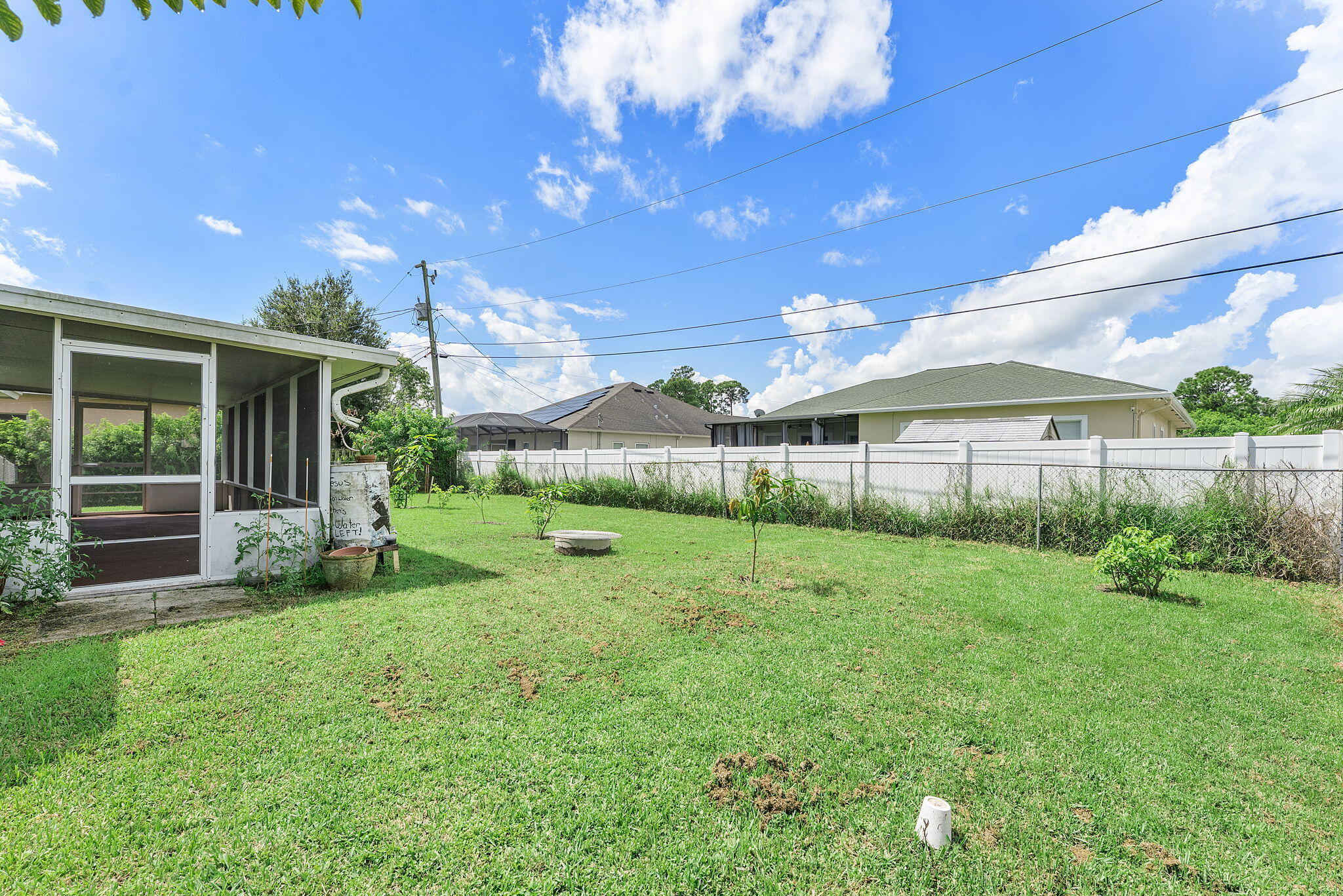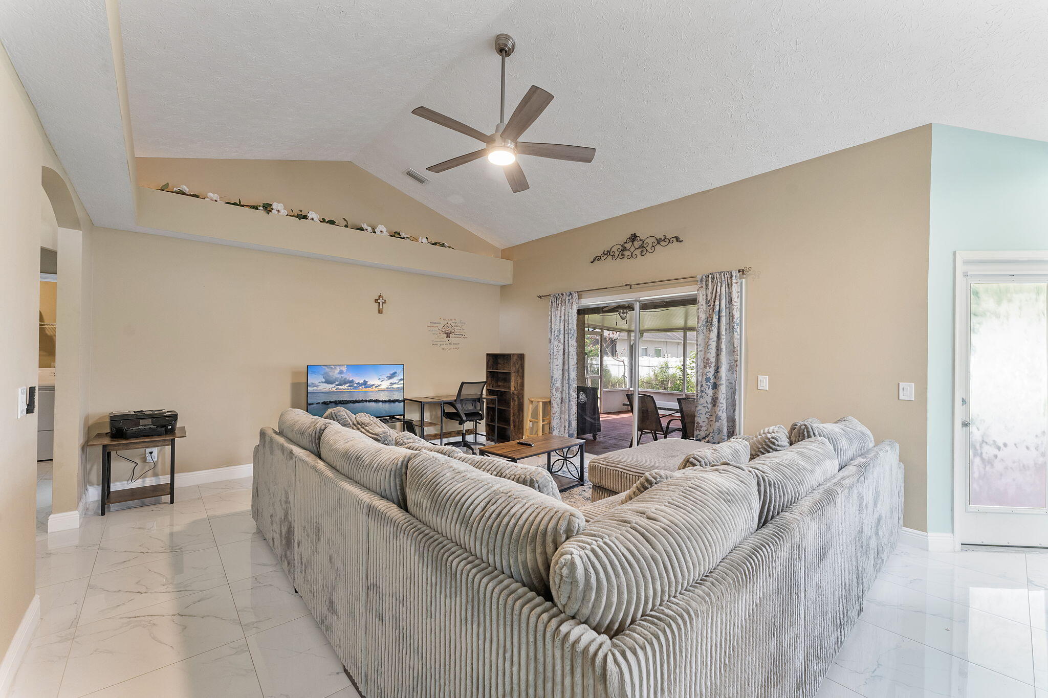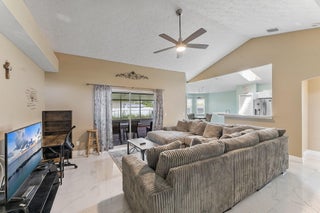 Completely remodeled 3-bedroom, 2-bath home in Port Saint Lucie with everything already done - new roof (2022), brand new water heater (2025), and upgraded electrical panel. This isn't just a cosmetic flip - it's been renovated from the studs up with marble-look tile throughout, completely updated kitchen with white cabinets, quartz counters, and stainless appliances opening to the vaulted ceiling living area. Master suite features dual vanity bath with separate shower and tub, while two additional bedrooms share a second fully renovated bathroom. The real winner here is the huge screened lanai overlooking a spacious backyard with room for a pool.