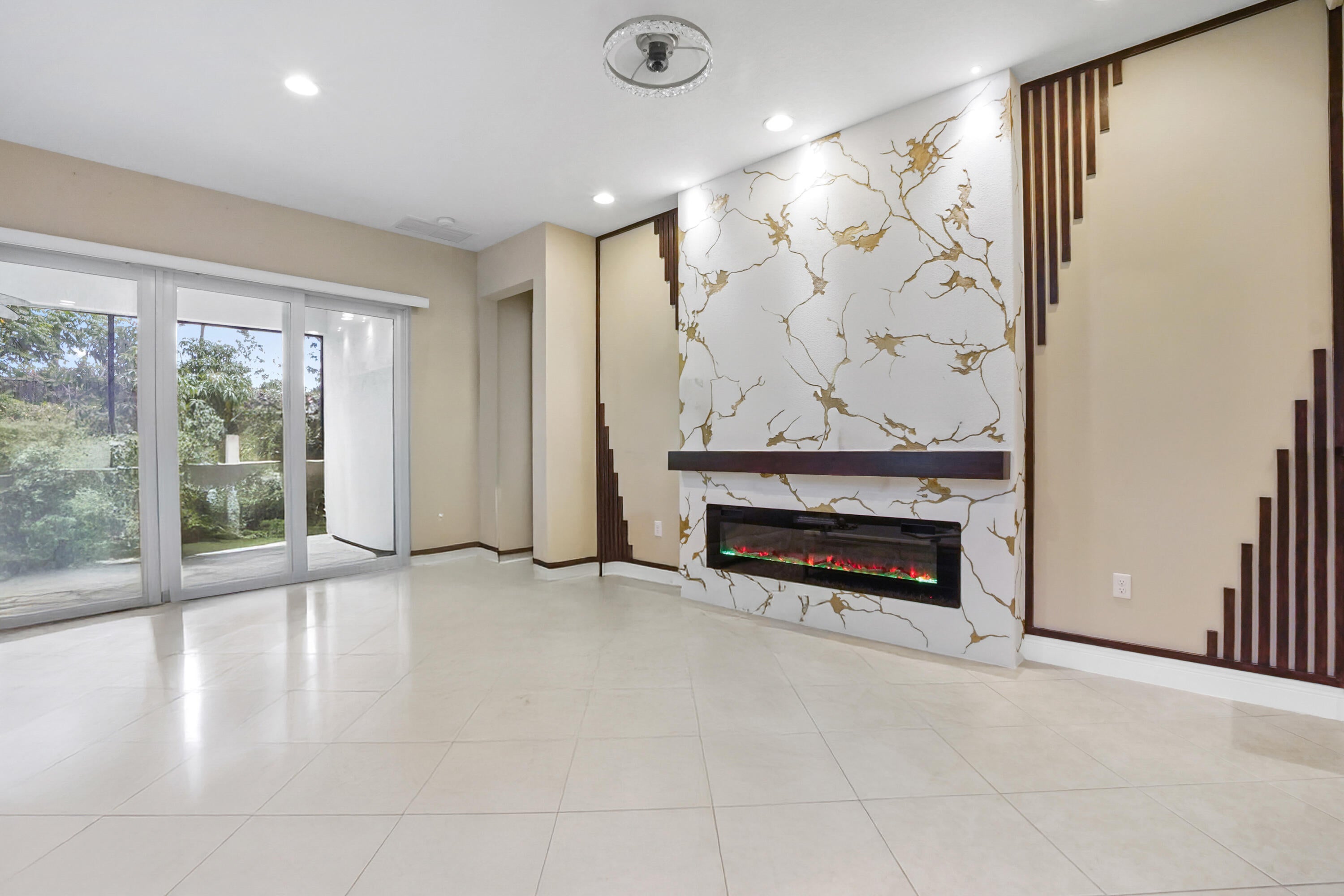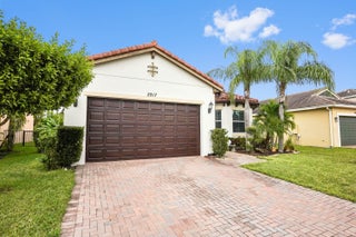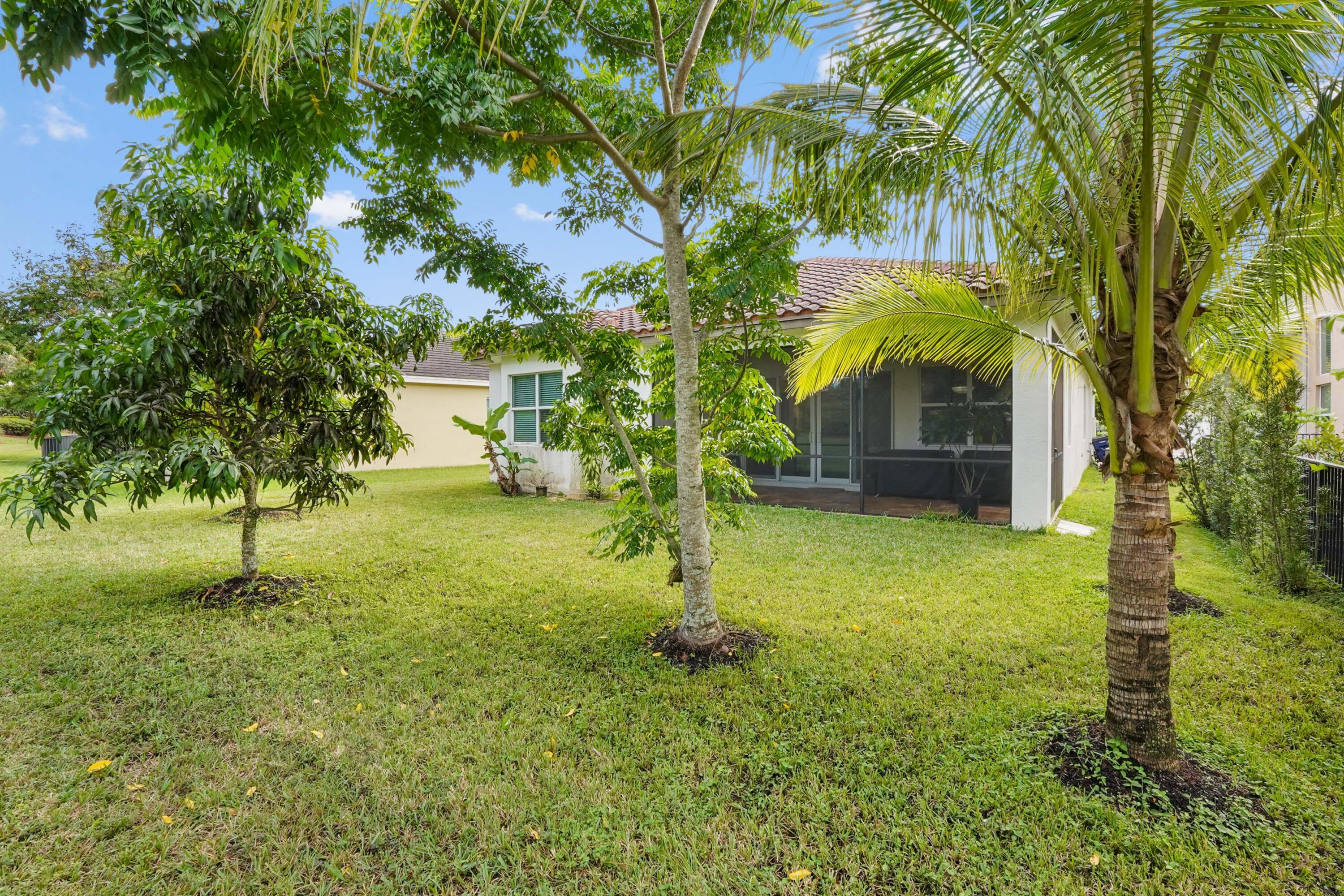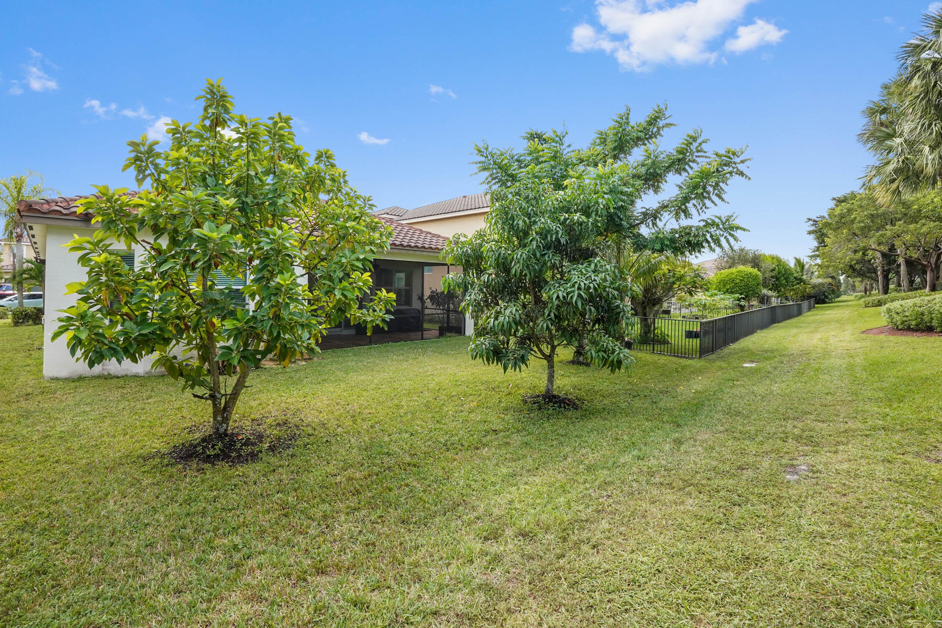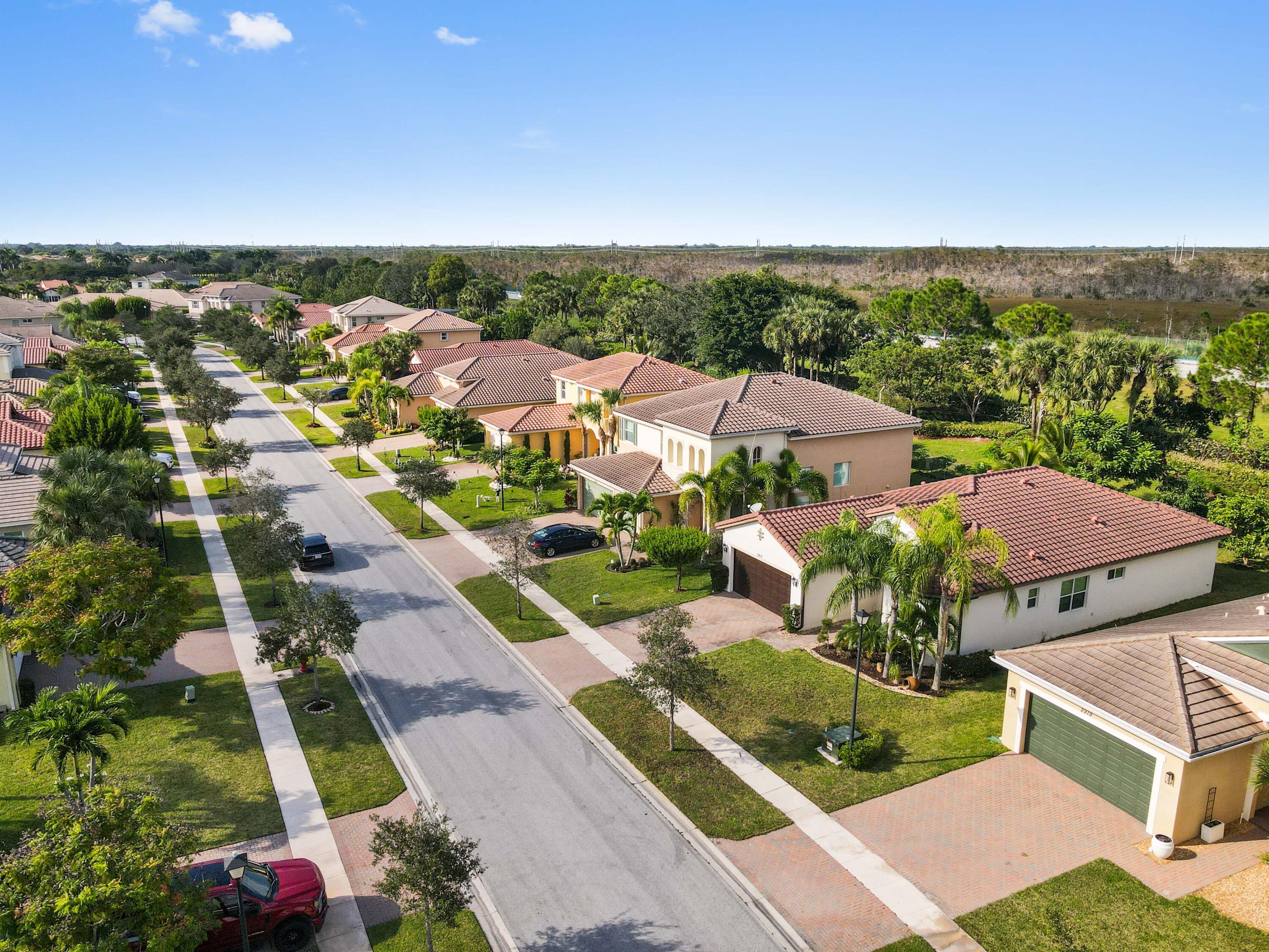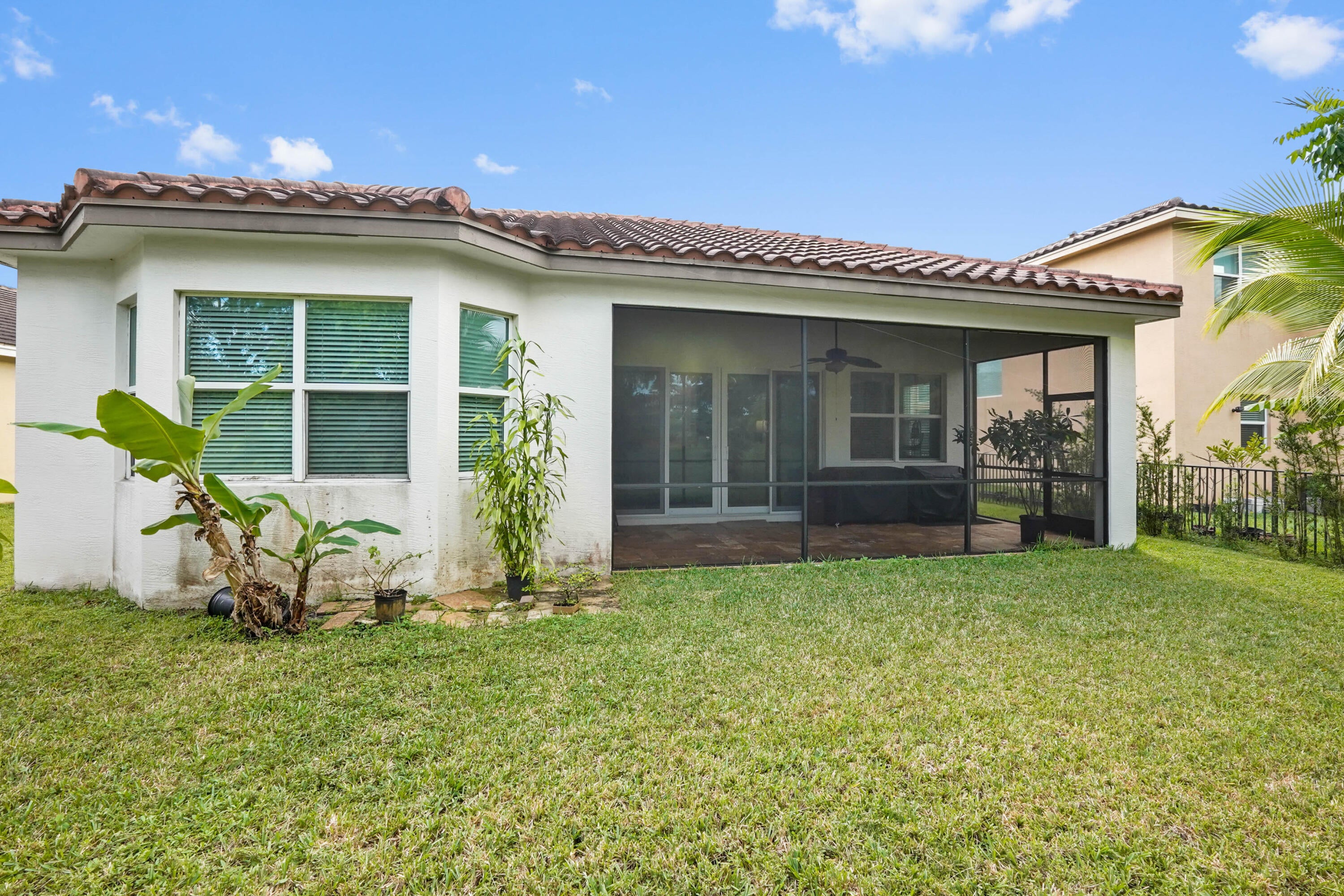 Welcome to this stunning single-family home, perfectly situated on a quiet circle in the desirable gated community of Portosol in Royal Palm Beach. The residence offers 3 bedrooms and 2 bathrooms with exceptional curb appeal, featuring attractive Mediterranean architecture with a tile roof, impact windoews a paver driveway, and lush tropical landscaping. A spacious, arch-covered entry leads to an elegant dark wood front door, setting a sophisticated tone from the moment you arrive.Step inside and be captivated by a beautifully designed, open-concept floor plan that flows seamlessly for modern living and entertaining. The main living areas feature clean, neutral tile flooring and elegant archways, lending a touch of classic charm to the space. The formal dining area is highlighted by a tasteful chandelier and is framed by decorative accents. The great room is anchored by a stunning, custom-built electric fireplace/media wall featuring marble-look paneling and gold accent trim, creating an eye-catching focal point and a perfect space for relaxing. The kitchen is highly functional and connects perfectly to the living space with a granite-topped peninsula. It features dark wood cabinetry, granite countertops, and stainless steel appliances, maintaining a sophisticated aesthetic. The home offers a dedicated laundry room with a sink and cabinets, adding to its convenience. Outside, enjoy the large private backyard and a large screen patio with upgraded travertine tile. Plenty of room for kids to play or to install a pool if desired!!! This residence boasts fantastic recent upgrades that ensure a worry-free experience: the Water Heater was replaced in 2021, and a new Washer and Dryer were installed in 2022. The main living area features beautiful new floors installed in 2023, and the bedrooms now feature updated wood floors (2023) With an attached two-car garage, high-end design accents, and a fluid layout, this home is a beautiful and move-in-ready sanctuary.