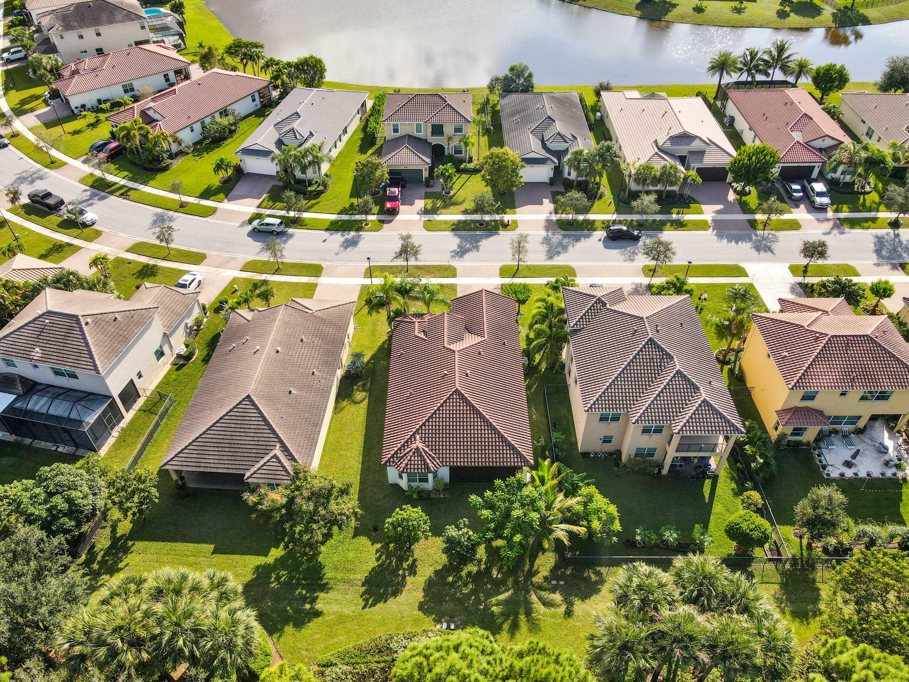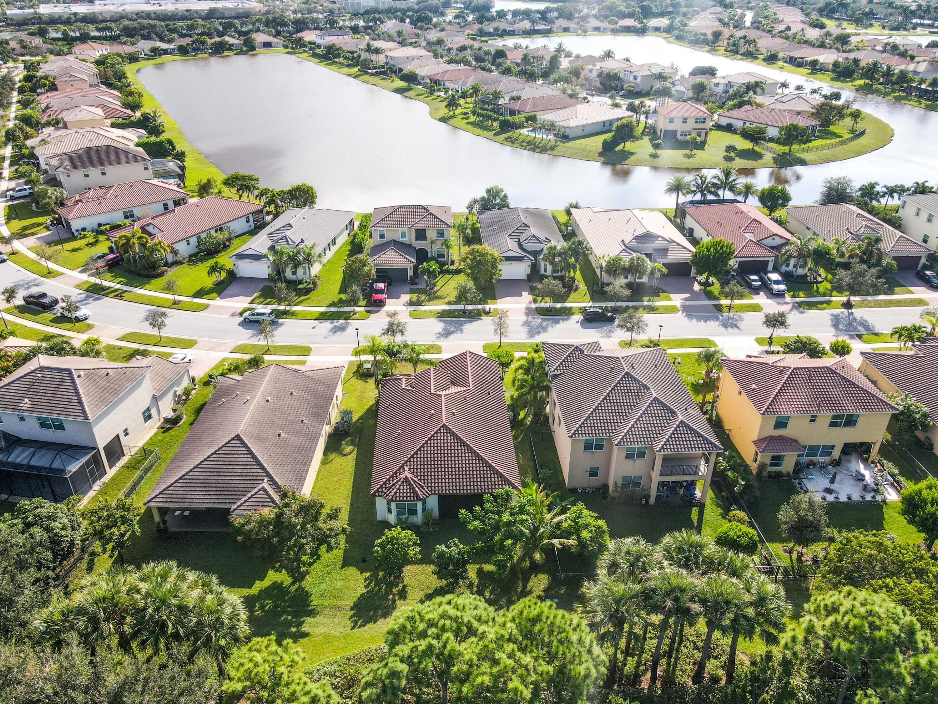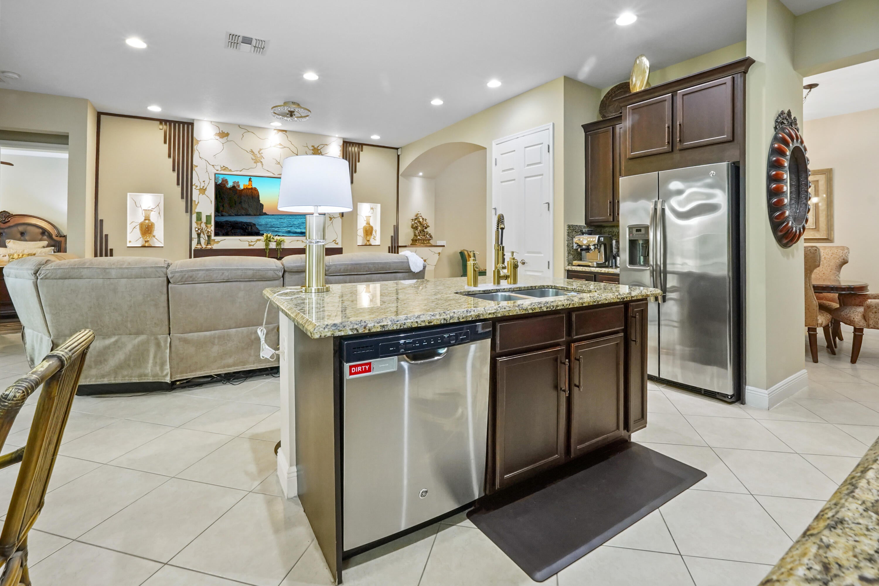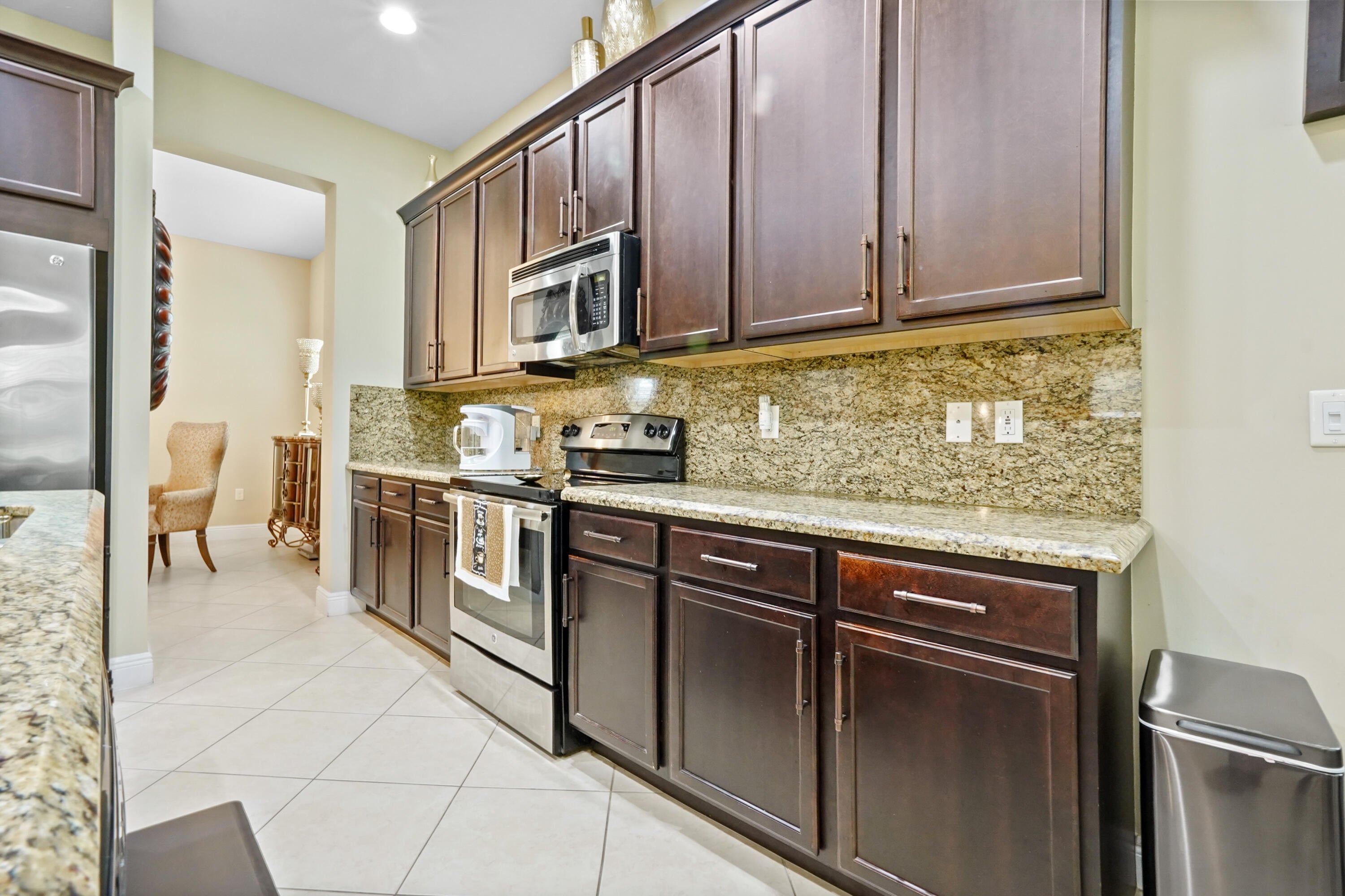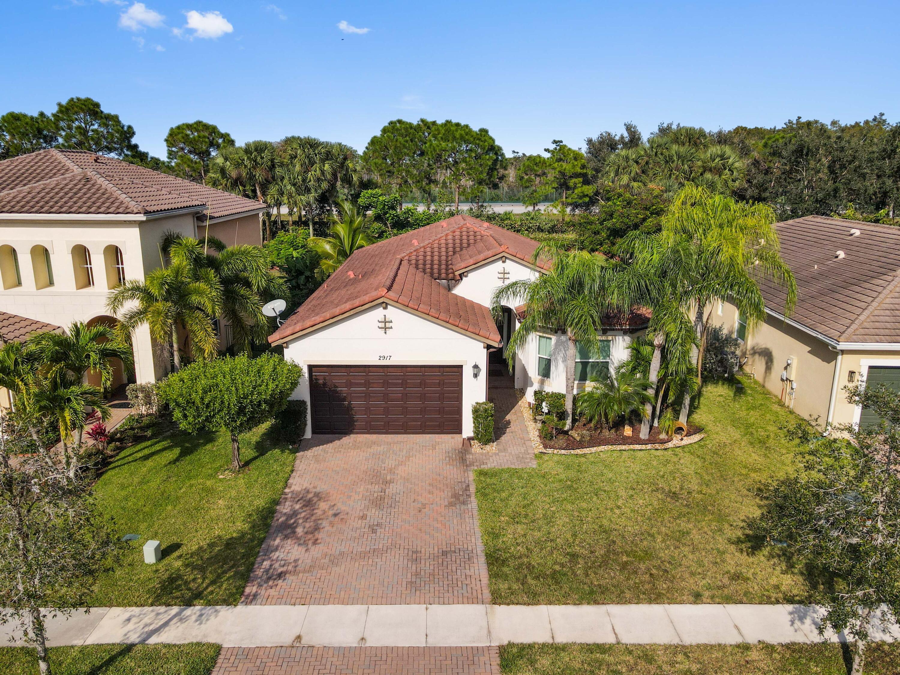 Welcome to this stunning single-family home, perfectly situated on a quiet circle in the desirable gated community of Portosol in Royal Palm Beach. The residence offers 3 bedrooms and 2 bathrooms with exceptional curb appeal, featuring attractive Mediterranean architecture with a tile roof, impact windoews a paver driveway, and lush tropical landscaping. A spacious, arch-covered entry leads to an elegant dark wood front door, setting a sophisticated tone from the moment you arrive.Step inside and be captivated by a beautifully designed, open-concept floor plan that flows seamlessly for modern living and entertaining. The main living areas feature clean, neutral tile flooring and elegant archways, lending a touch of classic charm to the space. The formal dining area is highlighted by a tasteful chandelier and is framed by decorative accents. The great room is anchored by a stunning, custom-built electric fireplace/media wall featuring marble-look paneling and gold accent trim, creating an eye-catching focal point and a perfect space for relaxing. The kitchen is highly functional and connects perfectly to the living space with a granite-topped peninsula. It features dark wood cabinetry, granite countertops, and stainless steel appliances, maintaining a sophisticated aesthetic. The home offers a dedicated laundry room with a sink and cabinets, adding to its convenience. Outside, enjoy the large private backyard and a large screen patio with upgraded travertine tile. Plenty of room for kids to play or to install a pool if desired!!! This residence boasts fantastic recent upgrades that ensure a worry-free experience: the Water Heater was replaced in 2021, and a new Washer and Dryer were installed in 2022. The main living area features beautiful new floors installed in 2023, and the bedrooms now feature updated wood floors (2023) With an attached two-car garage, high-end design accents, and a fluid layout, this home is a beautiful and move-in-ready sanctuary.