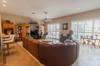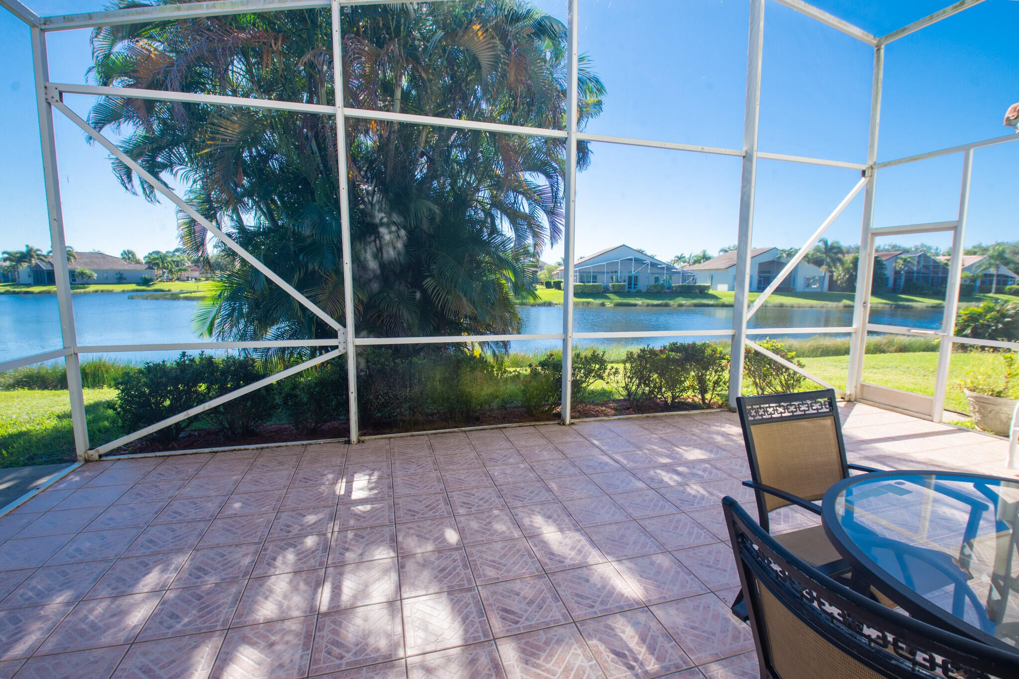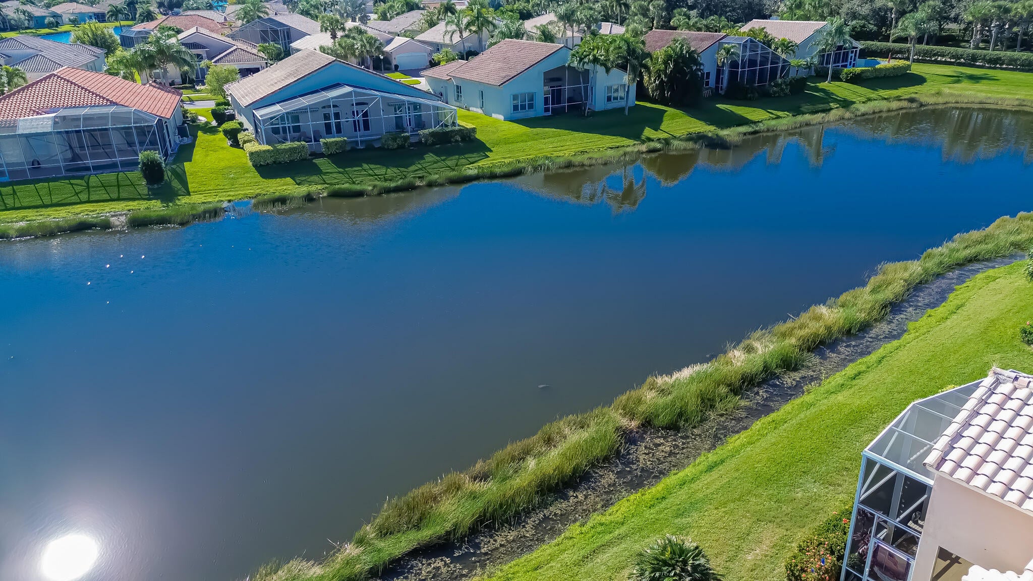 Welcome to this beautifully maintained 2-bedroom, 2-bathroom + den waterfront home located in The Cascades, a premier 55+ gated community offering resort-style living. Enjoy stunning wide-water views from the spacious covered and screened lanai -- the perfect space for morning coffee or evening relaxation. The open floor plan features generous bedroom sizes, plantation shutters, and diagonal tile in the main living areas. The kitchen features gas cooking, ideal for those who enjoy cooking. HOA dues include lawn care and cable for added convenience. Residents enjoy top-tier amenities including golf, tennis, pickleball, a clubhouse, resort-style pool, and more. Experience Florida living at its finest!