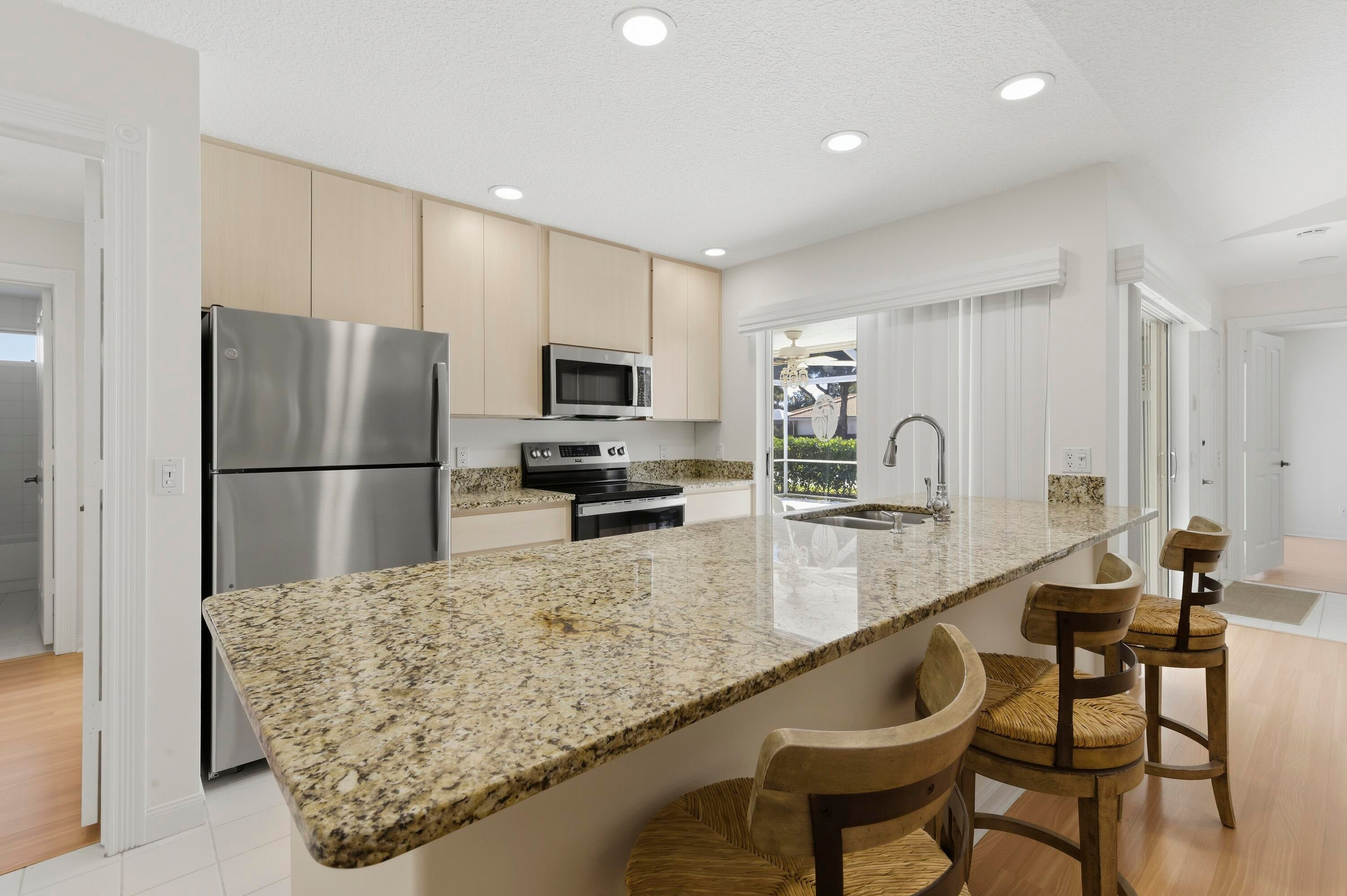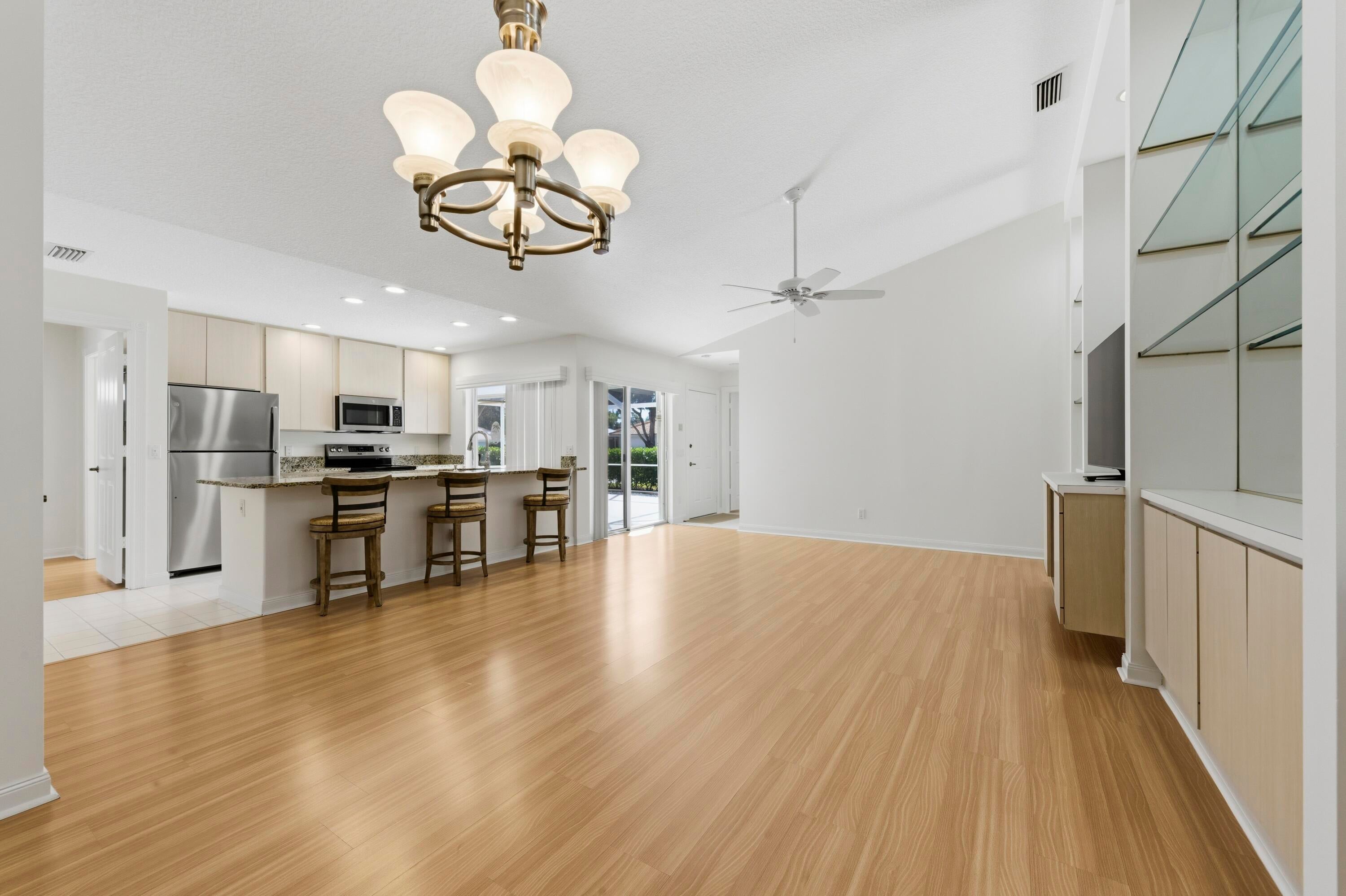 This is your opportunity to live in the sought-after community of Sun Terrace, perfectly located in the heart of Palm Beach Gardens. This beautifully updated villa offers 2 spacious bedrooms and 2 full baths, featuring laminate wood flooring in the living areas, tile floors in the bathrooms, and a built-in wall unit in the family room. Recent upgrades include complete replacement of all polybutylene pipes, removal of popcorn ceilings with fresh paint, new interior paint throughout, a remodeled kitchen with all-new stainless steel appliances, and a new A/C unit making this home truly move-in ready. Enjoy an expansive screened-in patio accessible through sliding glass doors, perfect for relaxing or entertaining.Residents have access to a refreshing community pool and beautifully maintained grounds. This villa provides the ideal blend of privacy, convenience, and community amenities, all just minutes from beaches, recreation, golf, dining, and entertainment, with easy access to major highways and Palm Beach International Airport.