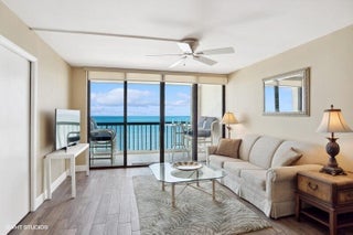 Owner/agent offers direct oceanfront condo with sunrise + sunset views. Perfect floor level for several reasons plus extensive renovations: ceramic tile flooring seamless throughout (no carpet), smooth ceilings (no popcorn), higher end bathroom tiles, quartz countertops, vanities and fixtures, double sinks in master bathroom, seamless glass shower enclosures in both bathrooms, new interior doors, new wide baseboards, designer ceiling fans, new oven, new A/C 7/2023. 2 walk-in closets. Very social community with lots of amenities: 2 large pools, 2 crossover walkways to the beach (one with covered pergola), gym, several social areas, 2 pickleball courts, 2 tennis courts, beachy car wash, A/C bicycle storage + designated cage for each condo.