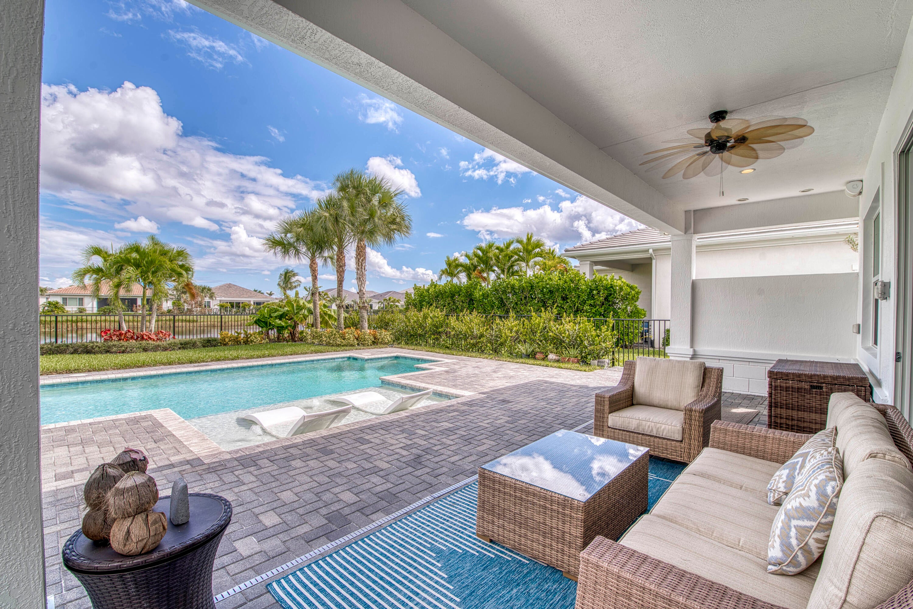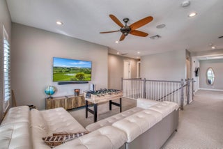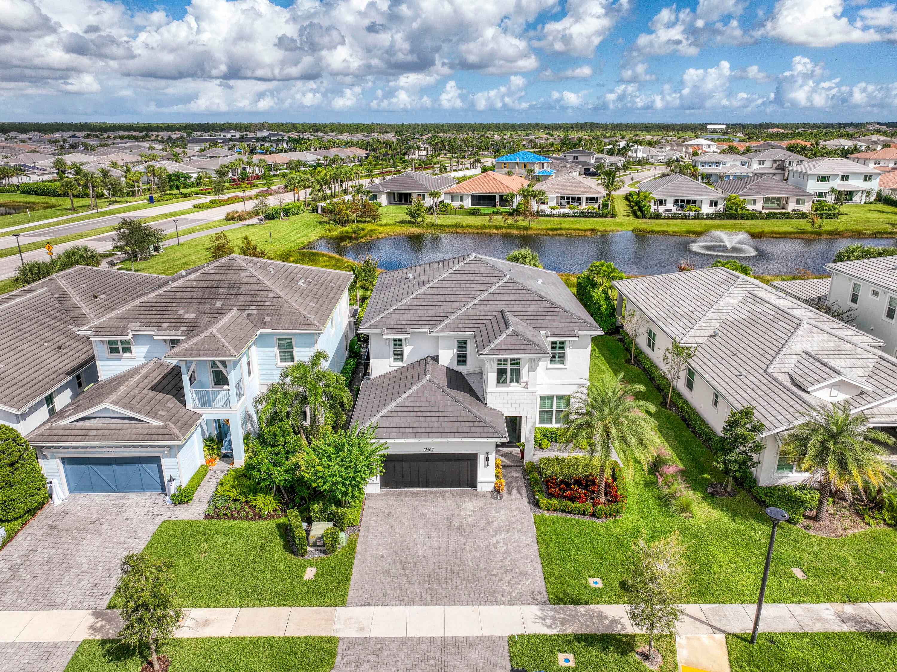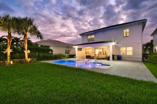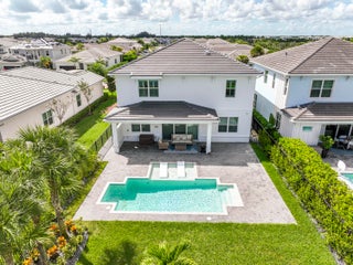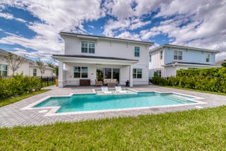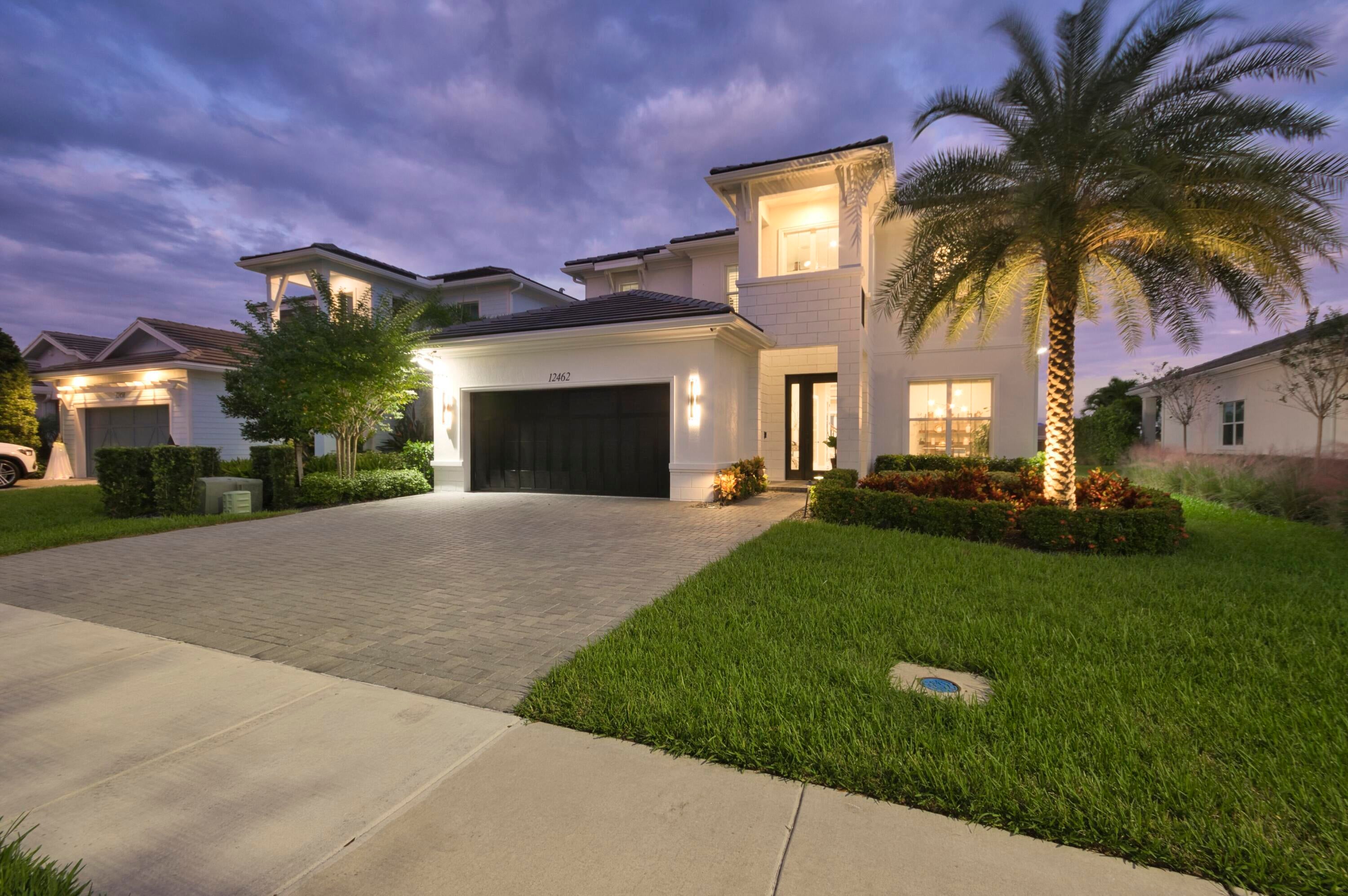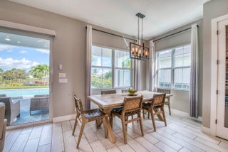 Welcome to this stunning 2021-built Torrance model in Windgate at Avenir, offering 3,222 square feet of thoughtfully designed living space on a 7,000-square-foot lot. This home was customized by Toll Brothers with several architectural modifications at the owner's request, including a mudroom (not typically offered in this community), an expanded primary bathroom with two linen closets, two sets of washer/dryers (upstairs and downstairs), and additional windows to maximize natural light throughout. The open-concept first floor features a sun-filled living room with a wood-clad focal wall and entertainment center, seamlessly connecting to a modern kitchen with a large quartz waterfall island and casual dining area, perfect for everyday living and entertaining. Upstairs, the spaciousprimary suite offers plush carpeting, coffered ceilings, and serene lake views, complemented by a spa-like en-suite bathroom with dual sinks, soaking tub, and rain shower. This home also boasts a Control4 smart home system, enabling automation and control of lighting, motorized window treatments, air conditioning, fans, zoned music and entertainment, security cameras, and the alarm system, providing modern convenience and peace of mind. Outside, the covered patio and sparkling pool with sun shelf create a private retreat framed by tropical landscaping and tranquil lake vistas. Every detail of this home is designed to elevate daily living and make entertaining effortless. Experience the perfect blend of style, comfort, and outdoor living in this exceptional Windgate at Avenir home, schedule your private tour today and discover all it has to offer.
