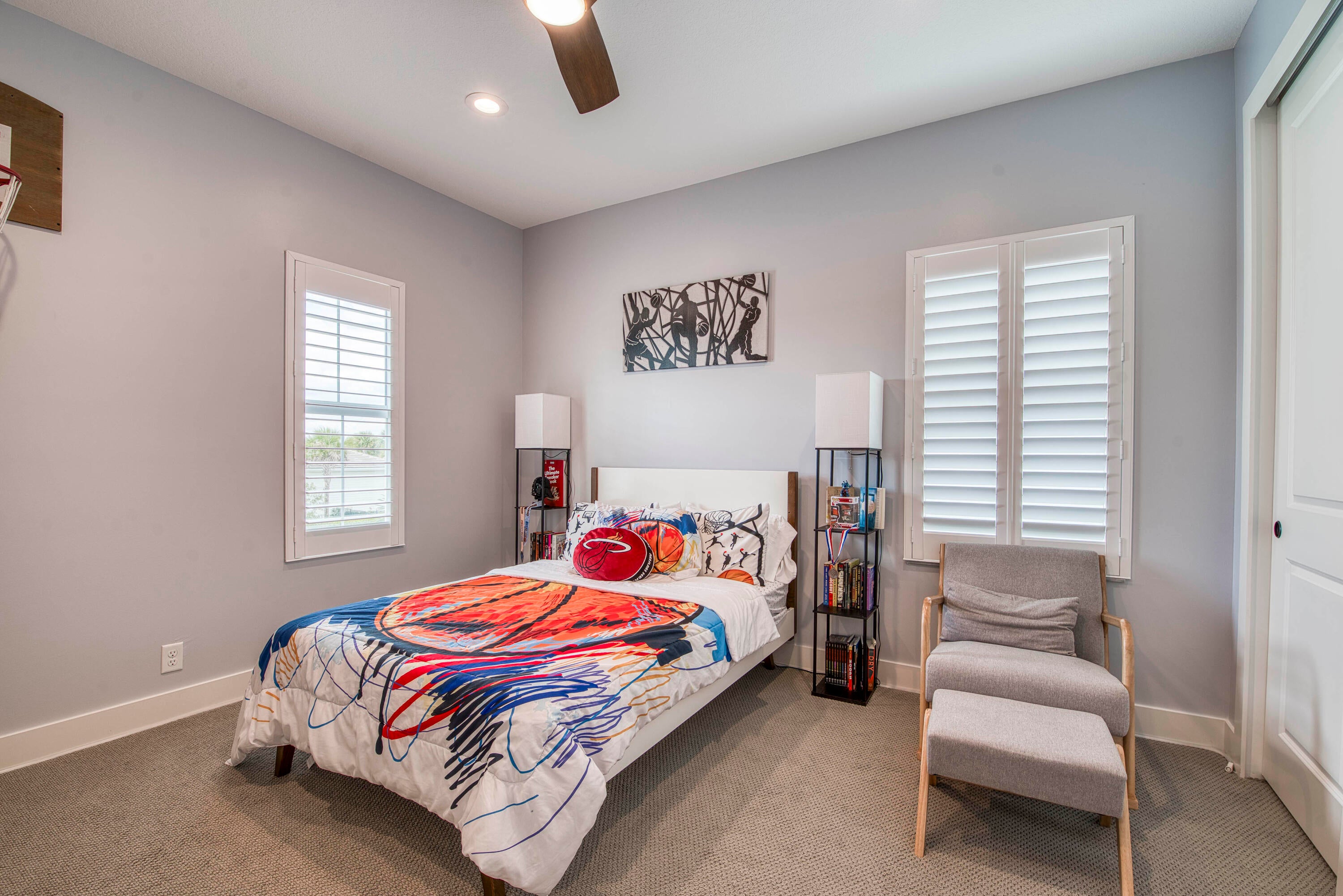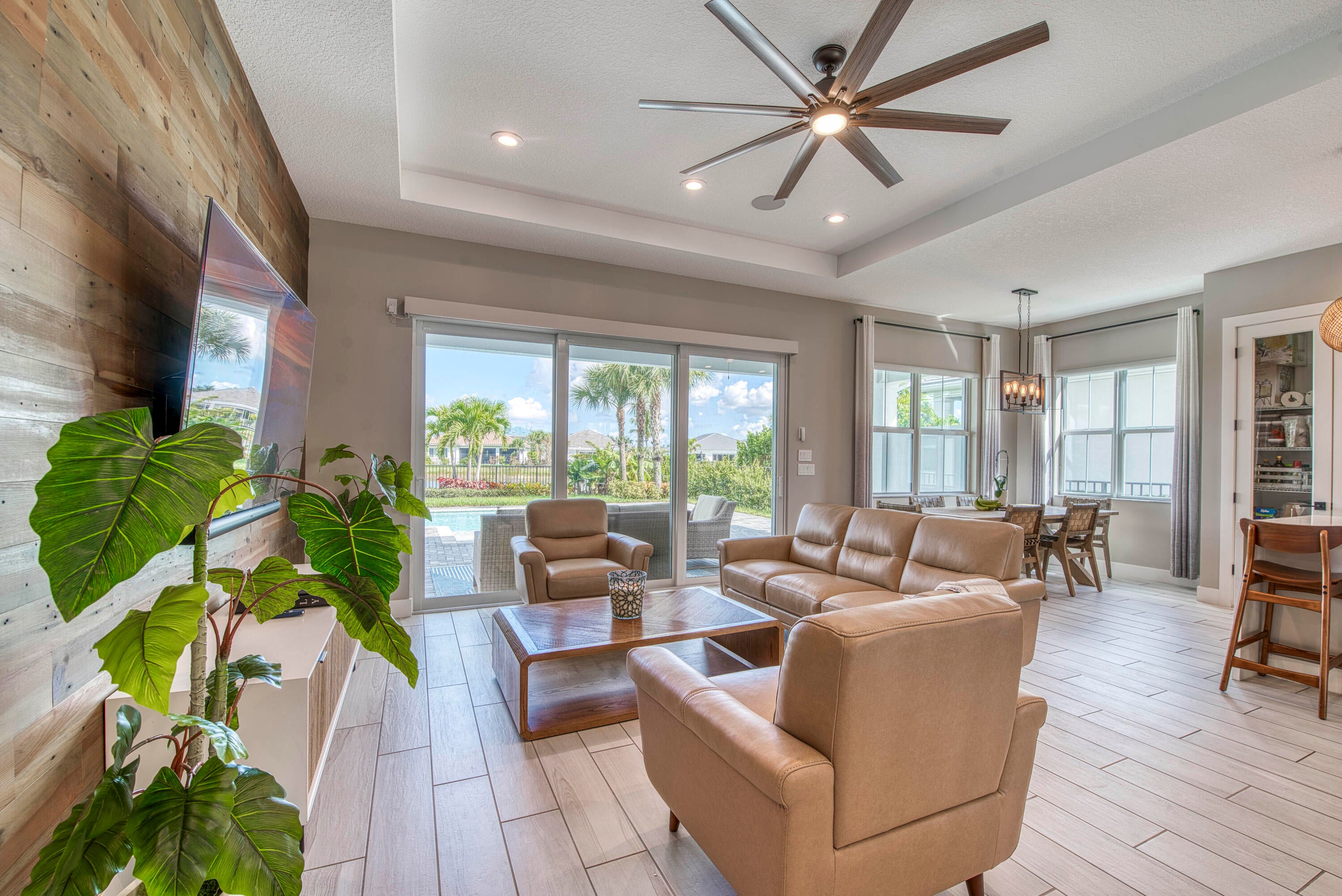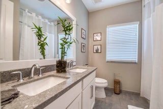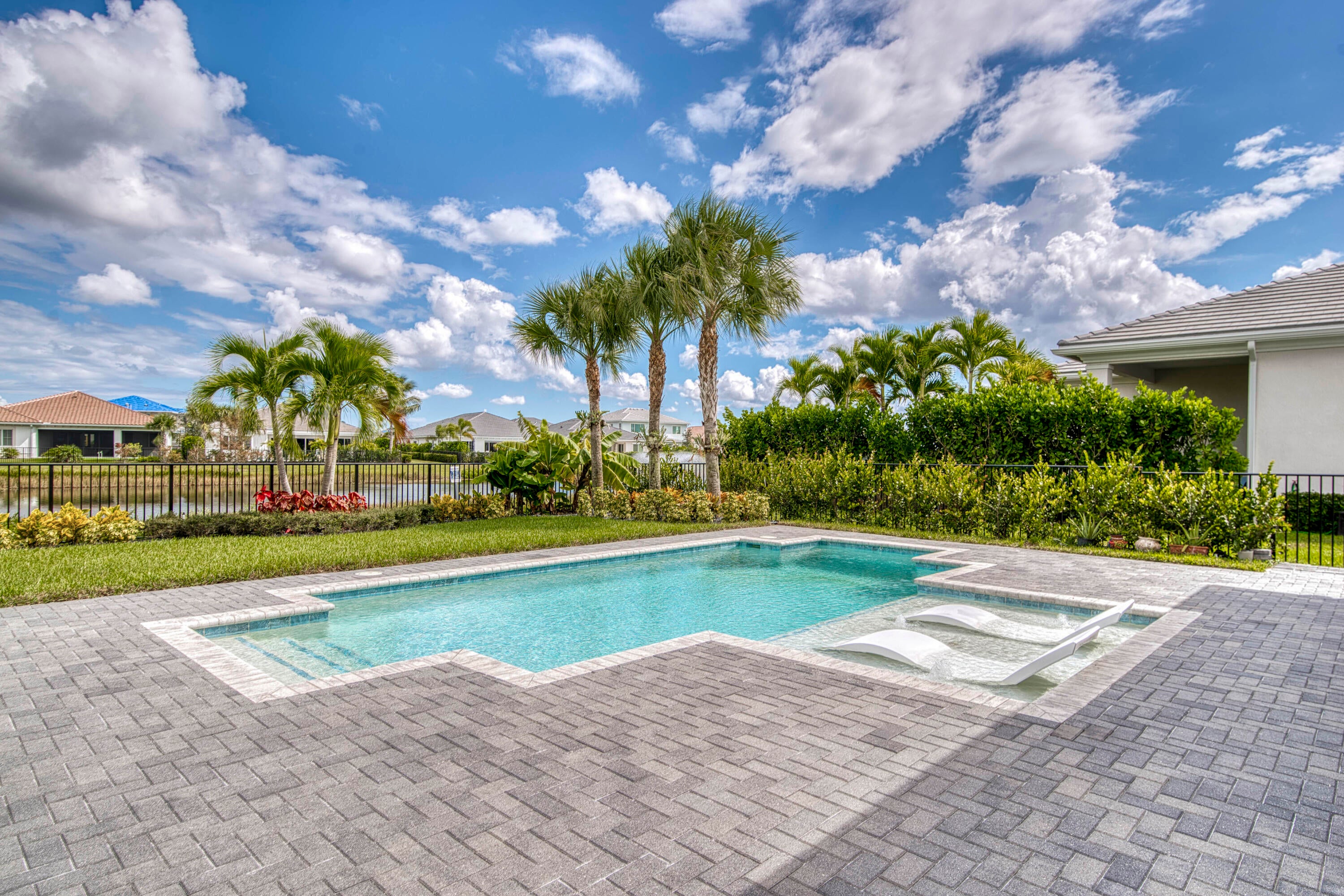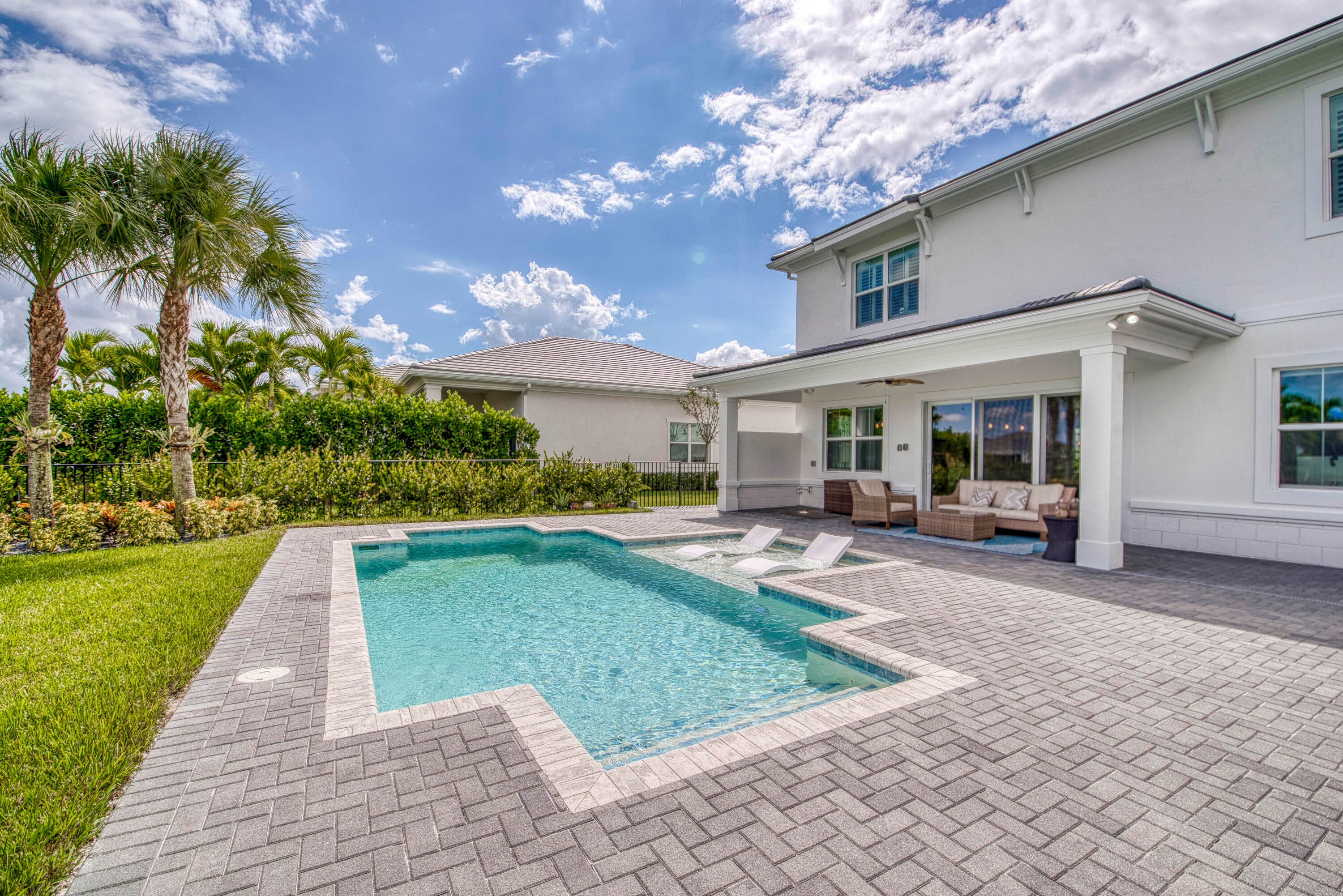 Welcome to this stunning 2021-built Torrance model in Windgate at Avenir, offering 3,222 square feet of thoughtfully designed living space on a 7,000-square-foot lot. This home was customized by Toll Brothers with several architectural modifications at the owner's request, including a mudroom (not typically offered in this community), an expanded primary bathroom with two linen closets, two sets of washer/dryers (upstairs and downstairs), and additional windows to maximize natural light throughout. The open-concept first floor features a sun-filled living room with a wood-clad focal wall and entertainment center, seamlessly connecting to a modern kitchen with a large quartz waterfall island and casual dining area, perfect for everyday living and entertaining. Upstairs, the spaciousprimary suite offers plush carpeting, coffered ceilings, and serene lake views, complemented by a spa-like en-suite bathroom with dual sinks, soaking tub, and rain shower. This home also boasts a Control4 smart home system, enabling automation and control of lighting, motorized window treatments, air conditioning, fans, zoned music and entertainment, security cameras, and the alarm system, providing modern convenience and peace of mind. Outside, the covered patio and sparkling pool with sun shelf create a private retreat framed by tropical landscaping and tranquil lake vistas. Every detail of this home is designed to elevate daily living and make entertaining effortless. Experience the perfect blend of style, comfort, and outdoor living in this exceptional Windgate at Avenir home, schedule your private tour today and discover all it has to offer.