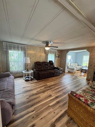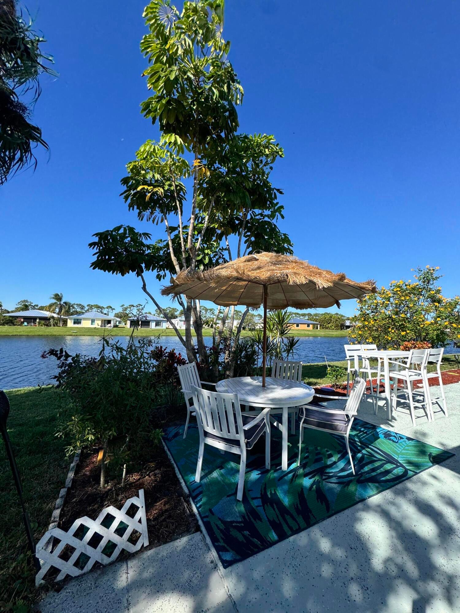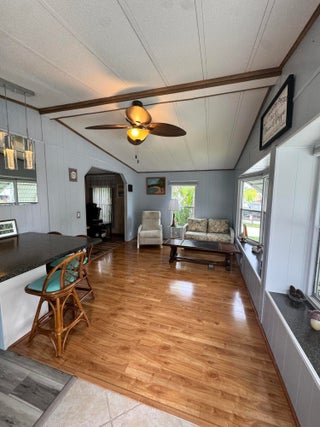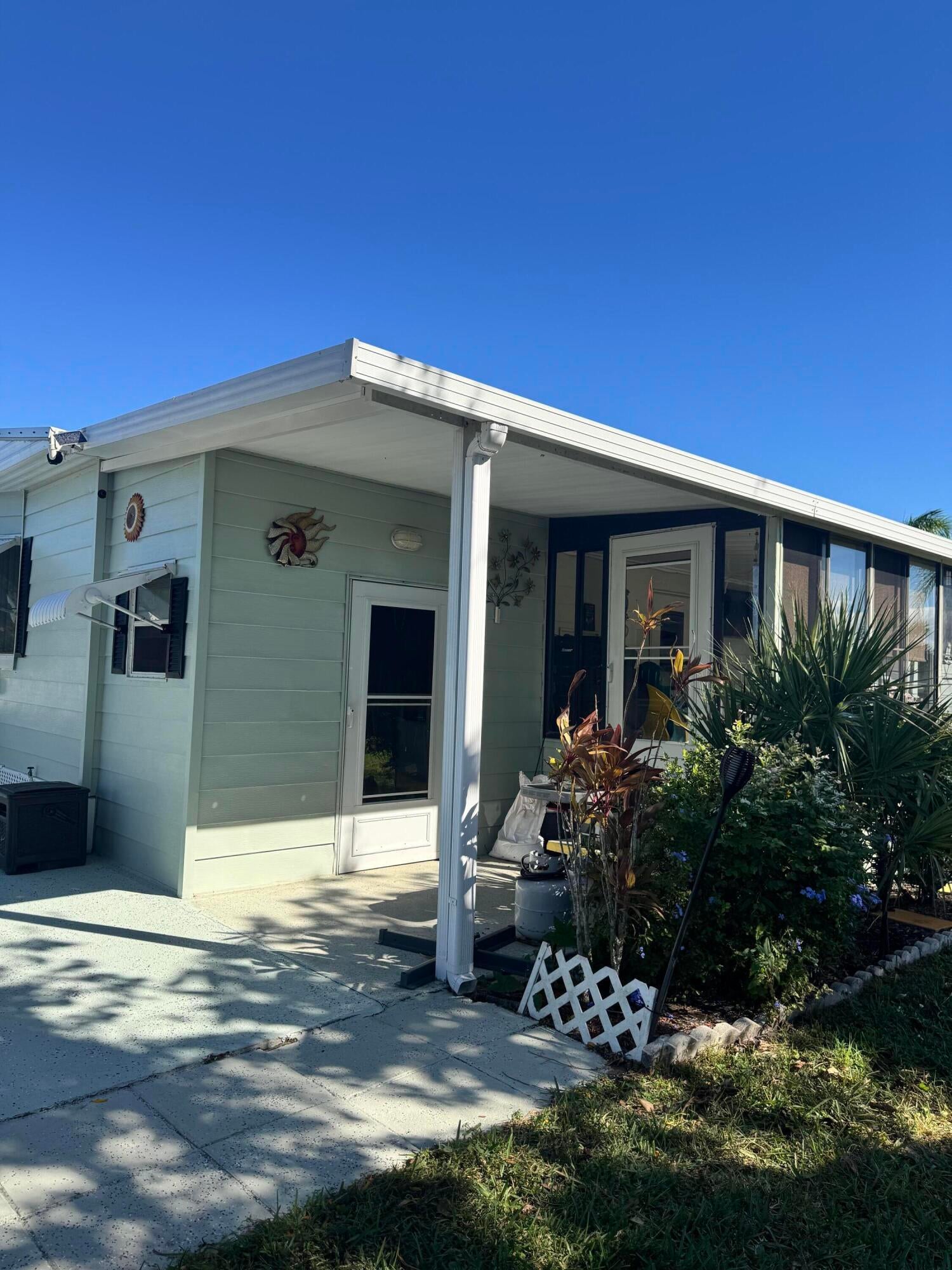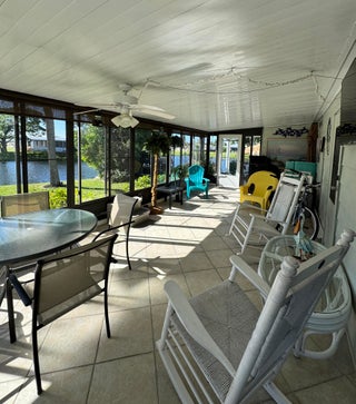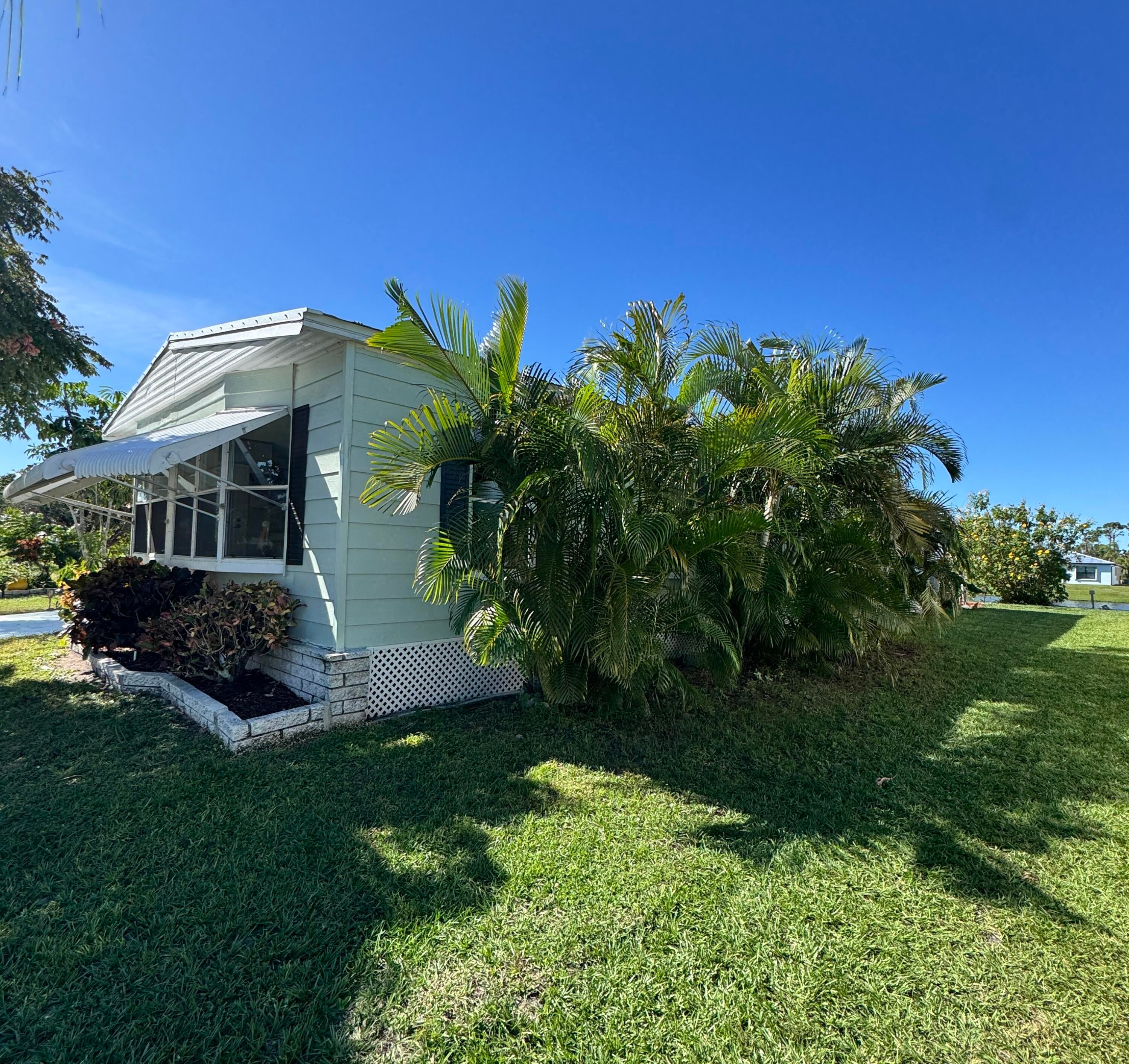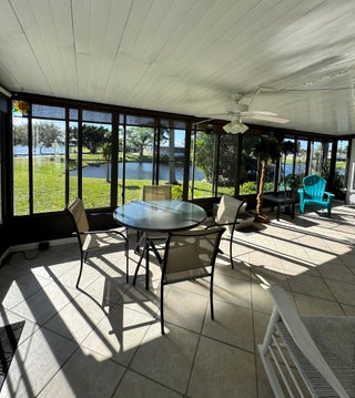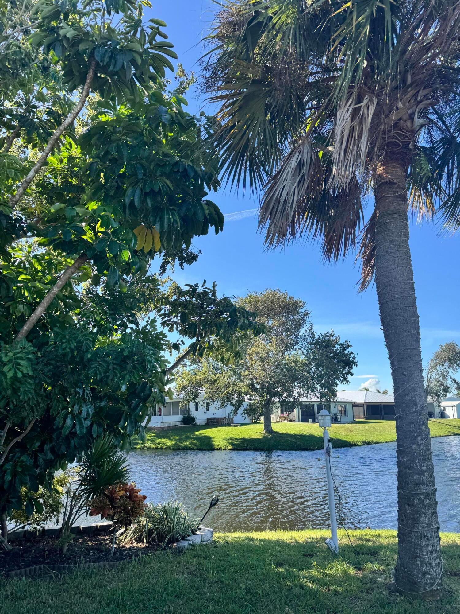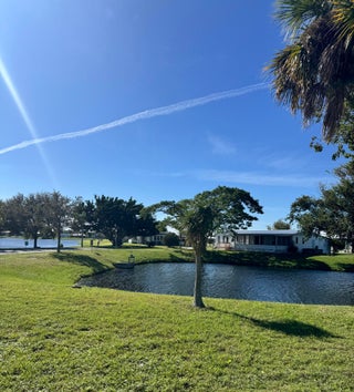 Lovely 2-bedroom 2-bath Lake view home. This home is located in the desirable 55+ Spanish Lakes Country Club Village community. The home has a beautiful lake view on two sides--screened-in patio which has windows that can be closed for future A/C. Patio is overlooking the lake, great for morning coffee and evening cocktails. Added a 12X28 Patio for enjoying the Florida sun. This home has laminate and carpet flooring. The home has built-in shelves in the dining area that provide additional storage. The primary suite bathroom has a built-in jewelry cabinet, new toilets, and a vanity. Roof is 2022, Vapier barrier and tie downs 2022. Brand New 2025 Carport. Home is being sold partially furnished. Lawn care and trash removal are included in the lot rent. 2 pools, shuffleboard shuffleboard, bocceball, pickleball, tennis, and much more. MUST SEE