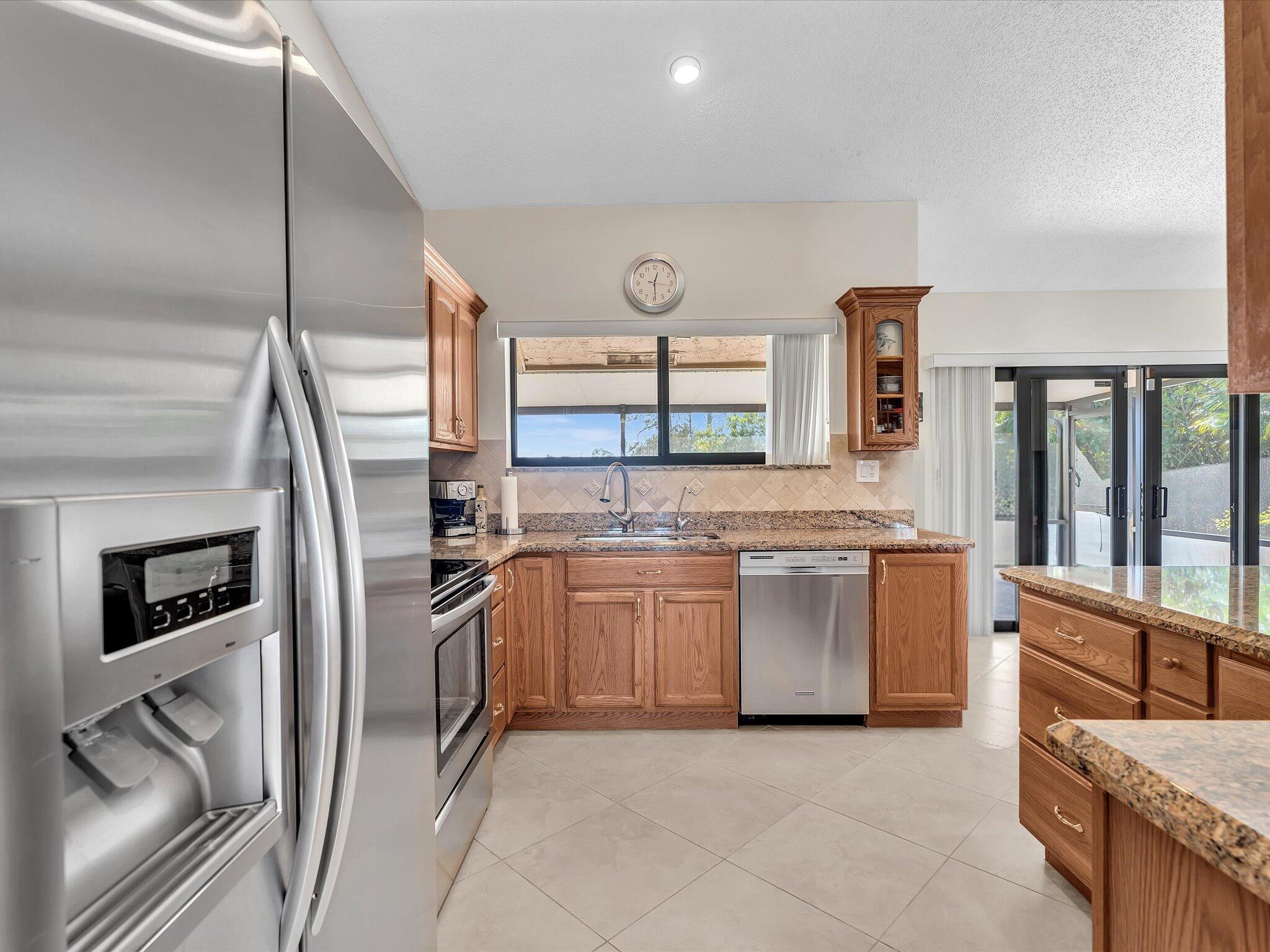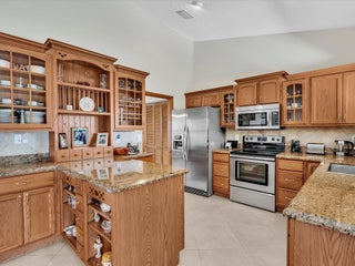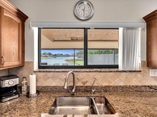 Absolute pristine condition. Panoramic lake views from all rooms with Southeast long lake views. New roof (2022) and impact windows & sliders. Neutral 20'' porcelain tile at diagonal throughout. Kitchen features solid oak wood cabinetry with glass display and storage nooks, Baltic Brown beveled edge granite counters and tumbled marble backsplash with pristine SS appliances. Both baths updated with upgraded vanities and floor to ceiling tile. Split floor plan with large bedrooms with Master featuring large 9'x6' walk in closet. Vaulted ceilings & solid wood interior doors throughout. Summer kitchen with gas stove on patio. Attractive front door with glass block sidelights. Oversize tiled 1 car garage (22'x15') w/ utility sink, pull down stairs & side door. Sprinkler off lake. Come see!