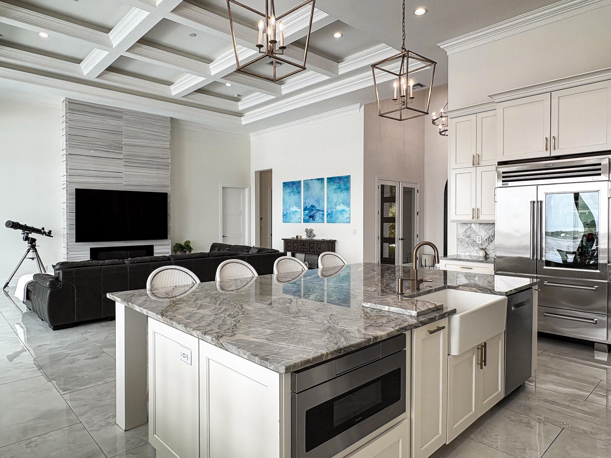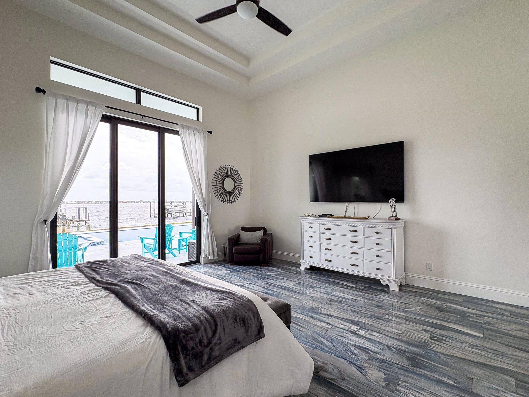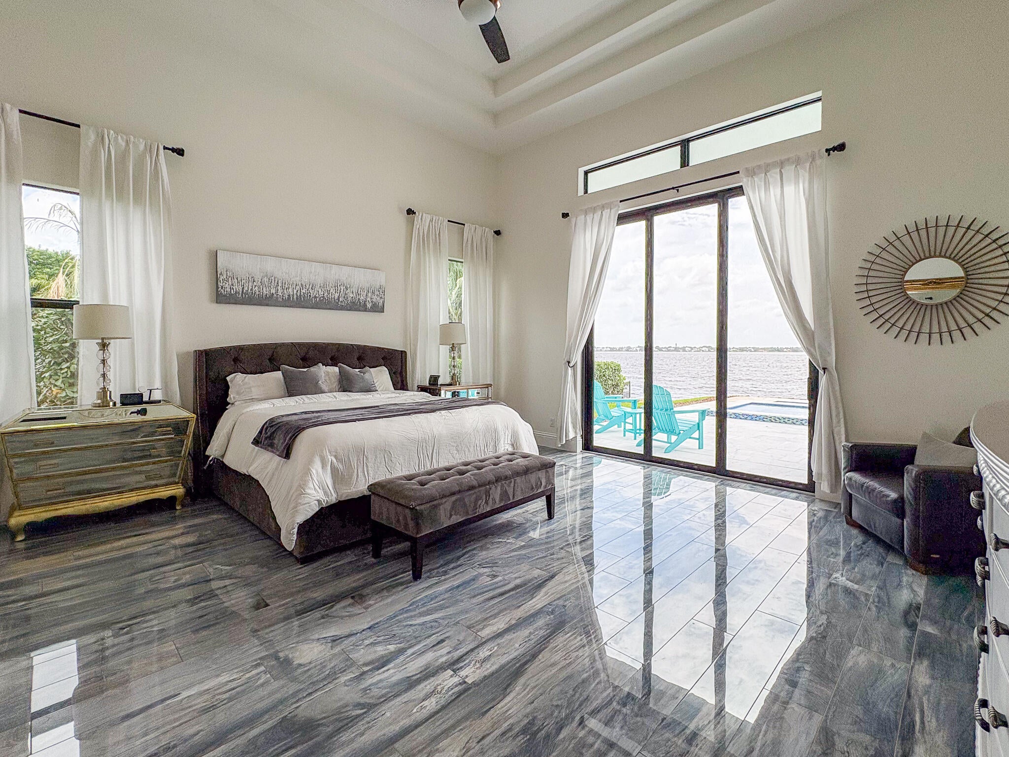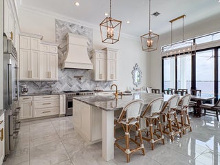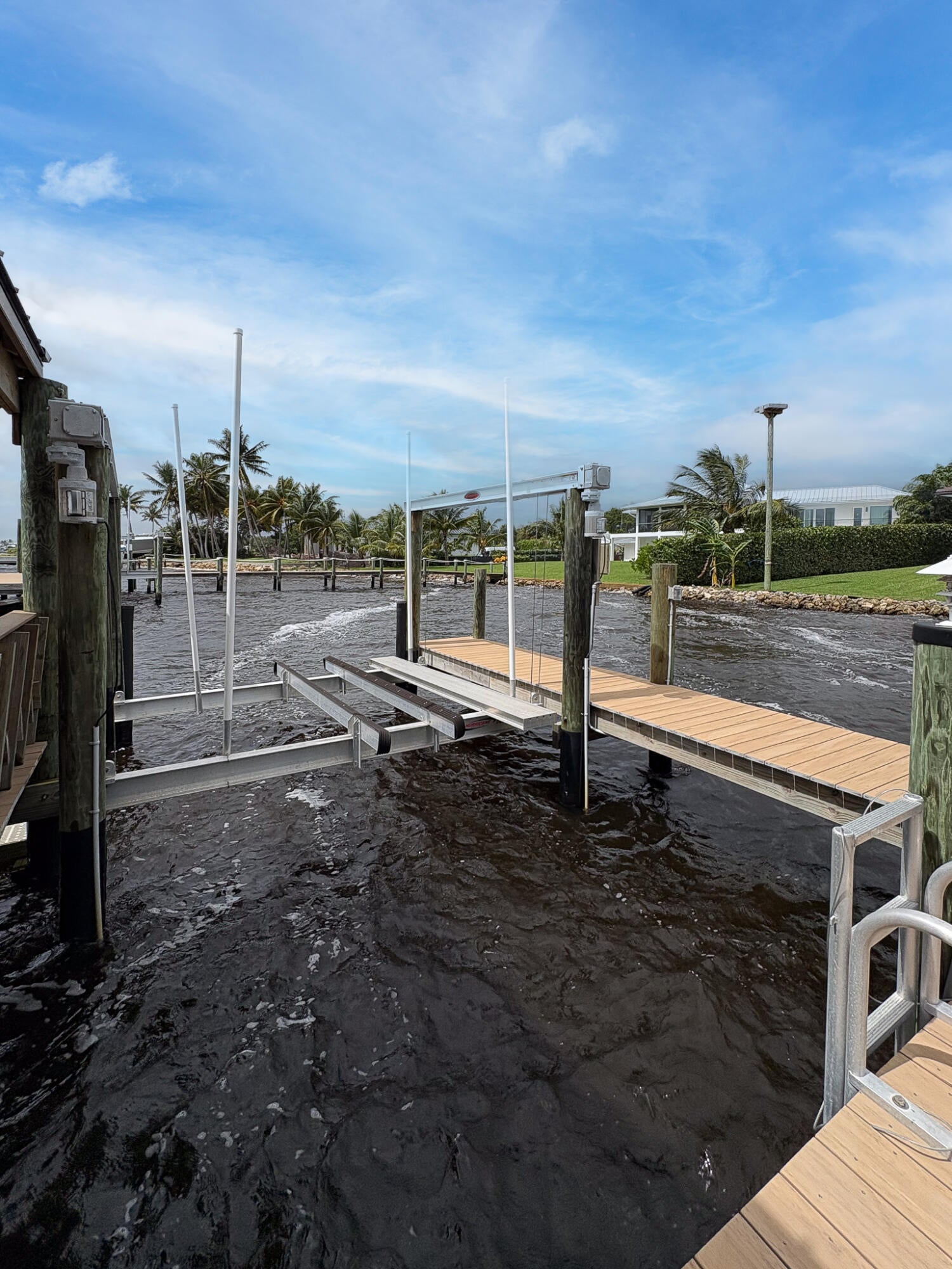 FIRST TIME ON MARKET! Premier waterfront location built in 2020. Modern-Mediterranean home close to downtown Jensen Beach and Stuart. Spectacular southern exposure and wide-water view. Direct ocean access minutes from the St. Lucie Inlet. No low bridges - a boater's dream. High coffered ceilings, four spacious bedrooms plus a den, four full baths, and a cabana bath designed for everyday comfort and effortless entertaining. Gourmet chef's kitchen, top notch appliances, quartzite counters, custom cabinetry, walk-in pantry. Private waterfront with covered dock, two high-speed boat lifts, personal watercraft lift, and lowered platform for kayaks and paddle boards. Room for your yacht or sport-fish. Heated saltwater pool, spa tub, sun shelf, and iridescent glass tile.3-car garage, impact windows & sliders, huge covered patio, backup generator, 1,000 lb in-ground propane tank. Perfect balance of comfort, convenience, and breathtaking waterfront views. Don't miss your chance to own it!