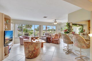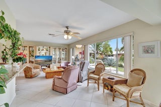 This immaculately maintained Midcentury home is nestled along the northern end of the golf course in Eden Place. Meet the day with a cup of coffee in hand watching the sunrise over the Intracoastal and golf course. This solid CBS constructed home is 2 bedrooms, 2 baths, the primary bedroom featuring an en suite bath, and two living areas, plus a large 11 by 9 dedicated laundry room with abundant pantry storage, and an attached 2-car garage. Every room looks onto the golf course through large picture windows. There is expansive outdoor space. The 32 foot by 12 foot patio deck overlooking the course has a retractable awning, making this a beautiful outdoor room to enjoy in any weather. Don't miss this opportunity to own a piece of paradise! Hip and artsy downtown Lake Worth Beachand its sidewalk cafes, art galleries and specialty shops are just minutes away. So is the oceanfront! You're never at a loss to find something to do in town. Grab your green market bag and head to the waterfront Green Market on Saturday. Play 18 holes at the waterfront public golf course. Spend the day at the beach where you will find shops, restaurants and a 300' pier where you can fish or just enjoy a leisurely stroll. Explore the Arts District where local craft brewery Mathews Brewery has ongoing events to enjoy. Or take in a live glass-blowing demonstration at the Benzaiten Center for Arts just around the corner. The city hosts many outdoor festivals throughout the year. Centrally located to Palm Beach International Airport, Tri Rail, Brightline, downtown West Palm and the glitzy Island of Palm Beach. Come and enjoy South Florida living!