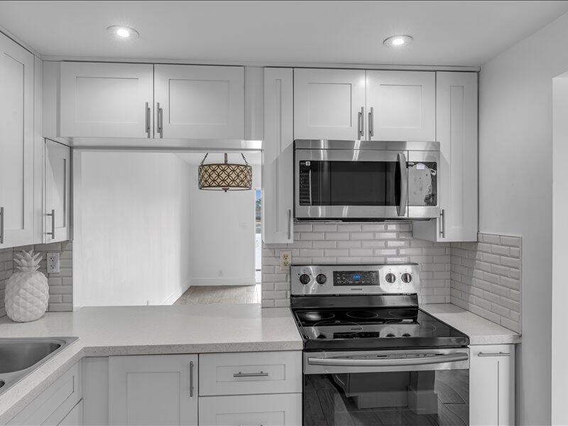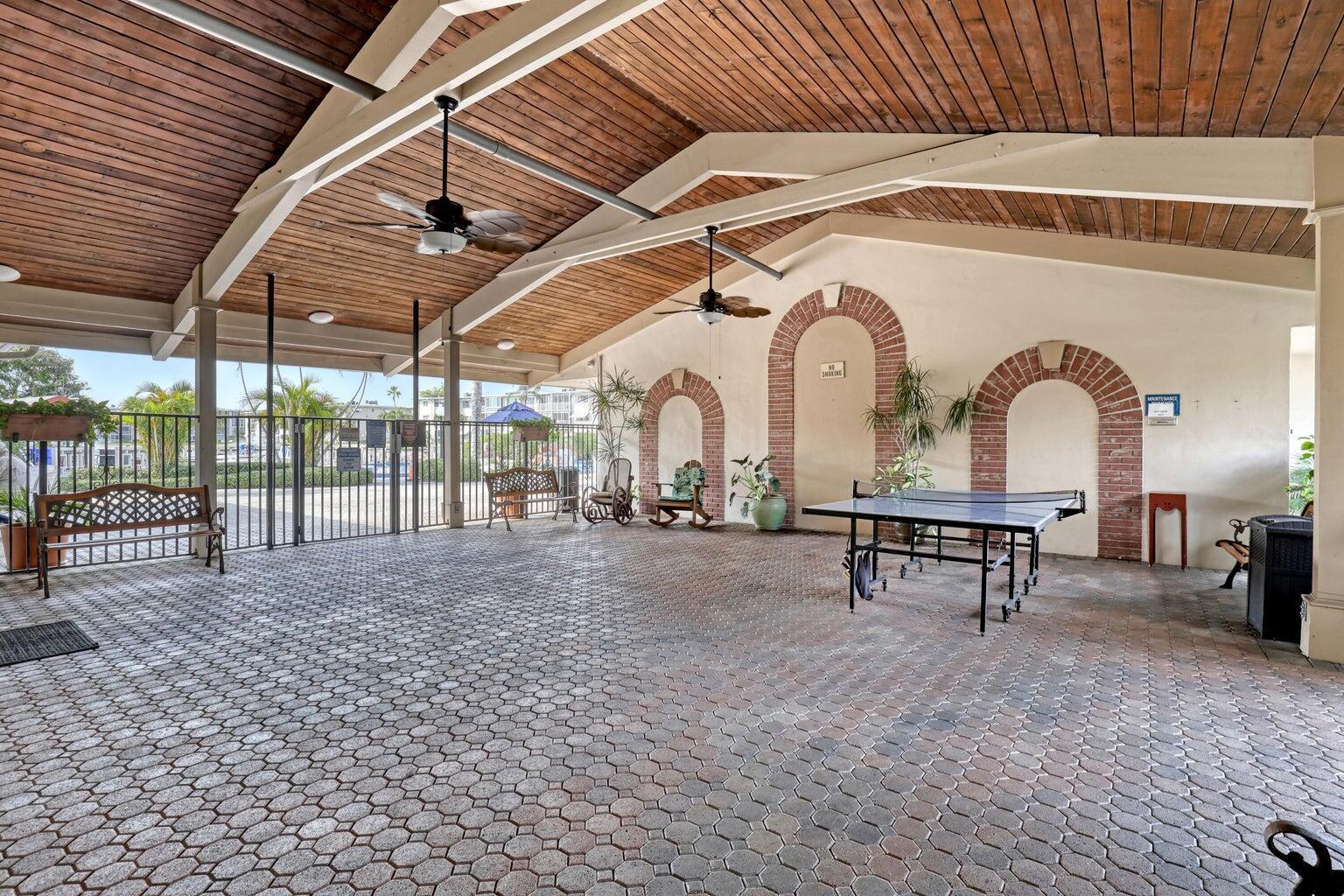 Fully renovated 2-bedroom, 2-bathroom condo in a desirable 55+ community featuring elegant tile flooring throughout and a modern kitchen with shaker-style cabinets and stainless steel appliances. Enjoy peace of mind with full hurricane protection and unwind on your oversized balcony with the serene lake views. The vibrant community offers an abundance of amenities, including two pools, sauna, billiards, library, bocce ball, shuffle board, card room, exercise room, picnic and even a wood shop--perfect for staying active and social. Ideally located just a few miles from the beach and surrounded by shopping, dining, entertainment, and conveniences like Costco and major highways.