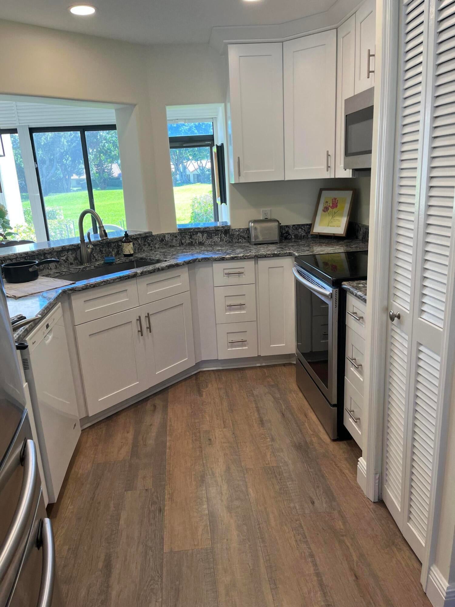 Welcome to Aberdeen, move right in! Newer kitchen with stainless appliances. The following new in 2024, all new flooring throughout, new AC. 5 1/4''baseboards,hurricane shutters, window treatments, entire condo painted, new bathroom vanities, New appliances No popcorn ceilings.Pool, tennis courts, exercise room. Make it home.