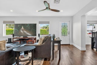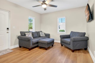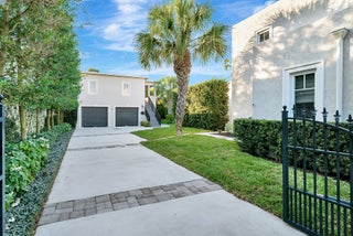 You get the best of both worlds with this classic 1940s Spanish Style home in Prospect Park with old world styling but all the updates for modern living! The main house is spacious with 4 bedrooms and 2 1/2 baths, including a convenient first floor primary suite with walk-in closet, roomy ensuite bath with dual sink vanity and oversized shower, and French Door to private landscaped patio. Unusual for the area, this compound also includes a true two-car garage that is free standing behind the main house with space enough for two cars plus workshop areas. Above the garage is the perfect guest cottage with open living area, 1 bedroom, 1 full bath and a balcony overlooking the backyard. This lot is spacious - over 8500 square feet - with space to play or entertain and plenty of room for a pool.You enter the home into a spacious living area with lovely, engineered hardwood floors throughout and a grand fireplace with stately mantel. Amazing layout for entertaining with a true formal dining room right off the living room. The kitchen is fully updated with white shaker cabinetry, quartz countertops, stylish tile backsplash and GE stainless steel appliances including range, built-in microwave, dishwasher and French Door refrigerator. For convenience, there is also a powder room and laundry on this level. In addition to the downstairs master suite, there are three additional bedrooms upstairs in the main house and an updated full bath with double sink vanity for extra storage. Collector cars? Or just like to keep your automobiles out of the elements? Unusual for a historic property, you have a large, detached, two-car garage here with separate garage doors and plenty of room for storage or tools or projects behind the area for cars. There is also a laundry room here on this level for guests (in addition to the laundry facilities in the main house). A flight of stairs takes you to a covered balcony above the garage and the entry to the guest cottage with an updated kitchen complete with stainless steel appliances including a dishwasher and shaker style cabinetry with white quartz countertops. The living areas are light and bright, and the guest house has a spacious bedroom with closet. The grounds are gated with electronic access to create an exclusive retreat, and the long drive provides plenty of off-street parking in addition to the garage. Tropical landscaping includes beautiful palms and a lush clusia hedge for privacy. Centrally located in the historic neighborhood of Prospect Park which is north of Antique Row and south of Downtown West Palm Beach, this property is just blocks from coffee shops including Starbucks, Dunkin' and Common Grounds, fine dining at Maison Carlos or Pink Steak, local favorites like Lynora's Kitchen for casual Italian, City Diner, Ana's Killer Empanadas, Celis Juice Bar and Tropical Smokehouse BBQ. There are also multiple gyms and fitness centers, salons, and both Joseph's Classic Market and Publix are nearby for groceries. Convenient to everywhere you want to be - just a few miles to the beach, the airport, the Brightline, downtown West Palm Beach and the world class shopping on Worth Avenue.
