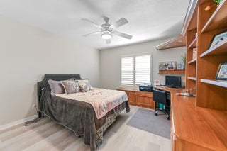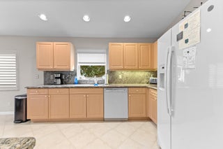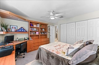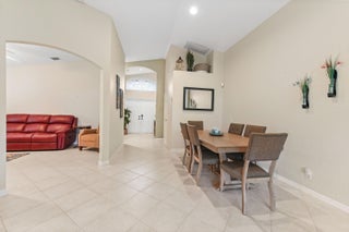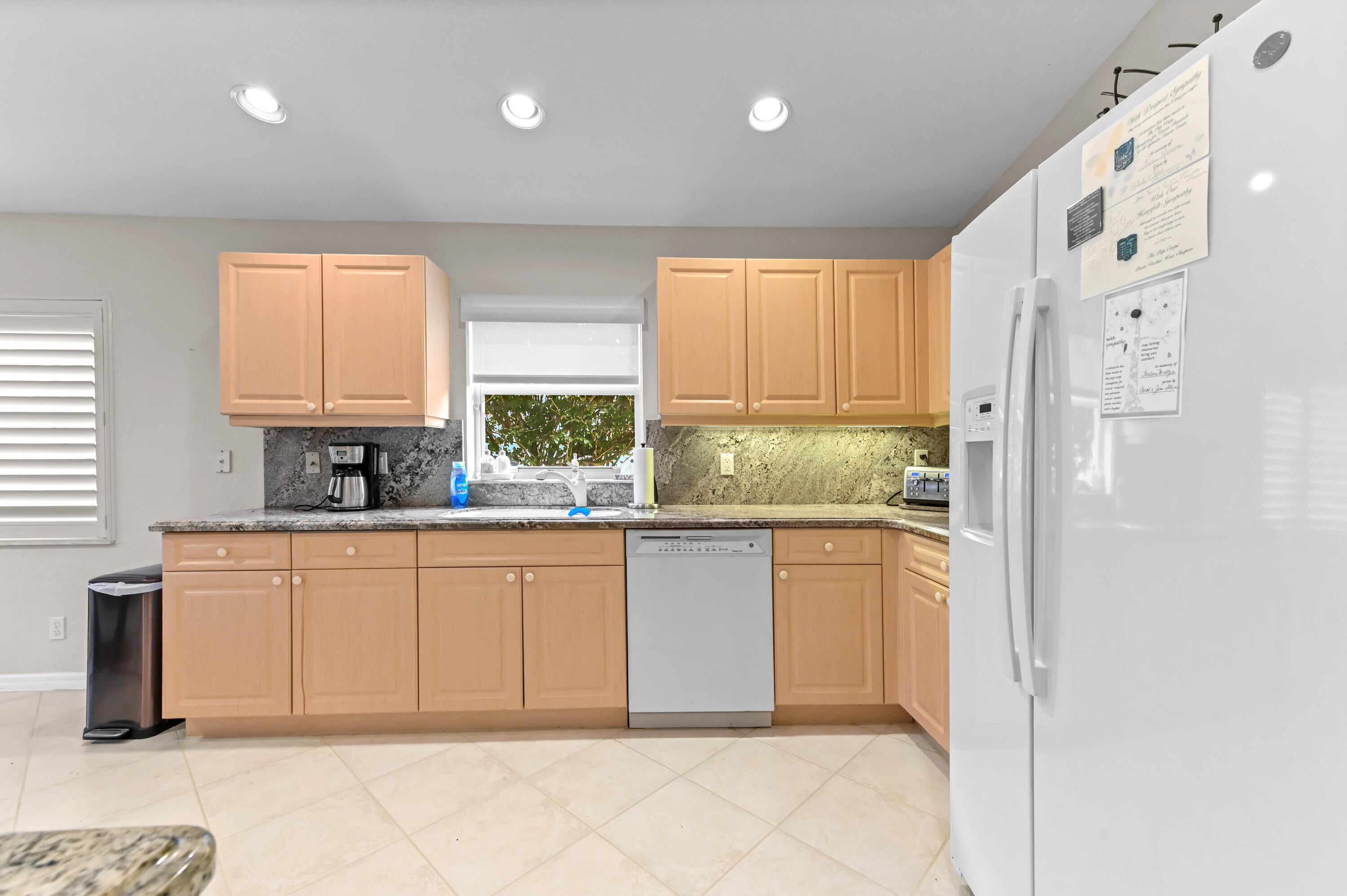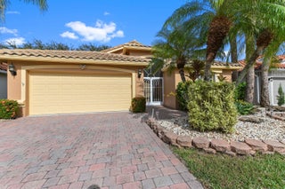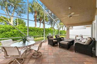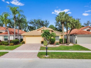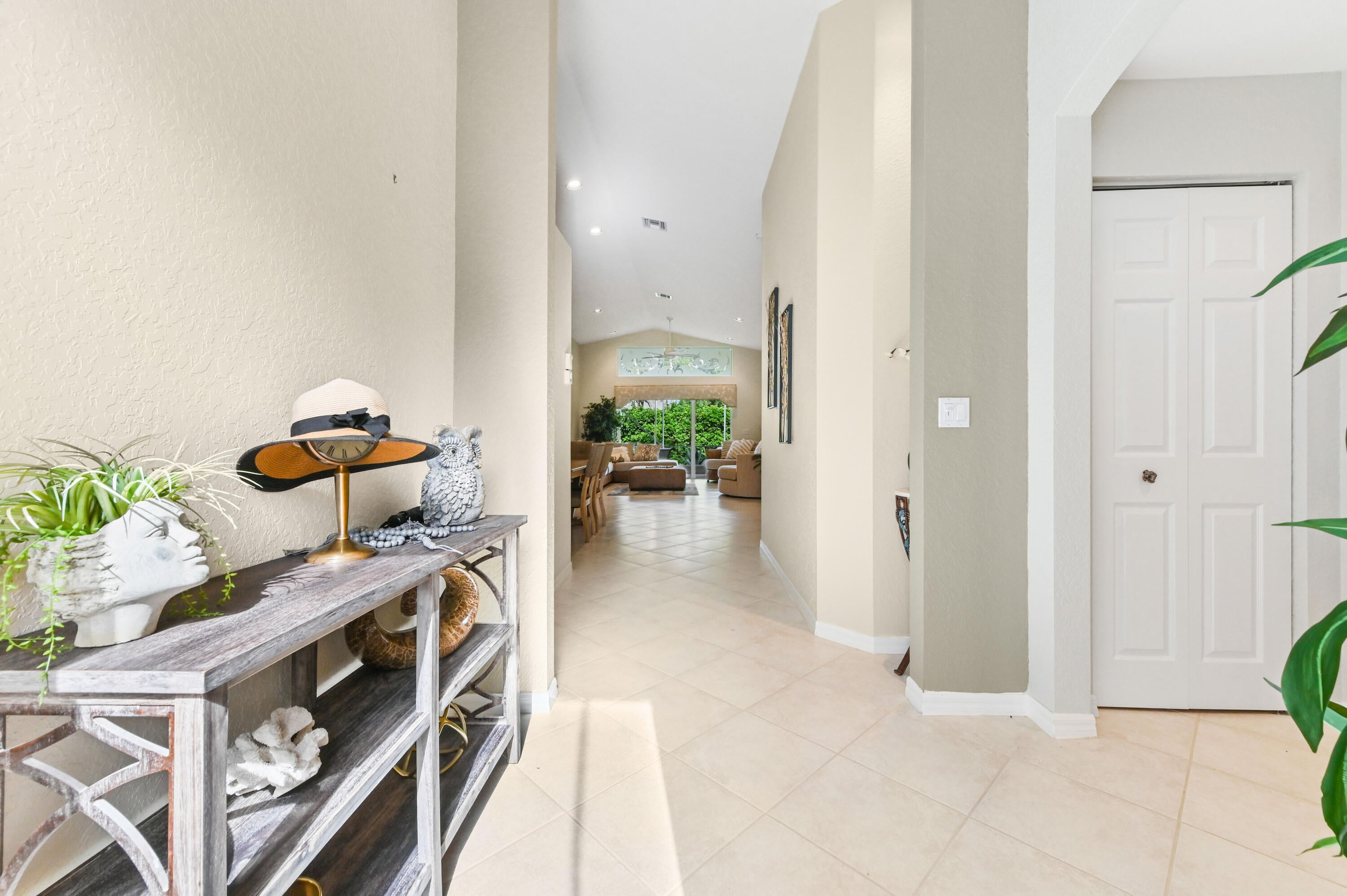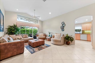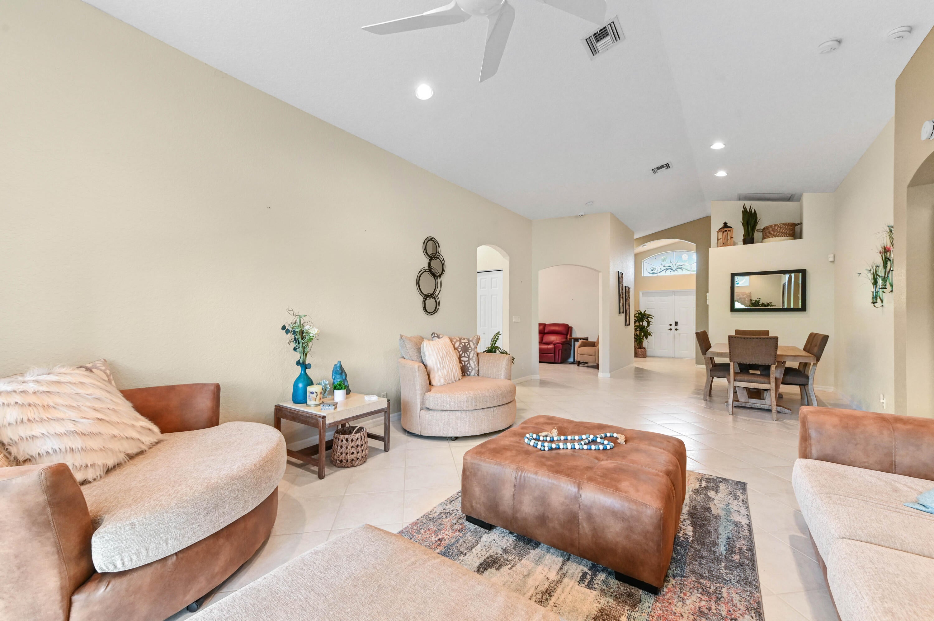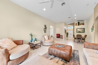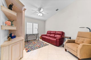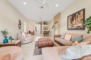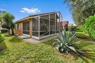 Welcome home to this meticulously maintained sanctuary, where a manicured tropical landscape and paved driveway set the stage for elegant living. Step through the double-door entry into a bright, airy interior defined by soaring vaulted ceilings and pristine diagonal tile flooring that flows effortlessly through the main living areas. The open-concept living and dining room is bathed in natural light, highlighted by a stunning custom etched-glass transom window above the sliding doors that adds a unique touch of artistic flair to the space.The heart of the home is the kitchen, featuring warm wood cabinetry, granite countertops, and a sunny breakfast nook perfect for morning coffee. Retreat to the expansive master suite which offers a generous walk-in closet space. The spa-inspired master bath invites relaxation with a large corner soaking tub, dual vanities, and a separate glass-enclosed shower. A versatile third room, featuring built-in shelving, serves as an ideal den or home office, while a dedicated laundry room with a utility sink adds everyday convenience. Florida living is truly defined by the spectacular outdoor space; step outside to discover a massive, extended screened lanai serving as a true outdoor living room. This private retreat is surrounded by tall, lush privacy hedges and manicured green space, ensuring total seclusion for entertaining or unwinding. Complete with plantation shutters throughout the home for style and shade, this residence offers a perfect blend of comfort and luxury.