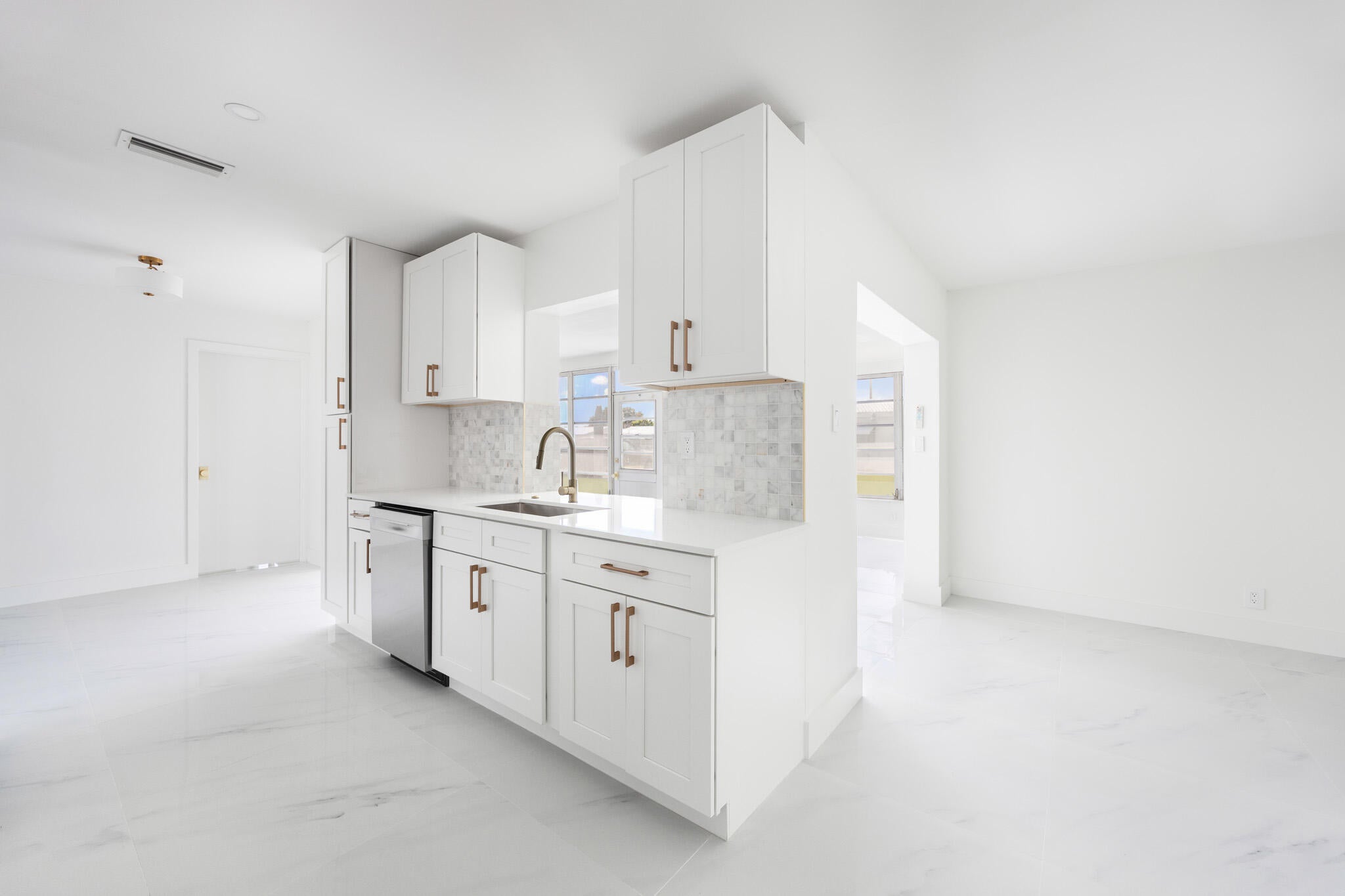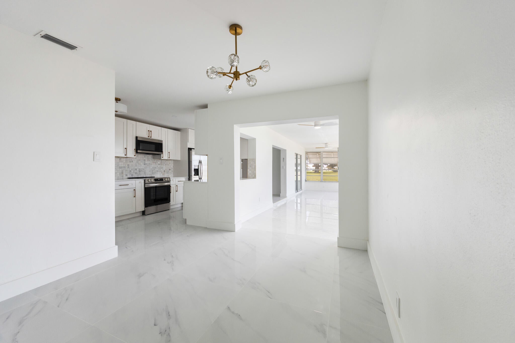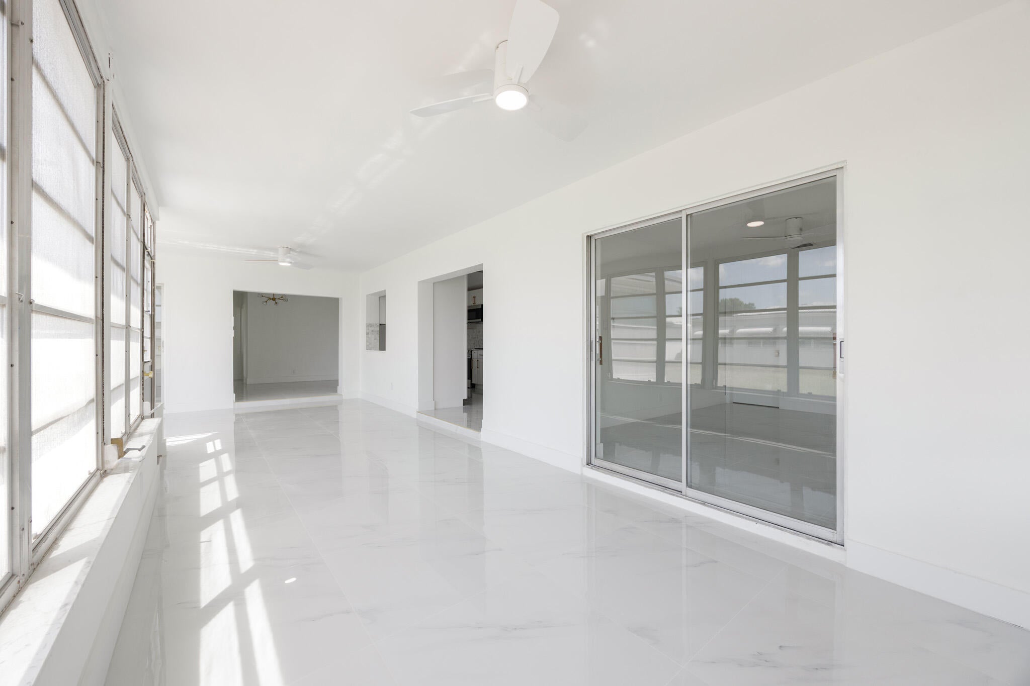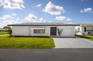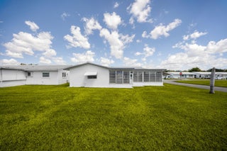 Created with love & attention to detail, this newly renovated 2 bed/ 2 bath home offers a NEW ROOF and beautiful finishes throughout. As soon as you walk into the home you'll enjoy the interior designer's appointed details that shine through lots of natural light like luxury large format flooring porcelain marble look flooring, smooth drywall, quartz & marble surfaces, new appliances, floating vanities, gold accents, a large kitchen and open concept living. And it would not be a true Florida home without a sunroom. This is the largest model in the neighborhood, situated on a prime corner lot just steps away from the pool and community clubhouse. Low monthly HOA, 55+ Community as per HOA, centrally located. Come be impressed. Flood zone X