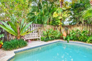 Welcome to 348 Plymouth Road! This home is a rare opportunity to own one of the finest and most authentic Mediterranean Revival properties in the Belaire Historic District. It is ideally located in the highly desirable locale of SoSo in West Palm Beach. This unique home offers unbeatable access to downtown West Palm Beach, Palm Beach International Airport, Antique Row, Worth Avenue, I-95, South Olive Tennis Center, and SoSo's growing collection of restaurants and boutiques.Set in tropical landscaping, this thoughtfully restored residence honors its architectural heritage while offering modern amenities for today's lifestyle. The main house offers three bedrooms and two full bathrooms, with a private primary retreat that is separated from the main living area, allowing exceptional privacy and space. The primary retreat features a dressing room and its own outdoor patio that is perfect for quiet mornings or relaxed evenings. The ensuite bathroom has a view to the tropical gardens surrounding the pool. Original details have been carefully preserved and updated, including beautifully refinished Dade County pine floors and pecky cypress ceilings and beams, which create warmth and authenticity throughout the home. The bedroom closets are unusual for the home's era given their large size. New 2020 roofs and impact-resistant window film on all original windows provide added peace of mind without sacrificing original architectural details. The kitchen is in a Mediterranean style, as well. It has all the amenities for a chef, such as plenty of prep and storage space, a gas range, and pantry, all of which is ideal for both everyday cooking as well as entertaining. The charming cottage is equipped with a full three-piece bathroom, kitchenette, large closet, and central HVAC that is ideal for hosting guests, creating a home office, or accommodating multigenerational living. The tropical backyard is designed for entertaining and relaxation featuring a pool, covered lounge area, pergola-covered dining area, and ample patio space. Combined with the cottage, it is suitable for gatherings of up to 50 guests.