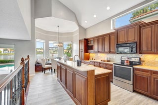 Experience the ultimate in lakeside living with this exquisite property featuring designer finishes throughout. Spacious living areas flow seamlessly into a gourmet kitchen, complete with sleek stainless steel appliances and bench seating that overlooks breathtaking lake views. Step outside and unwind in your private pool, or host memorable gatherings in the fully-equipped outdoor summer kitchen. The master suite is a serene retreat, offering a separate sitting area for ultimate relaxation. Nearly every room showcases stunning views of the expansive lake, creating a tranquil atmosphere throughout the home. 3 bedrooms plus an exquisite Bar/Den room.Located within the prestigious Olympia community, enjoy resort-style amenities and easy access to top shopping, dining, and A+ schools.
