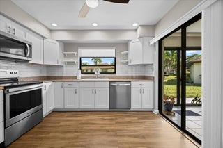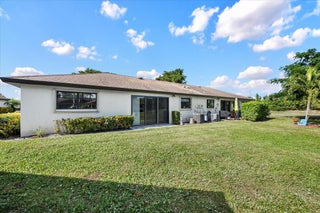 Green Villas is a well-kept community offering resort-style amenities. This spacious and well-maintained home features a functional floor plan with comfortable living and dining areas designed for everyday living. The kitchen offers ample cabinet and counter space and opens to the main living areas for an easy flow. An enclosed Florida room with triple impact sliders extends the living space and allows for year-round enjoyment. Impact windows are installed in the front living room and primary bedroom and are complemented by plantation shutters for light control and privacy, with accordion shutters throughout the remainder of the home. Bathrooms have been updated, including glass shower doors. The primary bedroom features a walk-in closet and private ensuite bath.
