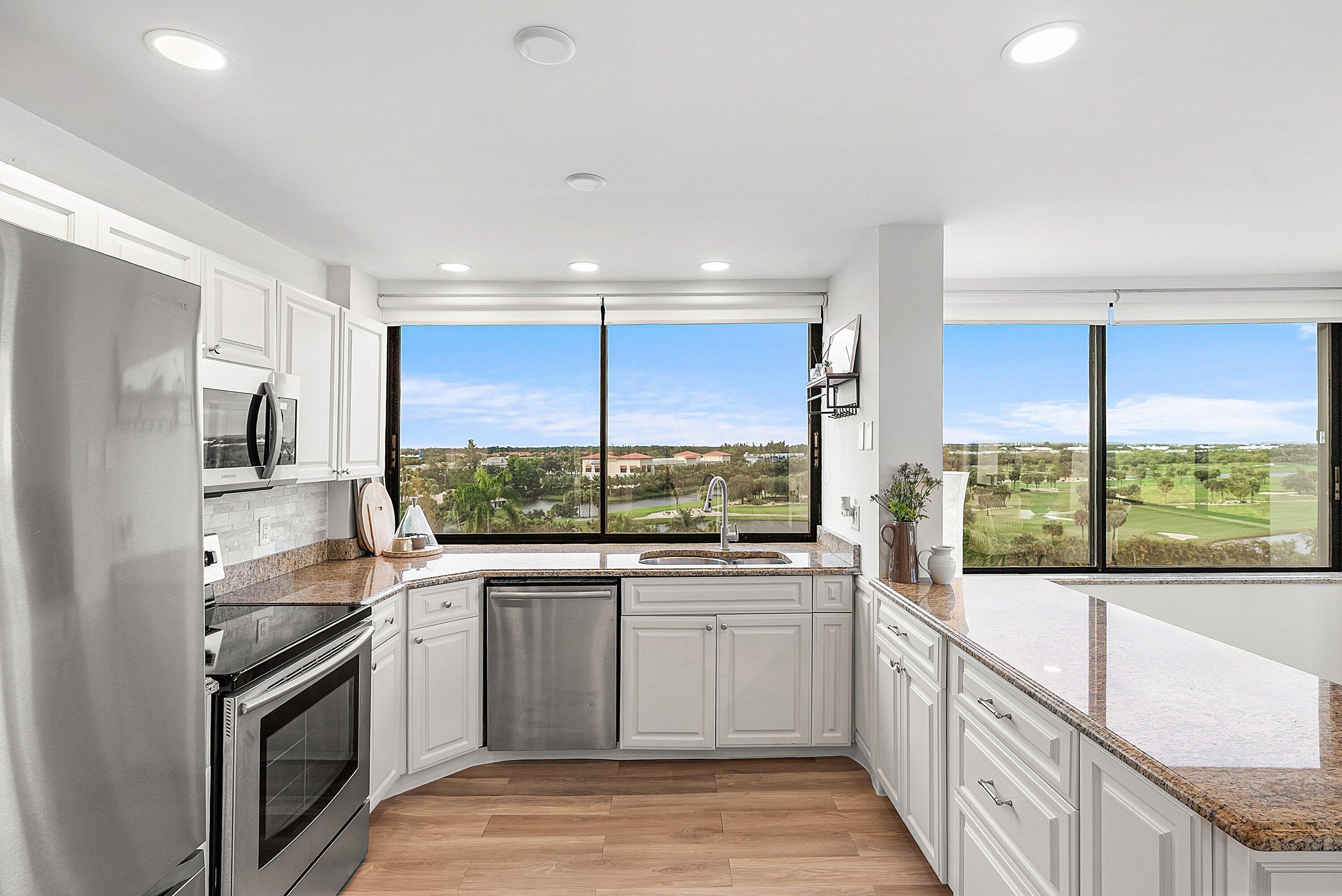 Sunlit Corner Unit with sweeping Golf Course Views in a highly sought-after West Palm Beach location. Large windows fill this Home with Natural Light, complemented by Updated Flooring, Renovated Bathrooms & Window Films for added comfort & Energy Efficiency. Both Baths & the Balcony showcase real Travertine Stone for timeless style & durability. The Kitchen features SS Appliances. Convenient Laundry Room with Washer/Dryer located just next to the unit. Minutes to Tanger Outlets, Clematis farmers market, Whole Foods, downtown WPB, shopping, dining, major highways & beaches. Perfect as a Primary Home, Seasonal Escape or Investment, this unit stands out for its Views, Location & Quality Finishes.