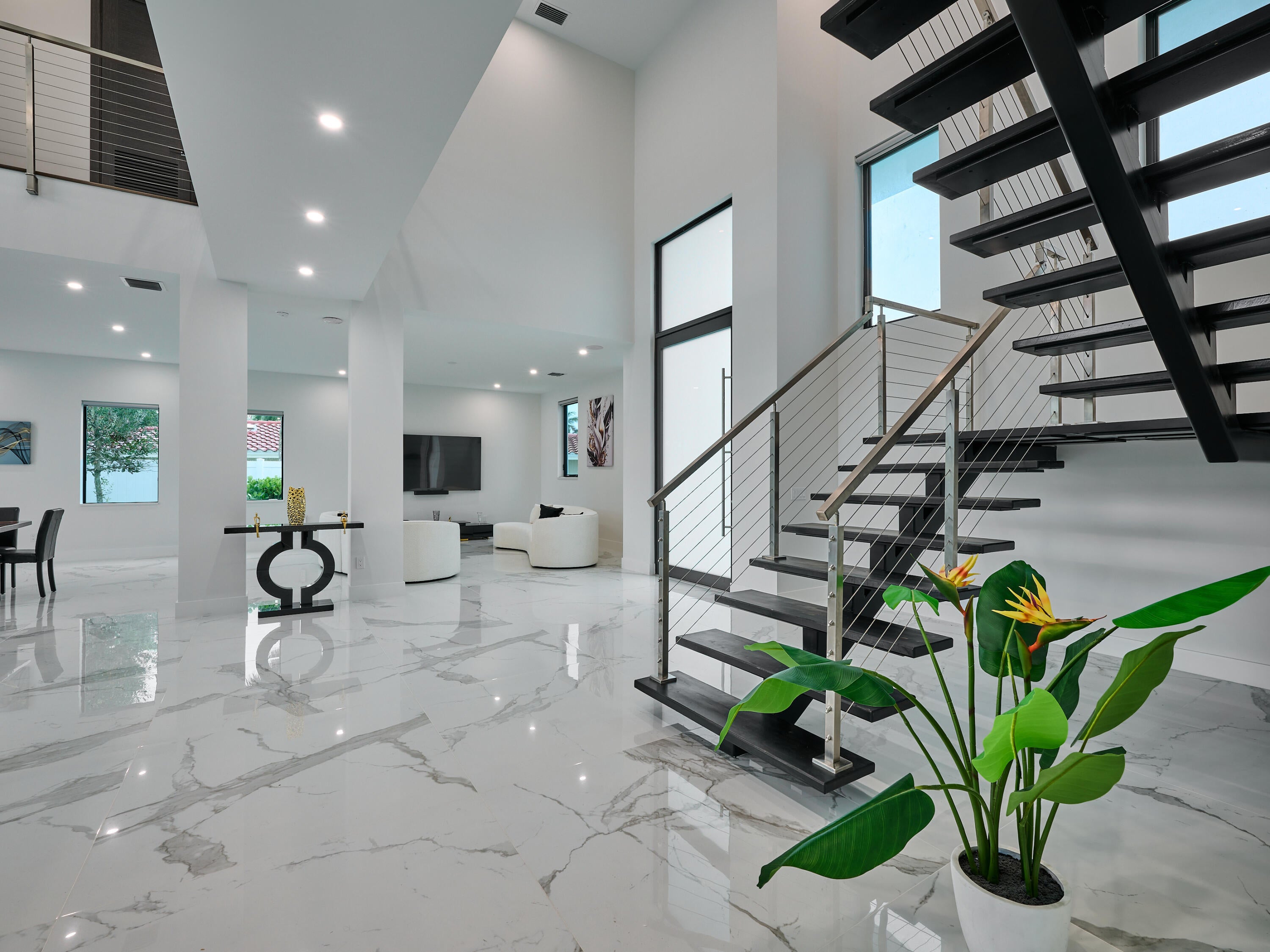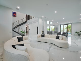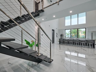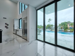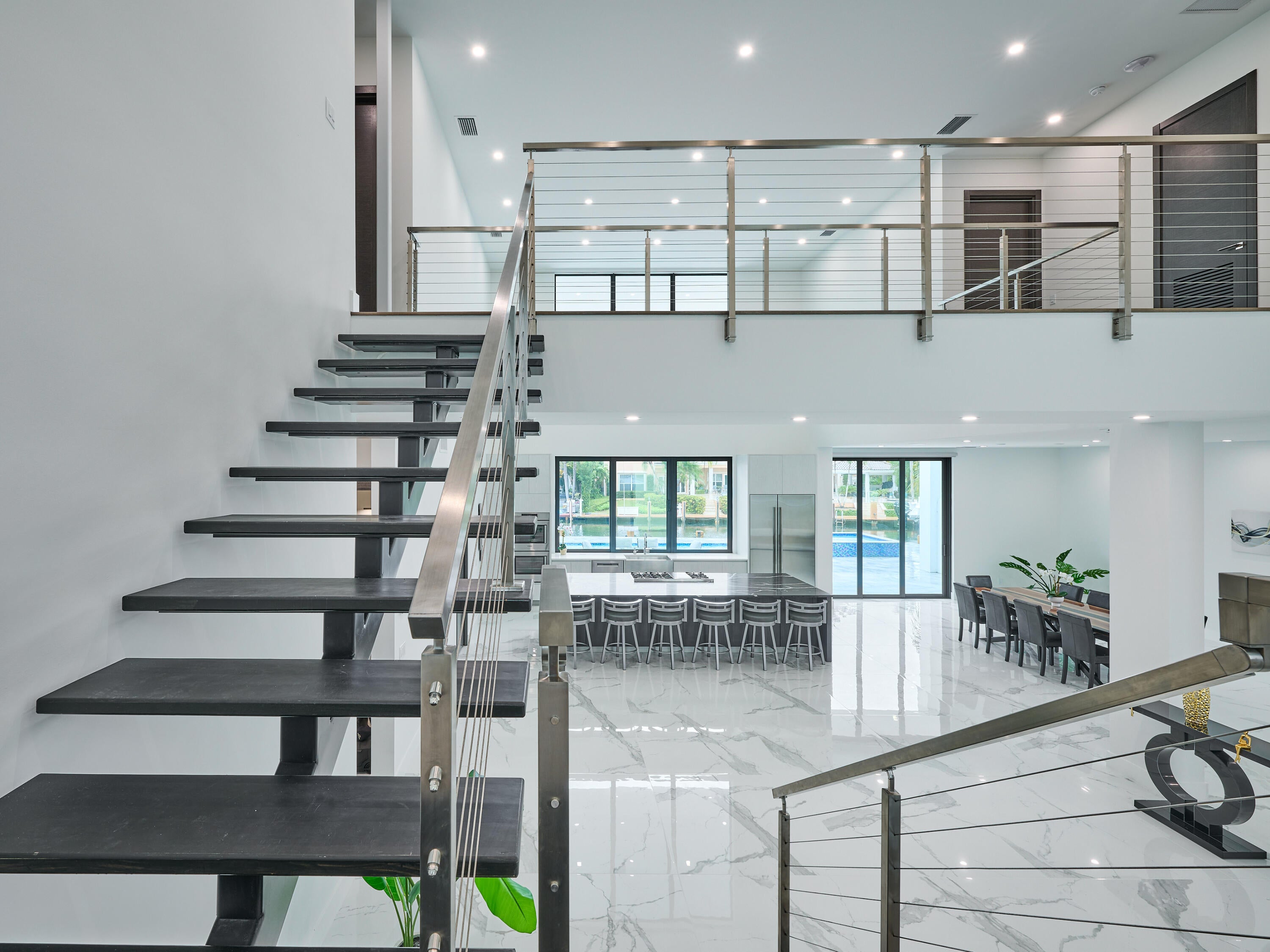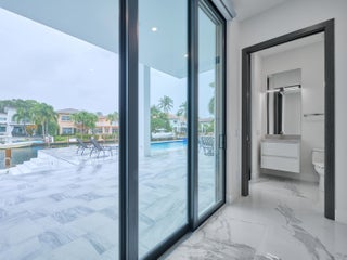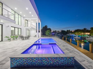 This exquisite, just-completed 2025 modern waterfront masterpiece offers turnkey coastal luxury in the heart of South Florida. Spanning approximately 4,500 square feet over two sunlit levels, the home delivers breathtaking ocean-access water views from nearly every room, seamlessly integrating indoor and outdoor spaces for a private resort-like experience. Soaring ceilings, expansive floor-to-ceiling impact-resistant glass, and automated motorized shades flood the interiors with abundant natural light. The gourmet chef's kitchen serves as the home's centerpiece, boasting an oversized double-slab black island, top-tier professional appliances, a gas cooktop, and elegant design perfect for intimate meals or large-scale entertaining. Upstairs, warm hardwood flooring leads to the luxuriousprimary suite, complete with a private sitting area, spa-like bathroom featuring dual sinks, dual showers, a lavish free-standing tub, and a sophisticated bidet; an expansive walk-in closet; and a covered balcony overlooking the canal. All generously sized bedrooms feature en-suite bathrooms and walk-in closets, with two opening onto private balconies showcasing wide-water views. On the main floor, enjoy a convenient cabana bath ideal for pool guests and a stylish powder room. The additional bedrooms each include private full baths with built-in tubs. A dedicated mudroom comes fully equipped with washer, dryer, utility sink, and ample cabinetry, offering excellent organization and the potential for conversion into maid's or nanny's quarters. Transition effortlessly to expansive covered terraces with pre-plumbed space for a summer kitchen, alongside a stunning infinity-edge pool and spa that blend harmoniously with the horizon. Boating enthusiasts will appreciate the brand-new elevated 80-foot deepwater dock, complete with full electric service and no fixed bridges, providing direct Intracoastal and open-ocean access. The crowning jewel, a spacious rooftop terrace, roughed-in and ready for customization promises unparalleled 360-degree views and an idyllic setting for unforgettable sunset soirées. This home is engineered for ultimate reliability and convenience, featuring a whole-house backup gas-powered generator, sustainable solar panels, and a premium Sonos sound system throughout the interior and pool area. Smart home integration places control at your fingertips via smartphone, managing the pool, spa, lighting, climate, and more. Comprehensive security is ensured with a full camera system surrounding the property. Uncompromising in quality and design, this residence defines the pinnacle of contemporary South Florida waterfront living and is ready for immediate enjoyment.