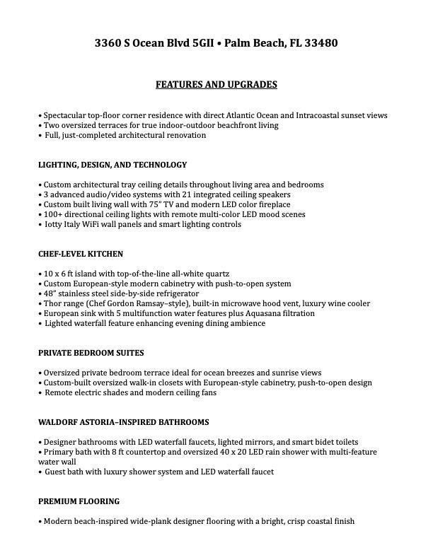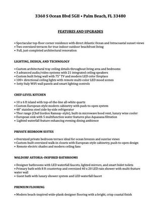 Set high above the Atlantic shoreline with sweeping views from the ocean to the Intracoastal, this newly completed oceanfront residence delivers refined modern waterfront living. Highly coveted southern exposure fills the home with sunlit interiors where walls of glass open to two oversized terraces for seamless indoor-outdoor living. The chef kitchen features a 10x6 island, custom cabinetry, premium appliances and 5 feature culinary sink with advanced water filtration. Two serene bedrooms offer custom walk-in closets and Waldorf Astoria inspired bathrooms. Smart features include 3 immersive audio/video systems plus a spectacular LED lighting experience that transforms the home for entertaining. This is luxury turnkey living that is effortless & truly unforgettable. See Feature Sheet...