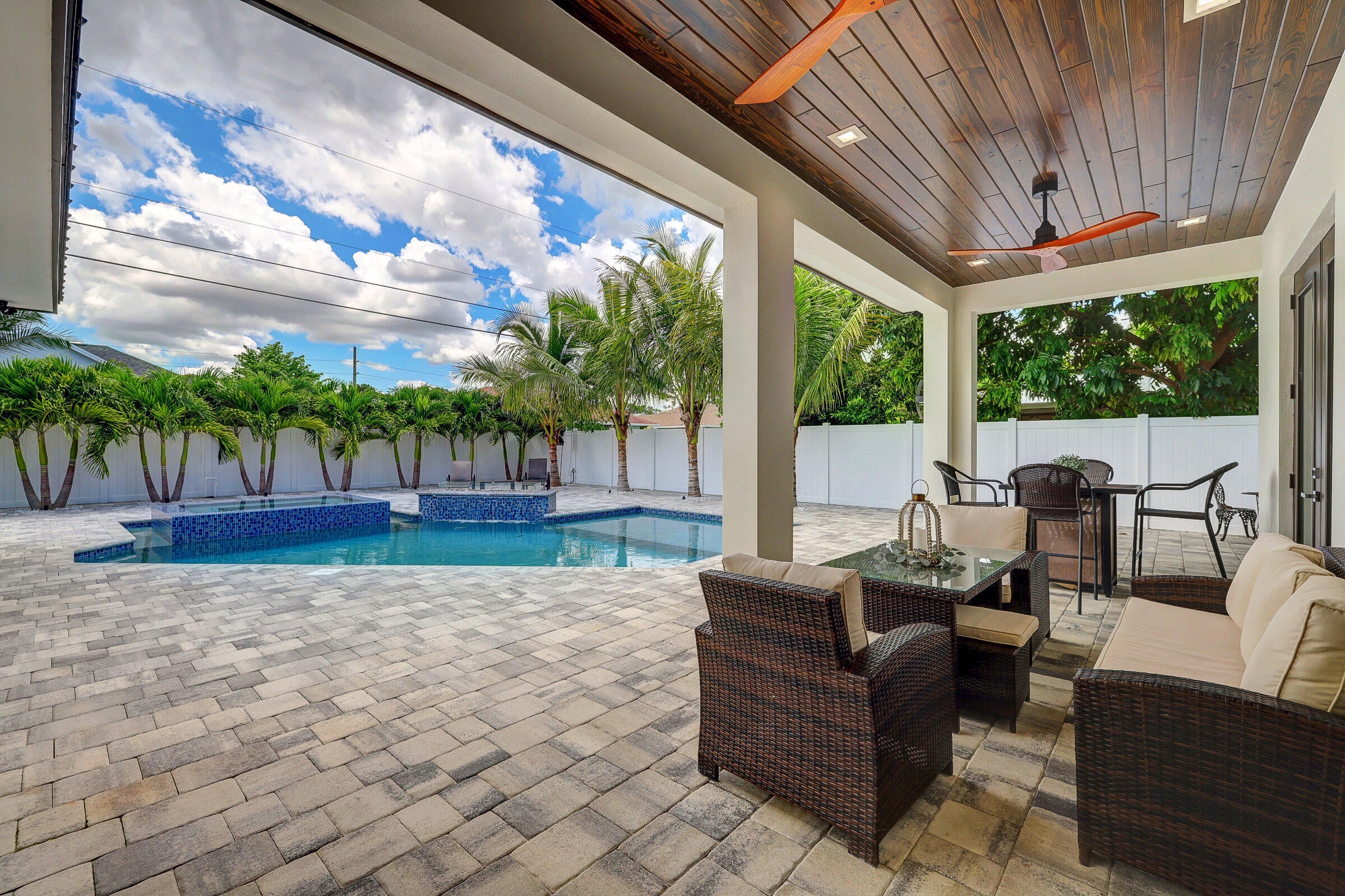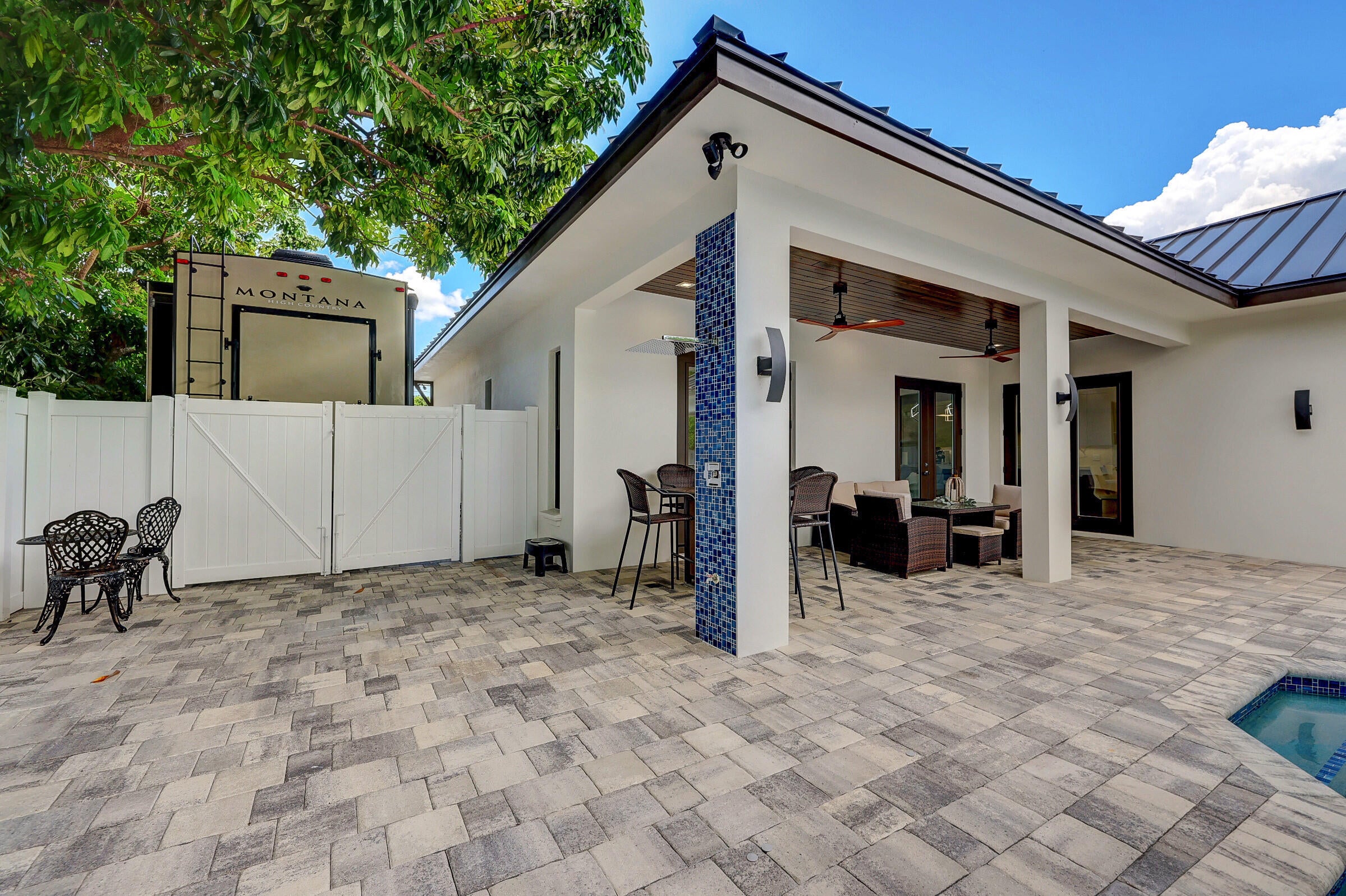 Auto Sprinkler, Covered Patio, Custom Lighting, Fence, Outdoor Shower, Cabana