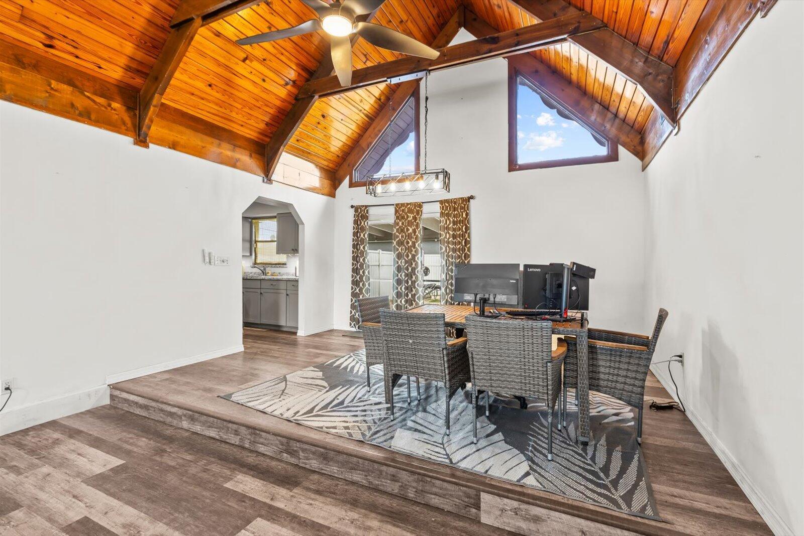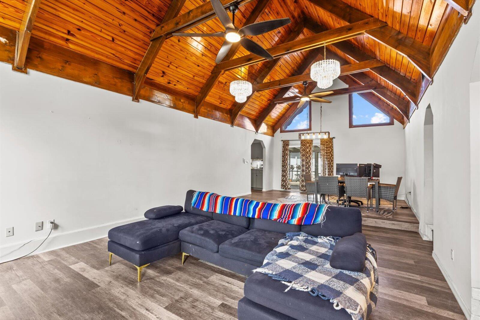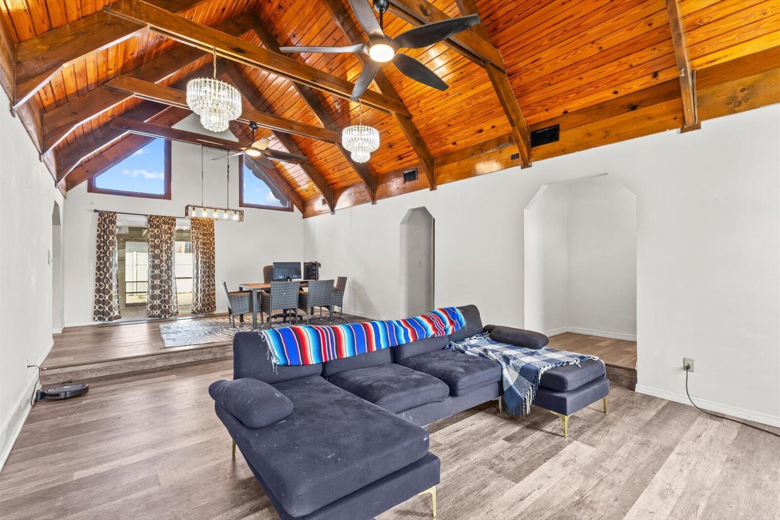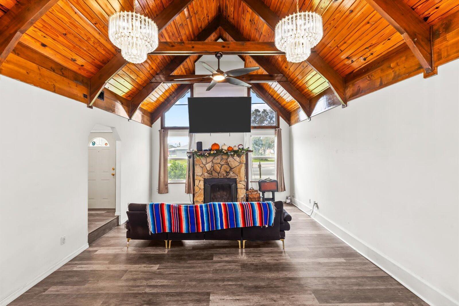 This beautiful 4 bedroom 2 bath pool home is ready for its new owner. The main living area features an appealing open concept highlighted by vaulted cedar ceilings. Enjoy relaxing in your heated pool with dual spas. Across the street is the United States Submarine Veterans Park, offering a scenic walking path around the lake and playground. A/C-'23 wtr htr-'23 elc-'22 pool htr-'22 roof-'15